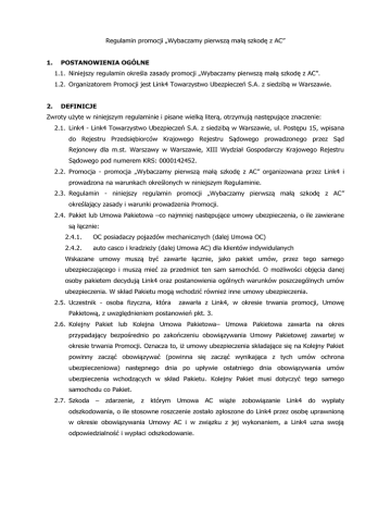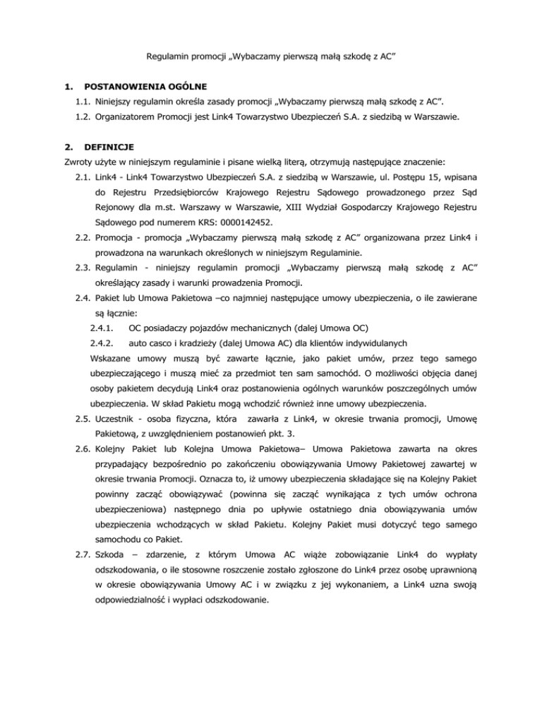 Regulamin promocji „Wybaczamy pierwszą małą szkodę z AC” 1. POSTANOWIENIA OGÓLNE 1.1. Niniejszy regulamin określa zasady promocji „Wybaczamy pierwszą małą szkodę z AC”. 1.2. Organizatorem Promocji jest Link4 Towarzystwo Ubezpieczeń S.A. z siedzibą w Warszawie. 2. DEFINICJE Zwroty użyte w niniejszym regulaminie i pisane wielką literą, otrzymują następujące znaczenie: 2.1. Link4 - Link4 Towarzystwo Ubezpieczeń S.A. z siedzibą w Warszawie, ul. Postępu 15, wpisana do Rejestru Przedsiębiorców Krajowego Rejestru Sądowego prowadzonego przez Sąd Rejonowy dla m.st. Warszawy w Warszawie, XIII Wydział Gospodarczy Krajowego Rejestru Sądowego pod numerem KRS: 0000142452. 2.2. Promocja - promocja „Wybaczamy pierwszą małą szkodę z AC” organizowana przez Link4 i prowadzona na warunkach określonych w niniejszym Regulaminie. 2.3. Regulamin - niniejszy regulamin promocji „Wybaczamy pierwszą małą szkodę z AC” określający zasady i warunki prowadzenia Promocji. 2.4. Pakiet lub Umowa Pakietowa –co najmniej następujące umowy ubezpieczenia, o ile zawierane są łącznie: 2.4.1. OC posiadaczy pojazdów mechanicznych (dalej Umowa OC) 2.4.2. auto casco i kradzieży (dalej Umowa AC) dla klientów indywidulanych Wskazane umowy muszą być zawarte łącznie, jako pakiet umów, przez tego samego ubezpieczającego i muszą mieć za przedmiot ten sam samochód. O możliwości objęcia danej osoby pakietem decydują Link4 oraz postanowienia ogólnych warunków poszczególnych umów ubezpieczenia. W skład Pakietu mogą wchodzić również inne umowy ubezpieczenia. 2.5. Uczestnik - osoba fizyczna, która zawarła z Link4, w okresie trwania promocji, Umowę Pakietową, z uwzględnieniem postanowień pkt. 3. 2.6. Kolejny Pakiet lub Kolejna Umowa Pakietowa– Umowa Pakietowa zawarta na okres przypadający bezpośrednio po zakończeniu obowiązywania Umowy Pakietowej zawartej w okresie trwania Promocji. Oznacza to, iż umowy ubezpieczenia składające się na Kolejny Pakiet powinny zacząć obowiązywać (powinna się zacząć wynikająca z tych umów ochrona ubezpieczeniowa) następnego dnia po upływie ostatniego dnia obowiązywania umów ubezpieczenia wchodzących w skład Pakietu. Kolejny Pakiet musi dotyczyć tego samego samochodu co Pakiet. 2.7. Szkoda – zdarzenie, z którym Umowa AC wiąże zobowiązanie Link4 do wypłaty odszkodowania, o ile stosowne roszczenie zostało zgłoszone do Link4 przez osobę uprawnioną w okresie obowiązywania Umowy AC i w związku z jej wykonaniem, a Link4 uzna swoją odpowiedzialność i wypłaci odszkodowanie. 3. WARUNKI UCZESTNICTWA W Promocji bierze udział każdy Uczestnik, który spełnia łącznie następujące warunki: 3.1. w okresie trwania Promocji zawrze z Link4 Umowę Pakietową. Przez zawarcie Umowy Pakietowej w rozumieniu niniejszego Regulaminu uznaje się: 3.1.1. złożenie przez przedstawiciela Link4 i Użytkownika zgodnych oświadczeń woli w przedmiocie zawarcia umów ubezpieczenia wchodzących w skład Pakietu lub 3.1.2. zaakceptowanie przez Uczestnika ofert umów ubezpieczenia wchodzących w skład Pakietu uzyskanych za pośrednictwem serwisu internetowego, 3.1.3. umowę w której okres ochrony ubezpieczeniowej rozpoczyna się w dniu objętym niniejszą Promocją. 3.2. w okresie obowiązywania Umowy Pakietowej będzie terminowo opłacał wszystkie należne Link4 składki (zgodnie z uzgodnionym harmonogramem płatności); 3.3. Właściciele i Współwłaściciele oraz Główni Użytkownicy ubezpieczonego pojazdu posiadają od co najmniej pełnych 3 lat, licząc do dnia zawarcia Umowy Pakietowej, umowy ubezpieczenia Auto Casco zawarte w dowolnym zakładzie ubezpieczeń, co znajduje potwierdzenie w rejestrze umów ubezpieczenia prowadzonym przez Ubezpieczeniowy Fundusz Gwarancyjny; 3.4. Właściciele i Współwłaściciele oraz Główni Użytkownicy ubezpieczonego pojazdu nie mieli w ostatnich 3 latach, licząc do dnia zawarcia Umowy Pakietowej, szkody z ubezpieczenia Auto Casco, potwierdzonej w rejestrze szkód ubezpieczeniowych prowadzonym przez Ubezpieczeniowy Fundusz Gwarancyjny; 3.5. W okresie obowiązywania Umowy AC Link4 jednokrotnie wypłaci Uczestnikowi odszkodowanie z tytułu Szkody, które nie będzie przekraczało 2500 zł (słownie: dwa tysiące pięćset złotych). Dla obliczenia wysokości odszkodowania bierze się pod uwagę kwotę faktycznej wypłaty, tj. wartość odszkodowania po potrąceniach wynikających z zawartej Umowy AC. Każde wyższe odszkodowanie lub druga Szkoda z danej Umowy AC eliminują Uczestnika z udziału w promocji. Jeżeli postępowanie likwidacyjne nie zostanie zakończone przez Link4 do dnia zakończenia danej Umowy AC, dla obliczenia wysokości odszkodowania bierze się pod uwagę wszystkie wypłacone w ramach danej szkody kwoty powiększone o rezerwę założoną przez Link4 na przyszłe wypłaty, zgodnie z obowiązującymi w tym zakresie przepisami prawa; 3.6. po upływie terminu obowiązywania Umowy Pakietowej, wynoszącego 12 miesięcy, zawrze z Link4 Kolejną Umowę Pakietową, dotyczącą tego samego samochodu, którego dotyczyła Umowa Pakietowa. 4. BRAK ZWYŻKI 4.1. Pod warunkiem spełnienia łącznie wszystkich przesłanek określonych w pkt 3 powyżej, przy zawieraniu Kolejnej Umowy Pakietowej, Link4 nie uwzględni Szkody, o której mowa w pkt 3.5. przy kalkulacji zniżki za bezszkodową jazdę czyli zwyżka za Szkodę nie zostanie naliczona. 4.2. Poza nie uwzględnieniem Szkody przy kalkulacji zniżki za bezszkodową jazdę, Kolejna Umowa Pakietowa będzie zawarta na podstawie taryf obowiązujących w dniu jej zawarcia. 4.3. Link4 nie wypłaca równowartości umorzonej zwyżki w gotówce ani w żadnej innej formie niż wskazana powyżej. 5. POSTĘPOWANIE REKLAMACYJNE 5.1. Link4 podlega nadzorowi Komisji Nadzoru Finansowego. 5.2. Uczestnik ma prawo do wniesienia reklamacji do Link4. Reklamacja może być złożona: 5.2.1. W formie pisemnej (doręczona osobiście l