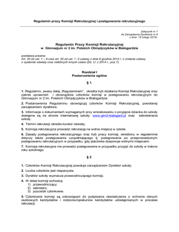 Regulamin pracy Komisji Rekrutacyjnej i postępowania rekrutacyjnego Załącznik nr 1 do Zarządzenia Dyrektora nr 8 z dnia 16 lutego 2015r. Regulamin Pracy Komisji Rekrutacyjnej w Gimnazjum nr 2 im. Polskich Olimpijczyków w Białogardzie podstawa prawna: Art. 20 zb ust. 1 – 9 oraz art. 20 zd ust. 1 -3 ustawy z dnia 6 grudnia 2013 r. o zmianie ustawy o systemie oświaty oraz niektórych innych ustaw (Dz. U. z 2014 r., poz.7). Rozdział I Postanowienia ogólne § 1. 1. Regulamin, zwany dalej „Regulaminem”, określa tryb działania Komisji Rekrutacyjnej oraz zakres uprawnień i obowiązków członków komisji w postępowaniu rekrutacyjnym do Gimnazjum nr 2 im. Polskich Olimpijczyków w Białogardzie. 2. Postanowienia Regulaminu obowiązują członków Komisji Rekrutacyjnej, powołanej zarządzeniem dyrektora. 3. Informacje o dokumentach wymaganych przy wnioskowaniu o przyjęcie dziecka do szkoły dostępne są na stronie internetowej szkoły: www.gim2-bialogard.pl oraz sekretariacie szkoły. 4. Termin rekrutacji określa kurator oświaty. 5. Komisja rekrutacyjna prowadzi rekrutację na wolne miejsca w szkole. 6. Zasady postępowania rekrutacyjnego oraz tryb pracy komisji, określony w regulaminie dotyczy także postępowania uzupełniającego tj. postępowania po przeprowadzonym postępowaniu rekrutacyjnym w przypadku, gdy placówka dysponuje wolnymi miejscami. 7. Komisja rekrutacyjna nie prowadzi postępowania w przypadku przyjęć do szkoły w trakcie roku szkolnego. § 2. 1. Członków Komisji Rekrutacyjnej powołuje zarządzeniem Dyrektor szkoły. 2. Liczba członków jest nieparzysta. 3. Dyrektor szkoły wyznacza przewodniczącego komisji. 4. W skład komisji wchodzą: 1) przewodniczący; 2) sekretarz; 3) pozostali członkowie. 5. Członkowie komisji są zobowiązani do podpisania oświadczenia o ochronie danych osobowych kandydatów i rodziców/opiekunów kandydatów udostępnianych w procesie rekrutacji. Rozdział II Tryb odbywania posiedzeń § 3. 1. Posiedzenie Komisji Rekrutacyjnej odbywa się w terminie określonym w statucie szkoły podanym do publicznej informacji. 2. Przewodniczący nadzwyczajnym. komisji jest uprawniony do zwoływania posiedzeń w trybie 3. Posiedzenie Komisji Rekrutacyjnej zwołuje, prowadzi i nadzoruje Przewodniczący komisji. 4. Udział w posiedzeniach komisji jest obowiązkowy dla wszystkich jej członków. 5. Członkowie komisji mają prawo do wglądu do wszystkich dokumentów związanych z pracą komisji tj. do złożonych wniosków rekrutacyjnych wraz z załącznikami. 6. Posiedzenia komisji są protokołowane. Protokół z posiedzenia zawiera: datę, skład osobowy, ustalenia komisji. Protokół podpisywany jest przez przewodniczącego i członków. 7. Obsługę administracyjno-biurową komisji prowadzi sekretariat szkoły. Rozdział III Zadania i uprawnienia Komisji Rekrutacyjnej § 4. 1. Do zadań Komisji Rekrutacyjnej należy w szczególności: 1) dokonanie merytorycznej oceny wniosków rekrutacyjnych wraz z załącznikami; 2) ustalenie wyników postępowania rekrutacyjnego; 3) podanie do publicznej wiadomości listy kandydatów przyjętych do szkoły, zgodnie z wymogami art. 20 zc ust. 4, wywieszonej w widocznym miejscu w siedzibie placówki, zawierającej imiona i nazwiska kandydatów uszeregowane w kolejności alfabetycznej oraz najniższą liczbę punktów, która uprawniała do przyjęcia. Wzór listy kandydatów przyjętych jest załącznikiem nr 1 do Regulaminu; 4) podanie do publicznej wiadomości listy kandydatów nieprzyjętych do szkoły– załącznik nr 2 do regulaminu; 5) w przypadku mniejszej liczby kandydatów na liście przyjętych podaje się liczbę wolnych miejsc; 6) sporządzenie protokołu postępowania rekrutacyjnego, zgodnie z załącznikiem nr3; 7) sporządzanie, w terminie 5 dni od dnia wystąpienia przez rodzica/opiekuna kandydata, uzasadnień odmowy przyjęcia kandydata. Uzasadnienie odmowy przyjęcia zawiera: przyczyny odmowy, w tym najniższą liczbę punktów, która uprawniała do przyjęcia oraz liczbę punktów, którą kandydat uzyskał w postępowaniu rekrutacyjnym; 8) w przypadku wolnych miejsc w placówce, przeprowadzenie w terminie do końca sierpnia roku szkolnego poprzedzającego rok szkolny, uzupełniającego postępowania rekrutacyjnego według tych samych zasad, w przypadku wolnych miejsc w placówce 2. Członkowie komisji rzetelnie i obiektywnie wykonują powierzone im czynności, kierując się wyłącznie przepisami prawa. § 5. 1.Do obowiązków członków komisji należy w szczególności: 1) uczestniczenie we wszystkich posiedzeniach komisji; 2) czynny udział w pracach komisji; 3) wykonywanie poleceń Przewodniczącego; 4) zapoznanie się z przepisami regulującymi rekrutację do placówki; 5) ochrona danych osobowych kandydatów i rodziców/opiekunów kandydatów; § 6. 1.Do obowiązków Przewodniczącego Komisji Rekrutacyjnej należy w szczególności: 1) zapoznanie członków komisji z regulacjami prawnymi naboru do szkoły; 2) opracowanie harmonogramu posiedzeń komisji oraz porządku zebrań; 3) zawiadomienie członków komisji o terminie i miejscu zebrań komisji; 4) dostarczenie na posiedzenie komisji dokumentacji kandydatów do szkoły, w oparciu o które komisja przeprowadzi postępowanie rekrutacyjne; 5) przewodniczenie zebraniu komisji; 6) zapewnienie obsługi administracyjnej – dostęp do dokumentów, przepisów; zaopatrzenie w sprzęt biurowy i papier; 7) sprawdzenie treści protokołu oraz jego podpisanie; 8) przygotowanie informacji w formie wydruku papierowego, o których mowa w § 4 ust. 1 pkt 3 -5 regulaminu; 9) sporządzenie sprawozdania z przebiegu prac komisji wraz z wnioskami do dalszej pracy. Rozdział IV Porządek pracy Komisji Rekrutacyjnej § 7. 1.Komisja Rekrutacyjnaj pracuje według następującego porządku: 1) prace przygotowawcze polegają na: a) sprawdzeniu pod względem formalnym złożonych wniosków, b) w przypadku braków formalnych wykluczenie ich z po