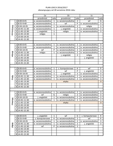 PLANLEKCJI2016/2017 obowiązującyod28września2016roku poniedziałek 1 2 3 4 5 6 7 8 8:00-8:45 8:55-9:40 9:50-10:35 10:45-11:30 11:45-12:30 12:45-13:30 13:50-14:35 14:45-15:30 wtorek 1 2 3 4 5 6 7 8 8:00-8:45 8:55-9:40 9:50-10:35 10:45-11:30 11:45-12:30 12:45-13:30 13:50-14:35 14:45-15:30 e.wczesnoszkolna e.wczesnoszkolna wf religia 1 1 P 1 e.wczesnoszkolna e.wczesnoszkolna e.wczesnoszkolna e.wczesnoszkolna j.angielski 2 2 2 2 2 e.wczesnoszkolna e.wczesnoszkolna e.wczesnoszkolna e.wczesnoszkolna religia j.angielski 3 3 3 3 3 3 środa 1 2 3 4 5 6 7 8 8:00-8:45 8:55-9:40 9:50-10:35 10:45-11:30 11:45-12:30 12:45-13:30 13:50-14:35 14:45-15:30 e.wczesnoszkolna e.wczesnoszkolna e.wczesnoszkolna e.wczesnoszkolna e.wczesnoszkolna 1 1 1 1 1 z.komputerowe wf j.angielski e.wczesnoszkolna e.wczesnoszkolna etyka K P 2 2 2 wf j.angielski e.wczesnoszkolna e.wczesnoszkolna e.wczesnoszkolna P 3 3 3 3 3 czwartek 1 2 3 4 5 6 7 8 8:00-8:45 8:55-9:40 9:50-10:35 10:45-11:30 11:45-12:30 12:45-13:30 13:50-14:35 14:45-15:30 e.wczesnoszkolna wf j.angielski e.wczesnoszkolna 1 G 1 1 e.wczesnoszkolna religia e.wczesnoszkolna e.wczesnoszkolna etyka 2 2 2 2 e.wczesnoszkolna e.wczesnoszkolna e.wczesnoszkolna e.wczesnoszkolna 3 3 3 3 3 piątek 1a 1b 1c przedmiot sala przedmiot sala przedmiot sala e.wczesnoszkolna 1 e.wczesnoszkolna 2 wf G e.wczesnoszkolna 1 wf P e.wczesnoszkolna 3 e.wczesnoszkolna 1 e.wczesnoszkolna 2 religia 3 e.wczesnoszkolna 1 j.angielski 2 e.wczesnoszkolna 3 j.angielski 1 religia 2 e.wczesnoszkolna 3 religia 1 1 2 3 4 5 6 7 8 8:00-8:45 8:55-9:40 9:50-10:35 10:45-11:30 11:45-12:30 12:45-13:30 13:50-14:35 14:45-15:30 j.angielski z.komputerowe e.wczesnoszkolna e.wczesnoszkolna wf 1 K 1 1 P wf e.wczesnoszkolna e.wczesnoszkolna e.wczesnoszkolna e.wczesnoszkolna G 2 2 2 2 z.komputerowe wf e.wczesnoszkolna j.angielski K P 3 3 PLANLEKCJI2016/2017 obowiązującyod28września2016roku poniedziałek 1 2 3 4 5 6 7 8 8:00-8:45 8:55-9:40 9:50-10:35 10:45-11:30 11:45-12:30 12:45-13:30 13:50-14:35 14:45-15:30 wtorek 1 2 3 4 5 6 7 8 8:00-8:45 8:55-9:40 9:50-10:35 10:45-11:30 11:45-12:30 12:45-13:30 13:50-14:35 14:45-15:30 e.wczesnoszkolna j.angielski e.wczesnoszkolna e.wczesnoszkolna wf 4 4 4 4 G e.wczesnoszkolna e.wczesnoszkolna j.angielski e.wczesnoszkolna wf 5 5 5 5 P e.wczesnoszkolna wf religia e.wczesnoszkolna e.wczesnoszkolna etyka 20 G 20 20 20 religia e.wczesnoszkolna e.wczesnoszkolna e.wczesnoszkolna e.wczesnoszkolna 6 6 6 6 6 e.wczesnoszkolna z.komputerowe e.wczesnoszkolna e.wczesnoszkolna j.angielski 11 K 11 11 11 6 8:00-8:45 8:55-9:40 9:50-10:35 10:45-11:30 11:45-12:30 12:45-13:30 13:50-14:35 14:45-15:30 e.wczesnoszkolna e.wczesnoszkolna e.wczesnoszkolna wf z.komputerowe religia 4 4 4 P K 4 religia z.komputerowe e.wczesnoszkolna 5 K 5 e.wczesnoszkolna e.wczesnoszkolna e.wczesnoszkolna religia j.angielski 20 e.wczesnoszkolna 20 religia 20 e.wczesnoszkolna 20 basen 20 6 6 6 środa 1 2 3 4 5 6 7 8 wf e.wczesnoszkolna e.wczesnoszkolna e.wczesnoszkolna e.wczesnoszkolna G 11 11 11 11 czwartek 1 2 3 4 5 6 7 8 8:00-8:45 8:55-9:40 9:50-10:35 10:45-11:30 11:45-12:30 12:45-13:30 13:50-14:35 14:45-15:30 e.wczesnoszkolna e.wczesnoszkolna e.wczesnoszkolna j.angielski 4 4 4 4 e.wczesnoszkolna e.wczesnoszkolna religia e.wczesnoszkolna e.wczesnoszkolna 5 5 5 5 5 e.wczesnoszkolna 20 z.komputerowe e.wczesnoszkolna 20 e.wczesnoszkolna wf P e.wczesnoszkolna e.wczesnoszkolna 20 e.wczesnoszkolna K 6 6 6 e.wczesnoszkolna e.wczesnoszkolna j.angielski e.wczesnoszkolna 11 11 11 11 piątek 2a 2b 2c 2d 2e przedmiot sala przedmiot sala przedmiot sala przedmiot sala przedmiot sala e.wczesnoszkolna 4 e.wczesnoszkolna 5 j.angielski 20 e.wczesnoszkolna 6 e.wczesnoszkolna 11 e.wczesnoszkolna 4 e.wczesnoszkolna 5 z.komputerowe K j.angielski 6 religia 11 e.wczesnoszkolna 4 e.wczesnoszkolna 5 e.wczesnoszkolna 20 wf G e.wczesnoszkolna 11 wf G e.wczesnoszkolna 20 e.wczesnoszkolna 6 basen basen j.angielski 5 e.wczesnoszkolna 20 e.wczesnoszkolna 6 etyka K 1 2 3 4 5 6 7 8 8:00-8:45 8:55-9:40 9:50-10:35 10:45-11:30 11:45-12:30 12:45-13:30 13:50-14:35 14:45-15:30 religia e.wczesnoszkolna e.wczesnoszkolna e.wczesnoszkolna 4 4 4 4 e.wczesnoszkolna e.wczesnoszkolna e.wczesnoszkolna e.wczesnoszkolna 5 5 5 5 e.wczesnoszkolna 20 j.angielski e.wczesnoszkolna 20 e.wczesnoszkolna e.wczesnoszkolna 20 wf e.wczesnoszkolna basen e.wczesnoszkolna 6 6 P 6 6 wf religia e.wczesnoszkolna e.wczesnoszkolna e.wczesnoszkolna P 11 11 11 11 basen PLANLEKCJI2016/2017 obowiązującyod28września2016roku poniedziałek 1 2 3 4 5 6 7 8 8:00-8:45 8:55-9:40 9:50-10:35 10:45-11:30 11:45-12:30 12:45-13:30 13:50-14:35 14:45-15:30 wtorek 1 2 3 4 5 6 7 8 8:00-8:45 8:55-9:40 9:50-10:35 10:45-11:30 11:45-12:30 12:45-13:30 13:50-14:35 14:45-15:30 środa 1 2 3 4 5 6 7 8 8:00-8:45 8:55-9:40 9:50-10:35 10:45-11:30 11:45-12:30 12:45-13:30 13:50-14:35 14:45-15:30 czwartek 1 2 3 4 5 6 7 8 8:00-8:45 8:55-9:40 9:50-10:35 10:45-11:30 11:45-12:30 12:45-13:30 13:50-14:35 14:45-15:30 piątek 3a przedmiot 1 2 3 4 5 6 7 8 8:00-8:45 8:55-9:40 9:50-10:35 10:45-11:30 11:45-12:30 12:45-13:30 13:50-14:35 14:45-15:30 e.wczesnoszkolna e.wczesnoszkolna e.wczesnoszkolna wf e.wczesnoszkolna j.angielski e.wczesnoszkolna e.wczesnoszkolna z.komputerowe e.wczesnoszkolna e.wczesnoszkolna wf e.wczesnoszkolna sala 4 4 4 G 3b przedmiot etyka etyka j.angielski z.komputerowe e.wczesnoszkolna e.wczesnoszkolna wf 5 K 5 5 G 4 4 4 4 e.wczesnoszkolna e.wczesnoszkolna e.wczesnoszkolna e.wczesnoszkolna 5 5 5 5 K 4 4 P 4 e.wczesnoszkolna wf j.angielski e.wczesnoszkolna e.wczesnoszkolna e.wczesnoszkolna 5 P 5 5 5 5 e.wczesnoszkolna e.wczesnoszkolna wf e.wczesnoszkolna j.angielski e.wczesnoszkolna 6 P 4 4 4 religia e.wczesnoszkolna e.wczesnoszkolna e.wczesnoszkolna P 5 5 5 5 5 5 5 sala 20 6 e.wczesnoszkolna 22 e.wczesnoszkolna 22 j.angielski 22 wf e.wczesnoszkolna religia e.wczesnoszkolna e.wczesnoszkolna religia 22 j.angielski 4 wf e.wczesnoszkolna 4 religia e.wczesnoszkolna 4 e.wczesnoszkolna e.wczesnoszkolna 4 e.wczesnoszkolna