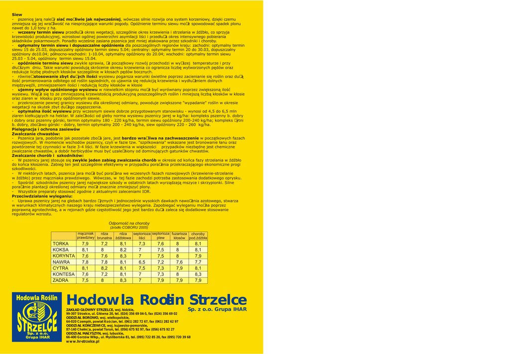 Siew - pszenicę jarą należy siać możliwie jak najwcześniej, wówczas silnie rozwija ona system korzeniowy, dzięki czemu zmniejsza się jej wrażliwość na niesprzyjające warunki pogody. Opóźnienie terminu siewu może spowodować spadek plonu nawet do 1,0 tony z ha. - wczesny termin siewu przedłuża okres wegetacji, szczególnie okres krzewienia i strzelania w źdźbło, co sprzyja krzewistości produkcyjnej, wzrostowi ogólnej powierzchni asymilacji liści i przedłuża okres intensywnego pobierania składników pokarmowych. Ponadto wcześnie zasiana pszenica jest mniej atakowana przez szkodniki i choroby. - optymalny termin siewu i dopuszczalne opóźnienia dla poszczególnych regionów kraju: zachodni: optymalny termin siewu 15 do 25.03, dopuszczalny opóźniony termin siewu 5.04; centralny: optymalny termin 20 do 30.03, dopuszczalny opóźniony do10.04; północno-wschodni: 1-10.04, optymalny opóźniony do 20.04; wschodni: optymalny termin siewu 25.03 - 5.04, opóźniony termin siewu 15.04. - opóźnienie terminu siewu zwykle sprawia, że początkowy rozwój przechodzi w wyższej temperaturze i przy dłuższym dniu. Takie warunki powodują skrócenie okresu krzewienia co ogranicza liczbę wytworzonych pędów oraz redukuje liczbę płodnych kłosków szczególnie w kłosach pędów bocznych. - również stosowanie zbyt dużych ilości wysiewu pogarsza warunki świetlne poprzez zacienianie się roślin oraz dużą ilość promieniowania odbitego od roślin sąsiednich, co ujawnia się redukcją krzewienia i wydłużeniem dolnych międzywęźli, zmniejszeniem ilości i redukcją liczby kłosków w kłosie - ujemny wpływ opóźnionego wysiewu w niewielkim stopniu może być wyrównany poprzez zwiększoną ilość wysiewu. Wiąże się to ze zmniejszoną krzewistością produkcyjną poszczególnych roślin i mniejszą liczbą kłosków w kłosie oraz ziaren w kłosku przy opóźnionym siewie. - przekroczenie pewnej granicy wysiewu dla określonej odmiany, powoduje zwiększone "wypadanie" roślin w okresie wegetacji na skutek zbyt dużego zagęszczenia. - optymalna ilość wysiewu przy wczesnym siewie dobrze przygotowanym stanowisku - wynosi od 4,5 do 6,5 mln ziaren kiełkujących na hektar. W zależności od gleby norma wysiewu pszenicy jarej w kg/ha: kompleks pszenny b. dobry i dobry oraz pszenny górski, termin optymalny 180 - 220 kg/ha, termin siewu opóźniony 200-240 kg/ha; kompleks żytni b. dobry, zbożowo górski - dobry, termin optymalny 200 - 240 kg/ha, siew opóźniony 220 - 260 kg/ha. Pielęgnacja i ochrona zasiewów Zwalczanie chwastów: - Pszenica jara, podobnie jak pozostałe zboża jare, jest bardzo wrażliwa na zachwaszczenie w początkowych fazach rozwojowych. W momencie wschodów pszenicy, czyli w fazie tzw. "szpilkowania" wskazane jest bronowanie łanu oraz powtórzenie tej czynności w fazie 3-4 liści. W fazie krzewienia w większości przypadków niezbędne jest chemiczne zwalczanie chwastów, a dobór herbicydów musi być uzależniony od dominujących gatunków chwastów. Zwalczanie chorób i szkodników: - W pszenicy jarej stosuje się zwykle jeden zabieg zwalczania chorób w okresie od końca fazy strzelania w źdźbło do końca kłoszenia. Zabieg ten jest szczególnie efektywny w przypadku porażenia przekraczającego ekonomiczne progi szkodliwości. - W niektórych latach, pszenica jara może być porażona we wczesnych fazach rozwojowych (krzewienie-strzelanie w źdźbło) przez mączniaka prawdziwego. Wówczas, w tej fazie zachodzi potrzeba zastosowania dodatkowego oprysku. - Spośród szkodników pszenicy jarej największe szkody w ostatnich latach wyrządzają mszyce i skrzypionki. Silne porażenie plantacji określonej odmiany może znacznie zmniejszyć plony. - Wszystkie preparaty stosować zgodnie z aktualnymi zaleceniami IOR. Przeciwdziałanie wyleganiu: - Uprawa pszenicy jarej na glebach bardzo żyznych i jednocześnie wysokich dawkach nawożenia azotowego, stwarza w warunkach klimatycznych naszego kraju niebezpieczeństwo wylegania. Zapobiegać wyleganiu można poprzez poprawną agrotechnikę, a w rejonach gdzie częstotliwość jego jest bardzo duża zaleca się dodatkowe stosowanie regulatorów wzrostu. Odporność na choroby (źródło COBORU 2005) mączniak rdza rdza septorioza septorioza fuzarioza choroby prawdziwy brunatna źdźbłowa plew liści kłosów pod.źdźbła TORKA KOKSA KORYNTA NAWRA CYTRA KONTESA ZADRA 7,9 8,1 7,6 7,8 8,1 7,6 7,5 7,2 8 7,6 7,8 8,2 7,2 8 8,1 8,2 8,3 8,1 8,1 8,1 8,3 7,3 7 7 6,5 7,5 7 7 7,6 7,5 7,5 7,2 7,3 7,3 7,9 8 8 8 7,6 7,9 8 7,9 8,1 8,1 7,9 7,7 8,1 8,3 7,9 Hodowla Roœlin Strzelce Sp. ZAKŁAD GŁÓWNY STRZELCE, woj. łódzkie, 99-307 Strzelce, ul. Główna 20, tel. (024) 356 69 04-5, fax (024) 356 69 02 ODDZIAŁ BOROWO, woj. wielkopolskie, 64-020 Czempiń, powiat Kościan, tel. (061) 282 72 67, fax (061) 282 62 97 ODDZIAŁ KOŃCZEWICE, woj. kujawsko-pomorskie, 87-140 Chełmża, powiat Toruń, tel. (056) 675 92 97, fax (056) 675 92 27 ODDZIAŁ MAŁYSZYN, woj. lubuskie, 66-400 Gorzów Wlkp., ul. Myśliborska 81, tel. (095) 722 85 20, fax (095) 720 39 68 www.hr-strzelce.pl z o.o. Grupa IHAR TORKA - Złoty Medal POLAGRA 2001 - klasa jakości E - najlepsza wartość wypiekowa ze wszystkich zarejestrowanych odmian - ziarno czerwone, szkliste o dobrym wyrównaniu i dużej masie 1000 ziaren - odporność na osypywanie i porastanie w kłosie - zdrowotność dobra, mało wrażliwa na rdzę brunatną i septoriozę liści - średnio-późny termin dojrzewania - plenność dość dobra, wyższe wymagania glebowe - tolerancyjność na opóźniony termin siewu i suszę ZADRA - NOWOŚĆ! - odmiana chlebowa o dobrej jakości wypiekowej (klasa jakości B) - wysoka zawartość białka i glutenu w ziarnie, wysoka liczba opadania - ziarno czerwone o dobrym wyrównaniu i szklistości, masa 1000 ziaren powyżej 40g - wysoka odporność na osypywanie i porastanie w kłosie - wysokość łanu 95-105 cm - źdźbło średnio 