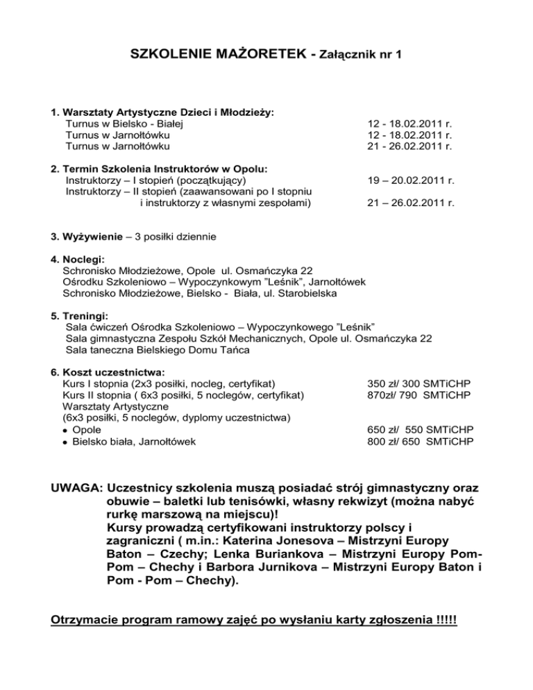SZKOLENIE MAŻORETEK - Załącznik nr 1 1. Warsztaty Artystyczne Dzieci i Młodzieży: Turnus w Bielsko - Białej Turnus w Jarnołtówku Turnus w Jarnołtówku 2. Termin Szkolenia Instruktorów w Opolu: Instruktorzy – I stopień (początkujący) Instruktorzy – II stopień (zaawansowani po I stopniu i instruktorzy z własnymi zespołami) 12 - 18.02.2011 r. 12 - 18.02.2011 r. 21 - 26.02.2011 r. 19 – 20.02.2011 r. 21 – 26.02.2011 r. 3. Wyżywienie – 3 posiłki dziennie 4. Noclegi: Schronisko Młodzieżowe, Opole ul. Osmańczyka 22 Ośrodku Szkoleniowo – Wypoczynkowym ”Leśnik”, Jarnołtówek Schronisko Młodzieżowe, Bielsko - Biała, ul. Starobielska 5. Treningi: Sala ćwiczeń Ośrodka Szkoleniowo – Wypoczynkowego ”Leśnik” Sala gimnastyczna Zespołu Szkół Mechanicznych, Opole ul. Osmańczyka 22 Sala taneczna Bielskiego Domu Tańca 6. Koszt uczestnictwa: Kurs I stopnia (2x3 posiłki, nocleg, certyfikat) Kurs II stopnia ( 6x3 posiłki, 5 noclegów, certyfikat) Warsztaty Artystyczne (6x3 posiłki, 5 noclegów, dyplomy uczestnictwa) Opole Bielsko biała, Jarnołtówek 350 zł/ 300 SMTiCHP 870zł/ 790 SMTiCHP 650 zł/ 550 SMTiCHP 800 zł/ 650 SMTiCHP UWAGA: Uczestnicy szkolenia muszą posiadać strój gimnastyczny oraz obuwie – baletki lub tenisówki, własny rekwizyt (można nabyć rurkę marszową na miejscu)! Kursy prowadzą certyfikowani instruktorzy polscy i zagraniczni ( m.in.: Katerina Jonesova – Mistrzyni Europy Baton – Czechy; Lenka Buriankova – Mistrzyni Europy PomPom – Chechy i Barbora Jurnikova – Mistrzyni Europy Baton i Pom - Pom – Chechy). Otrzymacie program ramowy zajęć po wysłaniu karty zgłoszenia !!!!!