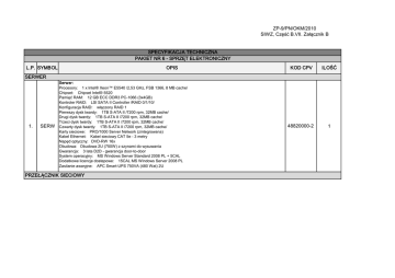 ZP-9/PN/OKM/2010 SIWZ, Część B.VII. Załącznik B SPECYFIKACJA TECHNICZNA PAKIET NR 6 - SPRZĘT ELEKTRONICZNY L.P. SYMBOL OPIS KOD CPV ILOŚĆ 48820000-2 1 SERWER 1. SERW Serwer: Procesory: 1 x Intel® Xeon™ E5540 /2,53 GHz, FSB 1366, 8 MB cache/ Chipset: Chipset Intel® 5520 Pamięć RAM: 12 GB ECC DDR3 PC-1066 (3x4GB) Kontroler RAID: LSI SATA II Controller /RAID 0/1/10/ Konfiguracja RAID: włączony RAID 1 Pierwszy dysk twardy: 1TB S-ATA II /7200 rpm, 32MB cache/ Drugi dysk twardy: 1TB S-ATA II /7200 rpm, 32MB cache/ Trzeci dysk twardy: 1TB S-ATA II /7200 rpm, 32MB cache/ Czwarty dysk twardy: 1TB S-ATA II /7200 rpm, 32MB cache/ Karty sieciowe: PRO/1000 Server Network (zintegrowana) Kabel Ethernet: Kabel sieciowy CAT 5e - 3 metry Napęd optyczny: DVD-RW 16x Obudowa: Obudowa 2U (750W) z szynami do wysuwania Gwarancja: 3 lata D2D - gwarancja door-to-door System operacyjny: MS Windows Server Standard 2008 PL + 5CAL Dodatkowe licencje dostepowe: 15CAL MS Windows Server 2008 PL Zasilanie awaryjne: APC Smart-UPS 750VA (480 Wat) 2U PRZEŁĄCZNIK SIECIOWY 2. x Przełącznik sieciowy: Liczba portów 1000BaseT (RJ45): 24 szt. Obsługiwane protokoły i standardy: Auto MDI/MDI-X BOOTP - BOOTstrap Protocol Broadcast Storm Control DHCP Client - Dynamic Host Configuration Protocol Client DSCP - DiffServ Code Point GVRP - Group VLAN Registration Protocol half/full duplex IEEE 802.1D - Spanning Tree IEEE 802.1p - Priority IEEE 802.1Q - Virtual LANs IEEE 802.1s - Multiple Spanning Tree IEEE 802.1w - Rapid Convergence Spanning Tree IEEE 802.1x - Network Login (MAC-based Access Control) IEEE 802.1x - Network Login (Port-based Access Control) IEEE 802.3 - 10BaseT IEEE 802.3ab - 1000BaseT IEEE 802.3ad - Link Aggregation Control Protocol IEEE 802.3u - 100BaseTX IEEE 802.3x - Flow Control IEEE 802.3z - 1000BaseSX/LX IGMP - Internet Group Management Protocol IP QoS IPv4 IPv6 Jumbo frame support PVE - Private VLAN Edge SNTP - Simple Network Time Protocol TCP/IP - Transmission Control Protocol/Internet Protocol TFTP - Trivial File Transfer Protocol UDP - datagramowy protokół użytkownika Zarządzanie, monitorowanie i konfiguracja: CLI - Command Line Interface RMON - Remote Monitoring SNMPv1 - Simple Network Management Protocol ver. 1 SNMPv2 - Simple Network Management Protocol ver. 2 SNMPv3 - Simple Network Management Protocol ver. 3 Syslog - Security Issues in Network Event Logging Telnet zarządzanie przez przeglądarkę WWW Rozmiar tablicy adresów MAC: 8192 Algorytm przełączania: store-and-forward Warstwa przełączania: 2 Typ obudowy: rack 19 Wyposażenie standardowe: kabel zasilający, klamry do montażu w szafach przemysłowch rack 19 Głębokość: 350 mm Masa netto: 3,311 kg Dodatkowe funkcje: maksymalna liczba kolejek QoS: 4 maksymalna liczba portów w trunku: 8 maksymalna liczba sieci wirtulanych VLAN 802.1Q: 256 maksymalna liczba trunków na przełącznik: 8 port mirroring - przekierowanie informacji o ruchu na wskazany port QoS - gwarancja wysokiej jakości usług zarządzanie pasmem ROUTER 31214100-0 4 3. x Router: Klasa produktu: Router (bramka internetowa) Port WAN: 1x10/100BaseTX (RJ45) Cable/xDSL (RJ45) Port LAN: 4x10/100BaseTX (RJ45) Zarządzanie, monitorowanie i konfiguracja: SNMP - Simple Network Management Protocol zarządzanie przez przeglądarkę WWW Obsługiwane protokoły routingu: RIP v1 - Routing Information Protocol ver. 1 RIP v2 - Routing Information Protocol ver. 2 ruting dynamiczny ruting statyczny Obsługiwane protokoły i standardy: DHCP Client - Dynamic Host Configuration Protocol Client DHCP Server - Dynamic Host Configuration Protocol Server DNS - Domain Name System IEEE 802.3 - 10BaseT IEEE 802.3u - 100BaseTX NAT - Network Address Translation PPPoE - Point-to-Point Protocol over Ethernet TCP/IP - Transmission Control Protocol/Internet Protocol UDP - datagramowy protokół użytkownika UPnP - Universal plug-and-play Protokoły uwierzytelniania i kontroli dostępu: ACL bazujący na adresach IP i typie protokołu ACL bazujący na adresach MAC ACL bazyjący na numerach portów TCP/UDP MD5 SHA-1 Obsługiwane protokoły VPN: IPSec pass-trough L2TP pass-trough PPTP pass-trough Ochrona przed atakami Denial of Service (DoS): Ping of Death Dodatkowe funkcje: 4-portowy Switch blokowanie Domen DMZ dzieli dostęp do internetu dostarczanego poprzez modem DSLowy z wyjściem RJ45 dzieli dostęp do internetu dostarczanego poprzez modem TV kablowej filtrowanie IP filtrowanie MAC filtrowanie URL firewall oparty na NAT port forwarding (Virtual Server) - przekierowanie usług TCP/IP komputery w sieci Szyfrowanie: 3DES - standard szyfrowania danych (168-bit) DES - standard szyfrowania danych (56-bit) 32413100-2 1 31213300-5 1 kpl. SZAFA STOJĄCA 4. x Szafa stojąca przeznaczone do montażu urządzeń teleinformatycznych i telekomunikacyjnych 42U 800x1000 + osprzęt Szafa z drzwiami z blachy perforowanej - sztuk 1 Cokół 800/1000 - sztuk 1 Wentylator dachowy 4w z termostatem - sztuk 1 Prowadnica pozioma - sztuk 2 Prowadnica pionowa 80/80 - sztuk 5 Półka 19 "450mm- - sztuk 3 Listwa zasilania 19" 5x230v - sztuk 2 Kabel UTP Madex 4x2 kat.5e - sztuk1 Wtyk RJ45 - sztuk 100 ZASILACZ AWARYJNY 5. x Zasilacz awaryjny Moc pozorna: 500VA Moc rzeczywista: 300 Wat Maksymalny czas przełączenia na baterie: 6ms Liczba, typ gniazd wyj. z podtrzymaniem zasilania: Typ obudowy: Tower 30237280-5 10 System antykradzieżowy: - 2 bramki wykonane z plastiku w kolorze szarym - zakres działania minimum 2 m między bramkami - wysokość bramek maksymalnie do 1,6 m - zasilanie - 220 V - alarm dźwiękowy i wzrokowy - samoprzylepne metki w ilości 5000 sztuk, białe, bez nadruku, o wymiarach nie większych niż: wysokość 46 mm, szerokość 11 mm, grubość 2 mm 31625300-6 1 Ekran mocowany na ścianie . Format 4:3 . zasilanie elektryczne . Zwarta obudowa z silnikiem elektycznym . Sterowanie pilotem . Długośc 250 cm . Ekran bez ramek . Automatyczne zatrzymywanie mechanizmu podczas rozwijania i zwijania, zabezpi