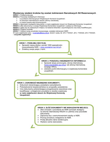 Wystarczy siedem kroków by zostać żołnierzem Narodowych Sił Rezerwowych KROK 1. Podejmij decyzję. KROK 2. Poszukaj niezbędnych informacji: • w punktach informacyjnych Wojskowych Komend Uzupełnień; • na stronach internetowych resortu obrony narodowej; • w czasie trwania akcji promocyjnych. KROK 3. Zgromadź niezbędne dokumenty, w razie wątpliwości dzwoń do Wojskowej Komendy Uzupełnień. KROK 4. Złóż dokumenty w swojej Wojskowej Komendzie Uzupełnień i czekaj na informacje. KROK 5. Zgłoś się we wskazanym miejscu na badania lekarskie i psychologiczne oraz testy kwalifikacyjne. KROK 6. Podpisz kontrakt. KROK 7. Odbierz kartę przydziału kryzysowego, zostałeś żołnierzem NSR! W razie wątpliwości pisz – [email protected], dzwoń i pytaj, tel. (81) 7183321, (81) 7183322, (81) 7183324. - wszystko wyjaśnimy! KROK 1. PODEJMIJ DECYZJĘ. • Sprawdź naszą ofertę z ponad 1000 specjalności. (wyszukiwarka NSR – www.szukajnsr.wp.mil.pl). • Zrealizuj swoje pasje z nami. KROK 2. POSZUKAJ NIEZBĘDNYCH INFORMACJI: • Sprawdź akcje promocyjne, stronę internetową (www.wszwlublin.wp.mil.pl, lub stronę internetową swojego WKU), • odwiedź punkt informacyjny w wojskowej komendzie uzupełnień. KROK 3. ZGROMADŹ NIEZBĘDNE DOKUMENTY, • Dokument stwierdzający posiadane wykształcenie. • Poświadczenie bezpieczeństwa (w przypadku posiadania). • Inne dokumenty potwierdzające przygotowanie zawodowe oraz kwalifikacje i umiejętności przydatne w służbie wojskowej. • w razie wątpliwości dzwoń do Wojskowej Komendy Uzupełnień. KROK 4. ZŁÓŻ DOKUMENTY WE WSKAZANYM MIEJSCU. • Złóż wniosek o powołanie do NSR (wniosek dostępny na stronie internetowej WSzW w Lublinie) oraz pozostałe dokumenty. • Zapoznaj się z uwarunkowaniami służby w NSR. • Poznaj procedury wstąpienia do NSR. • Podaj aktualne dane ewidencyjne. • Wybierz wolne stanowisko. KROK 5. ZGŁOŚ SIĘ WE WSKAZANYM MIEJSCU NA BADANIA I TESTY. • Przejdź badania lekarskie i psychologiczne. • Zgłoś się na kwalifikacje w jednostce wojskowej: sprawdzian z wychowania fizycznego; sprawdzian z kwalifikacji zawodowej; rozmowa kwalifikacyjna. KROK 6. PODPISZ KONTRAKT. Dowódca jednostki wojskowej po pozytywnym zakończeniu procedury kwalifikacyjnej przygotuje dla ciebie kontrakt na wykonywanie obowiązków w ramach Narodowych Sił Rezerwowych. Zapoznaj się z nim i podpisz. KROK 7. ODBIERZ PRZYDZIAŁ KRYZYSOWY. Odbierz przydział kryzysowy w swojej Wojskowej Komendzie Uzupełnień. Właśnie zostałeś żołnierzem Narodowych Sił Rezerwowych.
