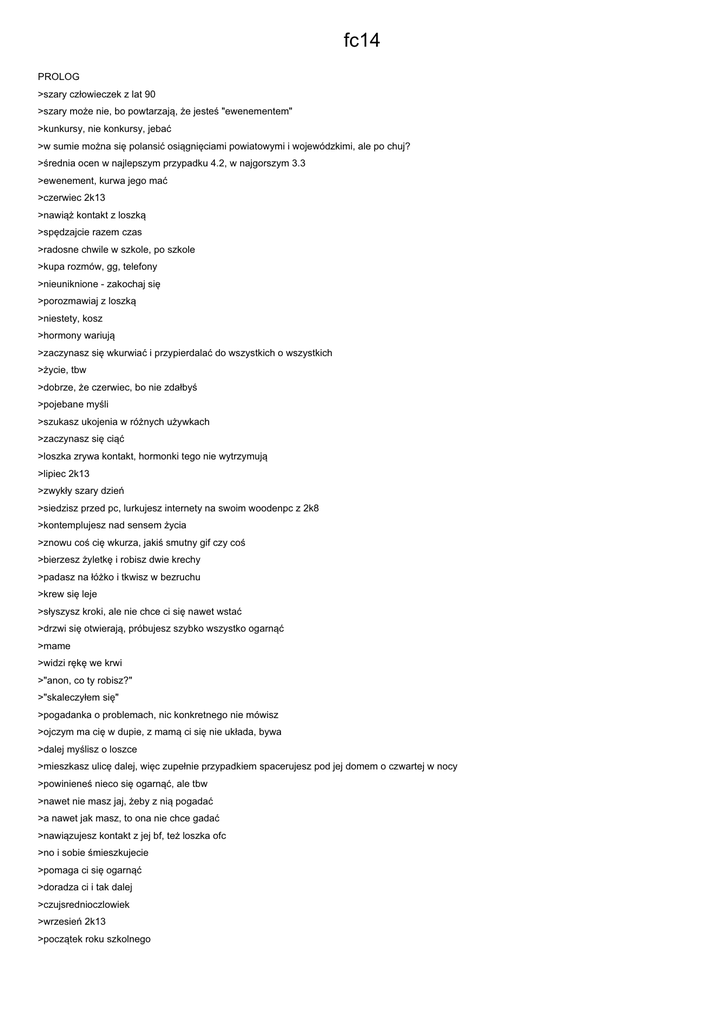 fc14 PROLOG >szary człowieczek z lat 90 >szary może nie, bo powtarzają, że jesteś "ewenementem" >kunkursy, nie konkursy, jebać >w sumie można się polansić osiągnięciami powiatowymi i wojewódzkimi, ale po chuj? >średnia ocen w najlepszym przypadku 4.2, w najgorszym 3.3 >ewenement, kurwa jego mać >czerwiec 2k13 >nawiąż kontakt z loszką >spędzajcie razem czas >radosne chwile w szkole, po szkole >kupa rozmów, gg, telefony >nieuniknione - zakochaj się >porozmawiaj z loszką >niestety, kosz >hormony wariują >zaczynasz się wkurwiać i przypierdalać do wszystkich o wszystkich >życie, tbw >dobrze, że czerwiec, bo nie zdałbyś >pojebane myśli >szukasz ukojenia w różnych używkach >zaczynasz się ciąć >loszka zrywa kontakt, hormonki tego nie wytrzymują >lipiec 2k13 >zwykły szary dzień >siedzisz przed pc, lurkujesz internety na swoim woodenpc z 2k8 >kontemplujesz nad sensem życia >znowu coś cię wkurza, jakiś smutny gif czy coś >bierzesz żyletkę i robisz dwie krechy >padasz na łóżko i tkwisz w bezruchu >krew się leje >słyszysz kroki, ale nie chce ci się nawet wstać >drzwi się otwierają, próbujesz szybko wszystko ogarnąć >mame >widzi rękę we krwi >"anon, co ty robisz?" >"skaleczyłem się" >pogadanka o problemach, nic konkretnego nie mówisz >ojczym ma cię w dupie, z mamą ci się nie układa, bywa >dalej myślisz o loszce >mieszkasz ulicę dalej, więc zupełnie przypadkiem spacerujesz pod jej domem o czwartej w nocy >powinieneś nieco się ogarnąć, ale tbw >nawet nie masz jaj, żeby z nią pogadać >a nawet jak masz, to ona nie chce gadać >nawiązujesz kontakt z jej bf, też loszka ofc >no i sobie śmieszkujecie >pomaga ci się ogarnąć >doradza ci i tak dalej >czujsrednioczlowiek >wrzesień 2k13 >początek roku szkolnego >idziesz na rozpoczęcie >może ją zobaczysz, po raz pierwszy od dwóch miesięcy >cóż za ironia, idzie po drugiej stronie ulicy >zagadać czy nie? >nie masz jaj >albo ona nie chce >nieistotne, nie gadasz >mijają kolejne dni, chyba masz deprechę >rozmyślasz o wszystkich, ale to wszystkich sprawach >które nie dotyczą twojego życia, bo po co >piszesz tylko z jej bf, od czasu do czasu >ale w sumie łapiecie coraz lepszy kontakt >"nie gap się tak na nią, ona się ciebie boi" >kurwamac.wav >czas mija PART I >koniec 2k13, hormony się uspokoiły >czujdobrzeczłowiek >zajawka na naukę >mówią, że jesteś very inteligent, tbw w to >ale postanawiasz się uczyć >nic innego ci nie jest potrzebne >nawet wooden pc nie daje porządnych perspektyw na nerdzenie >skończyć edukację, znaleźć robotę, założyć rodzinę >czasem rozmawiasz z loszką, w której niegdyś byłeś zakochany >z jej bf też rozmawiasz, częściej >ogólnie jesteś w chuj introwertyk i masz nieco dziwne relacje z klasą >nie przeszkadzasz im, ale za dużo nie rozmawiacie >jedyne osoby z którymi rozmawiasz to jej bf i w sumie tylko ona, jakoś z tamtą loszką nie idzie najlepiej >tbw, było minęło >styczeń 2k14 >w międzyczasie poukładało się, level normal >spędzasz czas z tymi loszkami, z ziomkiem, nerdzisz czasem >chyba przypadkiem zaprzyjaźniłeś się loszką-bf >wszyscy w koło mówią „anon i karynka zakochani hehe" >tbw, jajcarze jedni, ona ma chłopaka >akurat wypadł finał konkursu wojewódzkiego, tbw, ale >złapała cię zajawka by zadbać o przyszłość >nauka >26 styczeń 2k14 >hormony odpierdalają >nie ogarniasz jeszcze do końca co się dzieje, ale jest fajnie >w pewnym momencie zrozumiałeś, że się w niej zakochałeś >kurwa mać >ona ma chłopaka >chuj, zaraz będą ferie, przynajmniej dwa tygodnie wolnego na ogarnięcie się >deprecha mocno >zachowujesz się jak turbozjeb na baterie modyfikowany genetycznie >deprecha, załamka, ból i rozpacz >nie gadasz z nikim w sumie >chodzisz do szkoły, udajesz że jesteś na lekcjach, chociaż myślami jesteś gdzie indziej >nie masz siły na nic >twoje hormony są spierdolone mocno >loszka nie wie co się dzieje i wkurwia się, bo ją unikasz >karynka się wkurwia, bo ją unikasz >wiesz, że jak jej powiesz co i jak, ona zerwie kontakt, a tego byś nie przeżył >"anon, mam dosyć tego, jaki się zrobiłeś. przykro mi, że tak się to musiało skończyć, ale nie mam ochoty z tobą gadać" >deprecha, załamka, ból i rozpacz x2 >postanawiasz jej wszystko powiedzieć >opowiadasz jej co i jak tuż przed feriami >ferie, uff >wyjeżdżasz 50km >nie dajesz znaku życia przez miesiąc >chyba się martwi, jebać >wracasz w marcu do szkoły >zaczynacie normalnie pisać, rozmawiać >spędzacie ze sobą coraz więcej czasu >czujdobrzeczlowiek >iskierka_nadziei.exe >jej chłopak robi się zazdrosny >czujźleczłowiek >czy ty nie rozpierdalasz przypadkiem ich związku? >zawistna kurwa z ciebie, ale tylko trochę >czujesz na sobie mordercze spojrzenie rudzielca z klasy >"po chuj się wpierdalasz w ich związek?" >w sumie ma rację >ognisko międzyklasowe >rozmawiacie ze sobą >jej chłopak gdzieś tam w oddali sam, albo ty w oddali sam >ona tak skacze, to ty, to chłopak >w sumie to nie ma sensu >nie chcesz psuć ich związku zjebaną przyjaźnią >"karyna, to nie ma sensu, nie chcę ci rozjebać tego związku. jesteście razem już prawie rok, sorki" >"anon, nie wiem co czuję" >za późno >no to chuj >dowiadujesz się, że jest w separacji ze swoim chłopakiem >spędzacie ze sobą w chuj czasu, no i jeszcze trochę czasu >masz limit 500 smsów w telefonie i musisz czyścić codziennie >gadacie kilka godzin dziennie przez telefon, cały czas w szkole >to taka przyjaźń, ale chcesz więcej >nie daje ci to spokoju >ona sama nie wie >nie wyrabiasz >zadajesz się z sebkiem, sebek załatwia dopy, palicie dopy, palisz slugi, pijesz >loszka się wkurwia za znajomość z sebkiem >zaczynacie się kłócić >zaczynasz obiecywać, że się zmienisz >palisz lufę gadając z nią przez telefon, „nie będę tego robić" >czujjebanyhipokryta >a może tak będzie lepiej >co tydzień ktoś z was d