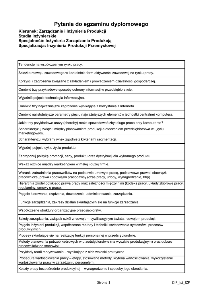 Pytania do egzaminu dyplomowego Kierunek: Zarządzanie i Inżynieria Produkcji Studia inżynierskie Specjalność: Inżynieria Zarządzania Produkcją Specjalizacja: Inżynieria Produkcji Przemysłowej Tendencje na współczesnym rynku pracy. Ścieżka rozwoju zawodowego w kontekście form aktywności zawodowej na rynku pracy. Korzyści i zagrożenia związane z zakładaniem i prowadzeniem działalności gospodarczej. Omówić trzy przykładowe sposoby ochrony informacji w przedsiębiorstwie. Wyjaśnić pojęcie technologia informacyjna. Omówić trzy najważniejsze zagrożenie wynikające z korzystania z Internetu. Omówić najistotniejsze parametry pięciu najważniejszych elementów jednostki centralnej komputera. Jakie trzy przykładowe urazy (choroby) może spowodować zbyt długa praca przy komputerze? Scharakteryzuj związki między planowaniem produkcji a otoczeniem przedsiębiorstwa w ujęciu marketingowym. Scharakteryzuj wybrany rynek zgodnie z kryteriami segmentacji. Wyjaśnij pojęcie cyklu życia produktu. Zaproponuj politykę promocji, ceny, produktu oraz dystrybucji dla wybranego produktu. Wskaż różnice między marketingiem w małej i dużej firmie. Warunki zatrudniania pracowników na podstawie umowy o pracę, podstawowe prawa i obowiązki pracownicze, prawa i obowiązki pracodawcy (czas pracy, urlopy, wynagrodzenie, bhp). Hierarchia źródeł polskiego prawa pracy oraz zależności między nimi (kodeks pracy, układy zbiorowe pracy, regulaminy, umowy o pracę. Pojęcie kierowania, rządzenia, dowodzenia, administrowania, zarządzania. Funkcje zarządzania, zakresy działań składających się na funkcje zarządzania. Współczesne struktury organizacyjne przedsiębiorstw. Szkoły zarządzania, związek szkół z rozwojem cywilizacyjnym świata, rozwojem produkcji. Pojęcie inżynierii produkcji, współczesne metody i techniki kształtowania systemów i procesów produkcyjnych. Procesy składające się na realizację funkcji personalnej w przedsiębiorstwie. Metody planowania potrzeb kadrowych w przedsiębiorstwie (na wydziale produkcyjnym) oraz doboru pracowników do stanowisk. Przykłady teorii motywowania – wynikające z nich wnioski praktyczne. Procedura wartościowania pracy – etapy, stosowane metody, kryteria wartościowania, wykorzystanie wartościowania pracy w zarządzaniu personelem. Koszty pracy bezpośrednio produkcyjnej – wynagrodzenie i sposoby jego określania. Strona 1 ZiIP_Ist_IZP Co to jest bilans? W jakim celu przedsiębiorstwa sporządzają bilans? Jakie są główne zasady tworzenia bilansu? Co to są aktywa? przedsiębiorstwa? Co to są pasywa przedsiębiorstwa? Omów i wymień przykłady aktywów i pasywów dowolnego przedsiębiorstwa. Omów wariant porównawczy i kalkulacyjny sporządzania rachunku zysków i strat. Czym się różnią konta bilansowe od kont wynikowych? Jak zbudowane jest konto? Jakie są podstawowe zasady księgowania operacji na kontach? Wymień i omów dokumenty magazynowe. Omów metody wyceny rozchodu materiałów. Wymień dokumenty księgowe związane z amortyzacją oraz z użytkowaniem środków trwałych w przedsiębiorstwie. Określ definicję czym jest amortyzacja środków trwałych? Pojecie kosztów rodzajowych, kosztów, nakładów, wydatków, nośników kosztów, miejsc powstawania kosztów. Podziałowe metody obliczeń kosztów produkcji. Doliczeniowe metody obliczeń kosztów produkcji. Określanie kosztów stanowiskowych. Określanie kosztów produkcji wg metody kosztów działań. Co rozumiesz przez pojęcie relacyjna baza danych? Podaj praktyczny przykład. Wymień i krótko scharakteryzuj trzy wybrane systemy komputerowego wspomagania prac inżynierskich (systemy CAx). Omówić zastosowanie języka VBA w rozwiązywaniu problemów inżynierskich. Charakterystyka wybranych języków programowania. Na przykładzie języka VBA przedstawić zagadnienie dobrej praktyki programistycznej. Pojecie tworzywa, materiału jego gatunku i postaci, stopy metali, układ żelazo -węgiel. Rodzaje i oznaczenia gatunków stali, żeliwa (wg norm), ich zastosowania. Rodzaje obróbki cieplnej i cieplno-chemiczne i ich zastosowania do różnych tworzyw. Rodzaje i oznaczenia materiałów narzędziowych, gatunki stali narzędziowych,zastosowania poszczególnych rodzajów materiałów narzędziowych. Rodzaje (podział) tworzyw sztucznych, kompozytów. Podać najważniejsze zasady wymiarowania w rysunku technicznym. Wymienić rodzaje stosowanych połączeń części maszyn i krótko je scharakteryzować w kontekście wybranych przypadków ich użycia. Wyjaśnić i krótko scharakteryzować pojęcie tolerancji wymiarowych I pasowań, podać rodzaje stosowanych w rysunku technicznym odchyłek oraz objaśnić co oznacza zasada stałego otworu. Podać i scharakteryzować sposoby określania współrzędnych w przestrzeni rysunkowej systemu CAD (wsp.kartezjańskie, biegunowe, walcowe, sferyczne) oraz omówić ich znaczenie w kontekście modelowania 2D/3D. Przedstawić i krótko omówić trzy podstawowe reprezentacje obiektów 3D w systemach CAD (model szkieletowy, powierzchniowy i bryłowy), wskazując I uzasadniając najbardziej właściwe obszary ich zastosowania. Przeprowadzić analizę płaskiego dowolnego układu sił, sił czynnych, sił biernych, reakcji, więzów oraz momentu siły względem bieguna. Wymienić warunki równowagi przestrzennego dowolnego układu sił, moment siły względem osi, typowe problemy techniczne: wały obciążane w różnych płaszczyznach, konstrukcje przestrzenne, znajdowanie reakcji elementów utwierdzonych. Strona 2 ZiIP_Ist_IZP Przedstawić zagadnienia tarcia, hipotezy, oznaczanie, wartości. Określić wpływ budowy warstwy wierzchniej na współpracę dwóch elementów. Scharakteryzować zagadnienia wytrzymałości materiałów, naprężeń normalnych i stycznych. Scharakteryzować problem wytrzymałości na zginanie: momenty zginające, siła tnąca, linia i strzałka ugięcia. Współczesne