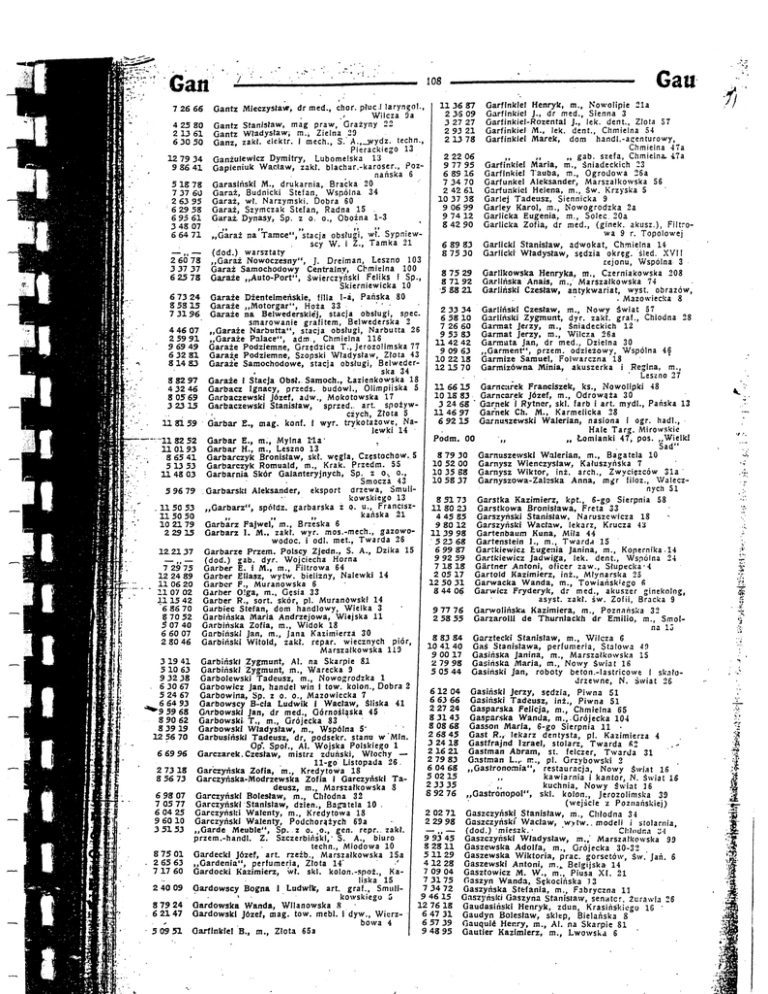 Gan Gau 108 Garfinklel Henryk, m., Nowolipie 21a Garfinkiel J., dr med., Sienna 3 Garfinkiel-Rozental J., lek. dent., Złota 57 4 25 80 Garfinkiel M., lek. dent., Chmielna 54 2 13 61 Garfinkiel Marek, dom handl.-agenturowy, 6 30 50 Chmielna 47a 2 22 06 ,, ,, gab. szefa, Chmielna. 47a 12 79 34 9 77 95 Garfinkiel Maria, m., Śniadeckich 23 9 36 41 6 85 16 Garfinkiel Tauba, m., Ogrodowa 26a 7 34 70 Garfunkei Aleksander, Marszałkowska 56 513 78 2 42 61 Garfunkicl Helena, m., Św. Krzyska 5 7 37 60 10 37 38 Garlej Tadeusz, Siennicka 9 2 63 95 9 06 99 Garley Karol, m., Nowogrodzka 2a 6 29 58 9 74 12 Garlicka Eugenia, m., Solec. 20a 6 95 61 8 42 90 Garlicka Zofia, dr med., (ginek. akusz.), Filtro 3 48 07 wa 9 r. Topolowej 6 64 71 .,Garaż na Tamce' stacja obsługi, wł. Sypniew scy W. i Z., Tamka 21 6 89 83 Garlicki Stanisław, adwokat, Chmielna 14 Garlicki Władysław, sędzia okręg. śled. XVII (dod.) warsztaty 8 75 30 rejonu, Wspólna 3 2 60 78 ,,Garaż Nowoczesny",, J. Dreiman, Leszno 103 3 37 37 Garaż Samochodowy Centralny, Chmielna 100 8 75 29 Garlikowska Henryka, m., Czerniakowska 208 6 25 78 Garaże „Auto-Port", Świerczynski Feliks i Sp., 8 71 92 Garlińska Anais, m., Marszałkowska 74 Skierniewicka 10 5 88 21 Garliński Czesław, antykwariat, wyst. obrazów, 6 73 24 Garaże Dżentelmeńskie, filia 1-ä, Pańska 80 - Mazowiecka 8 8 58 15 Garaże ,,Motorgar", Hoża 33 2 33 34 Garliński Czesław, m., Nowy świat 57 7 31 96 Garaże na Belwederskie"j, stacja obsługi, spec. 6 58 10 Garliński Zygmunt, dyr. zakł. graf., Chłodna 28 smarowanie grafitem, Belwederska 2 7 26 60 Garmat Jerzy, m., Śniadeckich 12 4 46 07 „Garaże Narbutta", stacja obsługi, Narbutta 26 9 53 83 Garmat Jerzy, m., Wilcza 26a 2 59 9 1 „Garaże Pałace", adm , Chmielna 116 11 42 42 Garrnata Jan, dr med., Dzielna 30 9 69 49 Garaże Podziemne, Grzedzica T., Jerozolimska 77 9 09 63 „Garment", przem. odzieżowy, Wspólna 46 6 32 81 Garaże Podziemne, Szopski Władysław, Złota 43 10 22 18 Garmize Samuel, Folwarczna 18 814 83 Garaże Samochodowe, stacja obsługi, Belweder 12 15 70 Garmizówna Minia, akuszerka i Regina, m., ska 34 ' Leszno 27 8 82 97 Garaże 1 Stacja Obsł.. Samoch., Łazienkowska 18 1166 15 Garncarek Franciszek, ks., Nowolipki 48 4 32 46 Garbacz Ignacy, przeds. budöwł., Olimpijska I 10 18 83 Garncarek Józef, m., Odrowąża 30 8 05 69 Garbaczewski Józef, adw., Mokotowska 17 3 24 68 * Garnek i Rytner, skl. farb i art. mydl., Pańska 13 323 15 Garbaczewski Stanisław, sprzed., art. spoźyw 11 46 97 Garnek Ch. M . , Karmelicka 28 cżych, Złota 5 6 92 15 Garn usze wski Walerian, nasiona i ogr. hadl., 118159 Garbar E. mag. konf. i wyr. trykotażowe, Na Hale Targ. Mirowskie lewki 14 „ „ Łomianki 47, pos. „Wielki Podm. 00 "11 82 52 Garbar E., m., Mylna l l a * Sad" 11 01 93 Garbar H., m., Leszno 13 8 79 30 GarnuszewskI Walerian, m., Bagatela 10 8 65 41 Garbarczyk Bronisław, skł. węgla, Częstochow. 5 Garnysz Wieńczysław, Kałuszyńska 7 10 52 00 5 1X53 Garbarczyk Romuald, m., Krak. Przedm. 55 10 35 88 Garnysz Wiktor, inż. arch., Zwycięzców 31a 11 48 03 Garbarnia Skór Galanteryjnych, Sp. z o., o., 10 58 37 Garnyszowa-Zateska Anna, mgr fiioz., Walecz Smocza 43 nych 51 5 96 79 Garbarski Aleksander, eksport drzewa, Smuli kowskiego 13 8 51 73 Garstka Kazimierz, kpt., 6-gp Sierpnia 58 . 11 50 53 „ G a r b a r z " , spółdz. garbarska z o. u., Francisz 11 80 23 Garstkowa Bronisława, Freta 33 kańska 21 11 50 50 4 45 85 Garszyński Stanisław, Naruszewicza 18 10 21 79 Garbarz Fajwel, m., Brzeska 6 9 80 12 Garszyński Wacław, lekarz, Krucza 4 3 229 15 Garbarz I . M . , zakł. wyr. mos.-mech., gazowo11 39 98 Gartenbaum Kuna, Miła 44 wodoc. i odl. met., Twarda 26 5 23 68 Gartenstein I . , m., Twarda 15 6 99 81 Gartkiewicz Eugenia Janina, m., Kopernika.14 12.21 37 Garbarze Przem. Polscy Zjedn., S. A., Dzika 15 (dod.) gab. dyr. Wojciecha Horna 9 92 59 Gartkiewicz Jadwiga, lek. dent., Wspólna 24 Garber E. i M . , m., Filtrowa 64 7 18 18 Gärtner Antoni, oficer zaw., Słupecka-4 7 29 75 2 05 17 Gartold Kazimierz, inż., Młynarska 25 12 24 89 Garber Eliasz, wytw. bielizny, Nalewki 14 12 50 31 Garwacka Wanda, m., Towiańsk»'ego 6 11 06 20 Garber F., Muranowska 6 8 44 06 Garwicz Fryderyk, dr med., akuszer ginekolog, 11 07 02 Garber Olga, m., Gęsia 33 11 15 42 Garber R., sort. skór, pl. Muranówski 14 asyst. zakł. św. Zofii, Bracka 9 Garbiec Stefan, dom handlowy, Wielka 3 '6 86 70 9 77 76 Garwolińska, Kazimiera, m., Poznańska 32 8 70 52 Garbińska Maria Andrzejowa, Wiajska 11 2 58 55 Garzarolll de Thurnlackh dr Emilio, m., Smol 5" 07 40 Garbińska Zofia, m., Widok 18 na 13 6 60 07 Garbiński Jan, rn., Jana Kazimierza 30 8 83 84 Garztecki Stanisław, m., Wilcza 6 2 80 46 Garbiński Witold, zakł. repar. wiecznych piór, 10 41 40 Gaś Stanisława, perfumeria, Stalowa 49 Marszałkowska 119 9 00 17 Gasińska Janina, m., Marszałkowska 15 3 19 41 Garbiński Zygmunt, Al. na Skarpie 81 2 79 98 Gasińska Maria, m., Nowy świat 16 5 10 63 Garbiński Zygmunt, m., Warecka 9 5 05 44 Gasiński Jan, roboty beton.-lastricowe i sknfo9 32 38 Garbolewski Tadeusz, m., Nowogrodzka 1 drzewne, N. świat 26 6 30 67 Garbowicz Jan, handel win i tow. kolon., Dobra 2 612 04 Gasiński Jerzy, sędzia, Piwna 51 5 24 67 Garbowina, Sp. z o. o., Mazowiecka 7 Gasiński Tadeusz, inż., Piwna 51 6 63 66 6 64 93 Garbowscy B-cia Ludwik i Wacław, śliska 41 2 27 24 Gasparska Felicja, m., Chmielna 65 *"9 59 68 Garbowski Jan, dr med., Górnośląska 45 8 31 43 Gasparska Wanda, m.,-Grójecka 104 8 90 62 Garbowski- T., m., Grójecka 83 SOS 68 Gasson Maria, 6-go Sierpnia 11 • 8 39 19 Garbowskl Władysław, m., Wspólna 5' 2 68 45 Gast R., lekarz dentysta, pl. Kazimierza 4 12 56 70 Garbusiński Tadeusz, dr, podsekr. stanu w Min. 3 24 18 Gastfrajnd Izrael, stolarz, Twarda 62 Op*. Społ., Al. Wojska Polskiego 1 2 16 21 Gastman Abram, st. felczer, Twarda 31 6 69 96 Garczarek. Czesław, mistrz zduński, Włochy — 2 79 83 Gastr