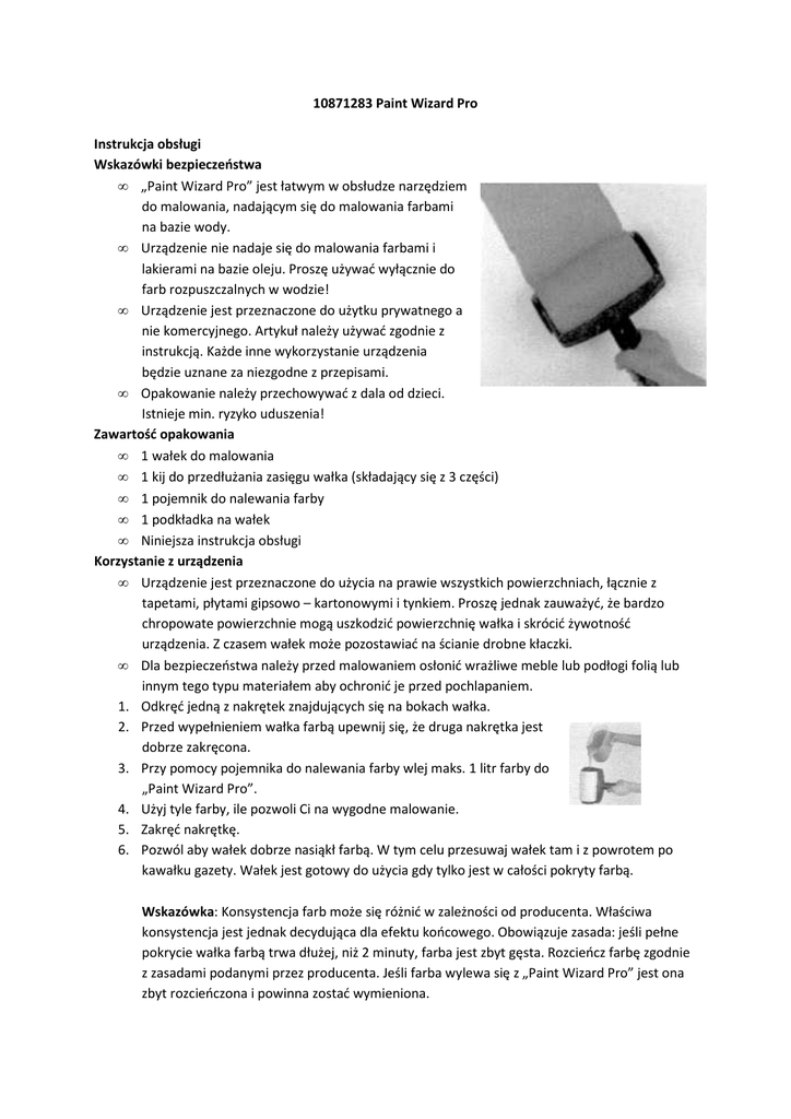 10871283 Paint Wizard Pro Instrukcja obsługi Wskazówki bezpieczeństwa • „Paint Wizard Pro” jest łatwym w obsłudze narzędziem do malowania, nadającym się do malowania farbami na bazie wody. • Urządzenie nie nadaje się do malowania farbami i lakierami na bazie oleju. Proszę używać wyłącznie do farb rozpuszczalnych w wodzie! • Urządzenie jest przeznaczone do użytku prywatnego a nie komercyjnego. Artykuł należy używać zgodnie z instrukcją. Każde inne wykorzystanie urządzenia będzie uznane za niezgodne z przepisami. • Opakowanie należy przechowywać z dala od dzieci. Istnieje min. ryzyko uduszenia! Zawartość opakowania • 1 wałek do malowania • 1 kij do przedłużania zasięgu wałka (składający się z 3 części) • 1 pojemnik do nalewania farby • 1 podkładka na wałek • Niniejsza instrukcja obsługi Korzystanie z urządzenia • Urządzenie jest przeznaczone do użycia na prawie wszystkich powierzchniach, łącznie z tapetami, płytami gipsowo – kartonowymi i tynkiem. Proszę jednak zauważyć, że bardzo chropowate powierzchnie mogą uszkodzić powierzchnię wałka i skrócić żywotność urządzenia. Z czasem wałek może pozostawiać na ścianie drobne kłaczki. • Dla bezpieczeństwa należy przed malowaniem osłonić wrażliwe meble lub podłogi folią lub innym tego typu materiałem aby ochronić je przed pochlapaniem. 1. Odkręć jedną z nakrętek znajdujących się na bokach wałka. 2. Przed wypełnieniem wałka farbą upewnij się, że druga nakrętka jest dobrze zakręcona. 3. Przy pomocy pojemnika do nalewania farby wlej maks. 1 litr farby do „Paint Wizard Pro”. 4. Użyj tyle farby, ile pozwoli Ci na wygodne malowanie. 5. Zakręć nakrętkę. 6. Pozwól aby wałek dobrze nasiąkł farbą. W tym celu przesuwaj wałek tam i z powrotem po kawałku gazety. Wałek jest gotowy do użycia gdy tylko jest w całości pokryty farbą. Wskazówka: Konsystencja farb może się różnić w zależności od producenta. Właściwa konsystencja jest jednak decydująca dla efektu końcowego. Obowiązuje zasada: jeśli pełne pokrycie wałka farbą trwa dłużej, niż 2 minuty, farba jest zbyt gęsta. Rozcieńcz farbę zgodnie z zasadami podanymi przez producenta. Jeśli farba wylewa się z „Paint Wizard Pro” jest ona zbyt rozcieńczona i powinna zostać wymieniona. 7. Podczas pierwszego użycia „Paint Wizard Pro” istnieje możliwość, że podczas malowania na ścianie będzie widoczna linia, powodowana przez miejsce zszycia wałka. Jednak wraz z upływem czasu linia ta będzie zanikać. 8. Najlepszy rezultat można osiągnąć przesuwając wałek powoli po ścianie, nie dociskając go jednak zbyt mocno. Wskazówka: Jeśli przerywasz malowanie na dłużej, niż 30 minut, włóż „Paint Wizard Pro” do plastikowej torebki, aby zapobiec wysychaniu wałka. 9. Do malowania sufitów i wysokich ścian należy użyć dołączonego do produktu kijka. W tym celu należy skręcić jego 3 części i przykręcić go do uchwytu wałka. 10. Aby czyszczenie wałka było łatwiejsze, przed myciem należy wylać resztkę farby do puszki. Następnie należy kontynuować malowanie wałkiem, z resztką farby w środku. Należy pamiętać o tym, że w „Paint Wizard Pro” może pozostać nawet 1/3 litra farby. Czyszczenie i przechowywanie 1. Usuń farbę ze środka wałka (patrz punkt 10). 2. Zdejmij nakrętkę znajdująca się z boku wałka i wypełnij wałek bieżącą wodą. 3. Płucz wałek przez kilka minut i pozostaw „Paint Wizard Pro” na noc w ciepłej wodzie. 4. Jeśli chcesz zaraz użyć wałka do malowania inną farbą możesz przyspieszyć proces suszenia poruszając wałkiem tam i z powrotem po papierowym ręczniku lub gazecie. 5. Produkt należy przechowywać w suchym, chłodnym miejscu. Utylizacja Materiał, z którego zostało zrobione opakowanie nadaje się do powtórnego wykorzystania. Poddaj go utylizacji zgodnie z zasadami ochrony środowiska i oddaj do punktu zbiórki surowców wtórnych. DZIAŁ OBSŁUGI KLIENTA E-mail: [email protected] Telefon: (+48) 22 517 50 17 poniedziałek - piątek w godzinach 8:00 – 18:00 Weltbild.pl Weltbild Media Sp. z o.o. Sp. k. ul. Hankiewicza 2, 02-103 Warszawa W ramach naszego ciągłego rozwoju zastrzegamy sobie prawo do zmiany produktu, opakowania lub dołączonych do niego dokumentów w każdej chwili.