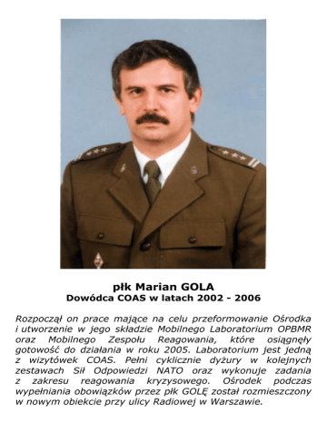 płk Marian GOLA Dowódca COAS w latach 2002 - 2006 Rozpoczął on prace mające na celu przeformowanie Ośrodka i utworzenie w jego składzie Mobilnego Laboratorium OPBMR oraz Mobilnego Zespołu Reagowania, które osiągnęły gotowość do działania w roku 2005. Laboratorium jest jedną z wizytówek COAS. Pełni cyklicznie dyżury w kolejnych zestawach Sił Odpowiedzi NATO oraz wykonuje zadania z zakresu reagowania kryzysowego. Ośrodek podczas wypełniania obowiązków przez płk GOLĘ został rozmieszczony w nowym obiekcie przy ulicy Radiowej w Warszawie.