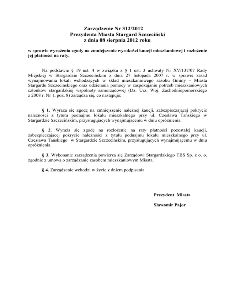Zarządzenie Nr 312/2012 Prezydenta Miasta Stargard Szczeciński z dnia 08 sierpnia 2012 roku w sprawie wyrażenia zgody na zmniejszenie wysokości kaucji mieszkaniowej i rozłożenie jej płatności na raty. Na podstawie § 19 ust. 4 w związku z § 1 ust. 3 uchwały Nr XV/137/07 Rady Miejskiej w Stargardzie Szczecińskim z dnia 27 listopada 2007 r. w sprawie zasad wynajmowania lokali wchodzących w skład mieszkaniowego zasobu Gminy – Miasta Stargardu Szczecińskiego oraz udzielania pomocy w zaspokajaniu potrzeb mieszkaniowych członków stargardzkiej wspólnoty samorządowej (Dz. Urz. Woj. Zachodniopomorskiego z 2008 r. Nr 1, poz. 8) zarządza się, co następuje: § 1. Wyraża się zgodę na zmniejszenie należnej kaucji, zabezpieczającej pokrycie należności z tytułu podnajmu lokalu mieszkalnego przy ul. Czesława Tańskiego w Stargardzie Szczecińskim, przysługujących wynajmującemu w dniu opróżnienia. § 2. Wyraża się zgodę na rozłożenie na raty płatności pozostałej kaucji, zabezpieczającej pokrycie należności z tytułu podnajmu lokalu mieszkalnego przy ul. Czesława Tańskiego w Stargardzie Szczecińskim, przysługujących wynajmującemu w dniu opróżnienia. § 3. Wykonanie zarządzenia powierza się Zarządowi Stargardzkiego TBS Sp. z o. o. zgodnie z umową o zarządzanie zasobem mieszkaniowym Miasta. § 4. Zarządzenie wchodzi w życie z dniem podpisania. Prezydent Miasta Sławomir Pajor UZASADNIENIE Na podstawie § 19 ust. 4 uchwały Nr XV/137/07 Rady Miejskiej w Stargardzie Szczecińskim, o której mowa w podstawie prawnej, na wniosek osoby o niskim dochodzie gospodarstwa domowego, pozytywnie zaopiniowany przez wynajmującego, Prezydent Miasta może wyrazić zgodę na przesunięcie terminu wpłaty kaucji, zmniejszenie jej wysokości, rozłożenie jej płatności na raty bądź odstąpienie od jej poboru. Zgodnie z § 1 ust. 3 ww. uchwały, do lokali podnajmowanych przez Miasto stosuje się odpowiednio zasady wynajmowania lokali wchodzących w skład mieszkaniowego zasobu Miasta. Państwo Anna i Janusz Kaczan umieszczeni są na liście osób uprawnionych do przydziału lokalu mieszkalnego docelowego w 2012 r., w grupie rodzin 4-osobowych pod pozycją 13. Wynajmujący – Stargardzkie TBS Sp. z o. o., zaproponował państwu Kaczan lokal przy ul. Czesława Tańskiego 12a/10 w Stargardzie Szczecińskim, wchodzący w skład mieszkaniowego zasobu Spółki, wynajęty Miastu w celu dalszego podnajmowania. Przed podpisaniem umowy podnajmu przedmiotowego lokalu, państwo Kaczan są zobowiązani do wpłacenia kaucji zabezpieczającej pokrycie należności z tytułu podnajmu przysługujących wynajmującemu w dniu opróżnienia lokalu. Zainteresowani zwrócili się z prośbą o odstąpienie od poboru części kaucji mieszkaniowej i spłatę pozostałej części kaucji mieszkaniowej w miesięcznych ratach w wysokości 100 zł. Przy przydziale lokalu zaliczonego do kategorii wartości użytkowej E kaucja wynosi 12 wymiarów czynszu. Powierzchnia użytkowa ww. lokalu wynosi 45,99 m2, natomiast czynsz dla tej kategorii lokalu wynosi 10,59 zł za 1 m2, zatem kaucja wyniesie 5.844,41 zł (45,99 x 10,59 x 12 = 5.844,41). Pani Anna Kaczan zatrudniona jest na umowę zlecenie natomiast pan Janusz Kaczan pracuje dorywczo. Miesięczny dochód 4-osobowej rodziny wynosi 2.081,75 zł (520,44 zł na osobę). Uzyskany dochód kwalifikować będzie rodzinę do uzyskania 40% obniżki czynszu, tj. czynsz będzie wynosił 292,04 zł. W związku z tym obciążenia rodziny związane z opłatami za mieszkanie ulegną zmniejszeniu. W związku z powyższym, po zbadaniu sytuacji materialno – bytowej państwa Kaczan Wynajmujący - Stargardzkie TBS Sp. z o. o. pozytywnie zaopiniował wniosek i zaproponował rozłożenie płatności kaucji mieszkaniowej w wysokości 2.000 zł na 20 rat w wysokości 100 zł każda. Przyjęcie niniejszego zarządzenia uważam za zasadne. Sprawę prowadzi: Zatwierdził: