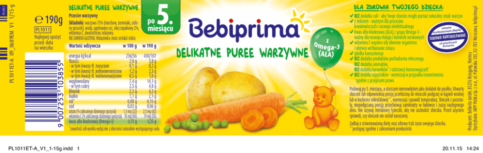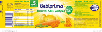 190g PL1011 Najlepiej spożyć przed: data na wieczku 5. Przecier warzywny po Składniki: warzywa 73% (marchew, ziemniaki, zielony groszek), woda, ugotowany ryż, olej rzepakowy 2%, miesiącu witamina C, dwufosforan żelazowy. NIE ZAWIERA GLUTENU. Wskazówka: może zestalać stolce. Wartość odżywcza w 100 g w 190 g energia kJ/kcal 236/56 450/107 tłuszcz 2,0 g 3,8 g - w tym kwasy tł. nasycone 0,1 g 0,2 g - w tym kwasy tł. jednonienasycone 1,2 g 2,3 g - w tym kwasy tł. wielonienasycone 0,5 g 1,0 g węglowodany 7,4 g 14,1 g - w tym cukry 2,5 g 4,8 g błonnik 2,2 g 4,2 g białko 1,1 g 2,1 g sól* 0,08 g 0,15 g sód 0,03 g 0,06 g żelazo (% zalecanego dziennego spożycia) 1,3 mg (22) 2,5 mg (42) witamina C (% zalecanego dziennego spożycia) 10 mg (40) 19 mg (76) kwas alfa-linolenowy (Omega-3) 0,13 g 0,25 g *zawartość soli wynika wyłącznie z obecności naturalnie występującego sodu PL1011ET-A_V1_1-15g.indd 1 DLA ZDROWIA TWOJEGO DZIECKA: DELIKATNE PUREE WARZYWNE BEZ dodatku soli – aby Twoje dziecko mogło poznać naturalny smak warzyw z żelazem – ważnym dla procesów krwiotwórczych i rozwoju intelektualnego starannie składniki wyselekcjonowane kwas alfa-linolenowy (ALA) z grupy Omega-3 – ważny dla rozwoju mózgu i komórek nerwowych SUROWO KONTROLOWANE witamina C wspiera siły obronne organizmu od sprawdzonych dostawców i ułatwia wchłanianie żelaza gładka konsystencja BEZ dodatku produktów pochodzenia mlecznego, BEZ dodatku aromatów, BEZ dodatku barwników* i substancji konserwujących* BEZ dodatku zagęstników – wymieszaj w przypadku rozwarstwienia *zgodnie z przepisami prawa Podawaj po 5. miesiącu, a starszym niemowlętom jako dodatek do posiłku. Otwarty słoiczek lub odpowiednią porcję przełożoną do miseczki podgrzej w kąpieli wodnej lub w kuchence mikrofalowej**, wymieszaj i sprawdź temperaturę. Słoiczek z pozostałą, niepodgrzaną porcją przechowuj zamknięty w lodówce i zużyj następnego dnia. Nie używaj metalowej łyżeczki, aby nie uszkodzić słoiczka. Przed użyciem sprawdź, czy słoiczek nie został naruszony. Zadbaj o zrównoważoną dietę oraz zdrowy tryb życia swojego dziecka. **postępuj zgodnie z zaleceniami producenta Producent: Bebivita GmbH, 85276 Reisgang, Niemcy Dystrybutor: HiPP Polska Sp. z o.o., ul. Puławska 303, 02-785 Warszawa, bebiprima.pl PL1011 PL1011ET-A 09_0689EM V1 1/15-g DELIKATNE PUREE WARZYWNE 20.11.15 14:24