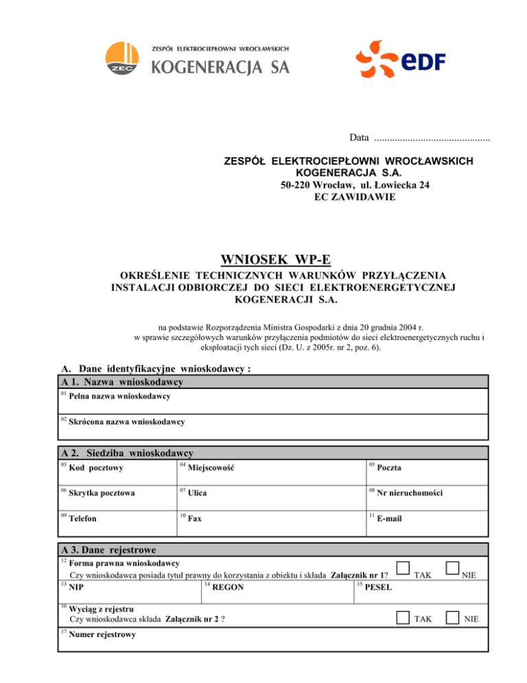 Data ............................................. ZESPÓŁ ELEKTROCIEPŁOWNI WROCŁAWSKICH KOGENERACJA S.A. 50-220 Wrocław, ul. Łowiecka 24 EC ZAWIDAWIE WNIOSEK WP-E OKREŚLENIE TECHNICZNYCH WARUNKÓW PRZYŁĄCZENIA INSTALACJI ODBIORCZEJ DO SIECI ELEKTROENERGETYCZNEJ KOGENERACJI S.A. na podstawie Rozporządzenia Ministra Gospodarki z dnia 20 grudnia 2004 r. w sprawie szczegółowych warunków przyłączenia podmiotów do sieci elektroenergetycznych ruchu i eksploatacji tych sieci (Dz. U. z 2005r. nr 2, poz. 6). A. Dane identyfikacyjne wnioskodawcy : A 1. Nazwa wnioskodawcy 01 Pełna nazwa wnioskodawcy 02 Skrócona nazwa wnioskodawcy A 2. Siedziba wnioskodawcy 03 Kod pocztowy 04 Miejscowość 05 Poczta 06 Skrytka pocztowa 07 Ulica 08 Nr nieruchomości 09 Telefon 10 Fax 11 E-mail A 3. Dane rejestrowe 12 Forma prawna wnioskodawcy Czy wnioskodawca posiada tytuł prawny do korzystania z obiektu i składa Załącznik nr 1? 13 14 15 NIP REGON PESEL 16 17 Wyciąg z rejestru Czy wnioskodawca składa Załącznik nr 2 ? Numer rejestrowy TAK NIE TAK NIE Do użytku służbowego – wypełnia KOGENERACJA S.A. Należy wydać Techniczne Warunki Przyłączenia do sieci energetycznej – ważne 2 lata : TAK NIE B. Informacje dotyczące obiektu : B 1. Lokalizacja obiektu 18 Miejscowość .................................................... Czy wnioskodawca składa Załącznik nr 3 ? 19 20 Ulica 21 Nr działki/działek 23 Rodzaj tytułu prawnego do nieruchomości : 22 Własność TAK NIE Nr nieruchomości Nr Księgi Wieczystej Współwłasność Użytkowanie wieczyste B 1.1. Lokalizacja układu pomiarowego dla obiektu 24 25 Adres Nr nieruchomości B 2. Dane dotyczące obiektu 26 Przeznaczenie 27 Powierzchnia zasilanych pomieszczeń ............................. [m2] 28 Napięcie przyłączenia /Ilość transformatorów …………………….kV ............................. [szt.] B 3. Informacje dotyczące instalacji odbiorczych Parametry obwodów elektrycznych Rodzaj instalacji odbiorczych 1. 2. 3. 4. Instalacje trójfazowe 29 [szt.] 30 [szt.] Materiał instalacji odbiorczych Instalacje jednofazowe 31 Moc największego odbiornika [kW] 32 Inne (ogrzewnictwo) B 4. Zamówiona moc elektryczna Całkowita zamówiona moc elektryczna H 33 P = 1. Odbiorniki jednofazowe 2. Odbiorniki trójfazowe 3. inne Minimalny pobór mocy elektrycznej przy ograniczeniach 34 P1f = 35 P3f = 36 Pi = 37 Pmin = [kW] [kW] [kW] [kW] [kW] – wartość całkowitej mocy zamówionej poz. 33 jest sumą mocy elektrycznych w poz. 34, 35, 36. B 5. Inne źródła zasilania 38 Czy przewidywana jest instalacja zastępczych źródeł zasilania energii elektrycznej? TAK NIE Czy przewidywane do zainstalowania zastępcze źródła zasilania energii elektrycznej będą współpracować z siecią energetyki zawodowej? TAK NIE 40 Proszę podać w dodatkowym załączniku nr 4 do niniejszego wniosku parametry techniczne (napięcie , moc, źródło napędu) zastępczych źródeł zasilania w przypadku zaznaczenia odpowiedzi twierdzącej w poprzednich pytaniach. 39 B 6. Źródła zakłóceń wprowadzanych do sieci. 41 Czy przewidywana jest instalacja urządzeń będących źródłami wprowadzanych zakłóceń do wspólnej sieci? TAK NIE 42 Proszę podać w dodatkowym załączniku nr 5 do niniejszego wniosku wymagania odmienne od standardowych w przypadku zaznaczenia odpowiedzi twierdzącej w poprzednim pytaniu. B 7. Wymagania dotyczące standardowych parametrów technicznych energii elektrycznej lub parametrów jej dostarczania 43 Czy wnioskodawca przewiduje dostawę energii elektrycznej o parametrach innych niż standardowe? TAK NIE 44 Proszę podać w dodatkowym załączniku nr 6 do niniejszego wniosku rodzaj i charakterystykę wprowadzanych zakłóceń w przypadku zaznaczenia odpowiedzi twierdzącej w poprzednim pytaniu. B 8. Informacje dodatkowe 45 Przewidywane roczne zapotrzebowanie na energie elektryczną ............................. [kWh] 46 Audyt energetyczny Czy został przeprowadzony audyt energetyczny obiektu i składam Załącznik nr 7 ? 47 Proponowany przez wnioskodawcę termin rozpoczęcia poboru energii elektrycznej 48 TAK dd /mm/ rrrr ........./......../.............. NIE Ilość składanych załączników ............................. [szt.] ........................................................... ( podpis, pieczęć ) ZAŁĄCZNIKI: 1. Dokument potwierdzający uregulowany status wnioskodawcy w zakresie tytułu prawnego do korzystania z nieruchomości (własność, współwłasność, użytkowanie wieczyste) oraz obiektu, do którego będzie dostarczana energia elektryczna; 2. Wyciąg z rejestru (wg. pkt. A 3.); 3. Plan zabudowy bądź szkic sytuacyjny obiektu, do którego będzie dostarczana energia elektryczna, w stosunku do istniejącej sieci elektroenergetycznej oraz innych obiektów i urządzeń uzbrojenia terenu, z zaznaczoną lokalizacją układu pomiaroworozliczeniowego energii elektrycznej w obiekcie (pkt. B 1.1.); 4. Inne źródła zasilania (pkt. B 540.); 5. Źródła zakłóceń wprowadzanych do sieci. (pkt. B 642.); 6. Wymagania dotyczące standardowych parametrów technicznych energii elektrycznej lub parametrów jej dostarczania (pkt. B744.); 7. Wynik audytu energetycznego.