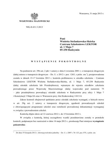 Warszawa, 31 maja 2013 r. WOJEWODA MAZOWIECKI WK-II.431.5.2013 Pani Wioletta Stefankowska-Skórka Centrum Szkoleniowe LEKTOR ul. 1 Maja 7 05-250 Radzymin W Y S T Ą P I E N I E P O K O N T R O L N E Na podstawie art. 39h ust. 2 pkt 1 ustawy z dnia 6 września 2001 r. o transporcie drogowym (dalej ustawa o transporcie drogowym – Dz. U. z 2012 r. poz. 1265, z późn. zm.1), przeprowadzona została w dniach 15-17 kwietnia 2013 r. kontrola problemowa w ośrodku szkolenia – Centrum Szkoleniowe LEKTOR Wioletta Stefankowska-Skórka, ul. 1 Maja 7, 05-250 Radzymin (dalej ośrodek szkolenia lub Przedsiębiorca), wpisanym do rejestru ośrodków szkolenia prowadzonego przez Wojewodę Mazowieckiego (dalej wojewoda) pod numerem 75 – jako przedsiębiorca prowadzący ośrodek szkolenia w Radzyminie przy ulicy 1 Maja 7 i Konstytucji 3 Maja 8A oraz w Warszawie przy Alei Krakowskiej 110/114. Zakres kontroli obejmował spełnianie przez ośrodek szkolenia wymagań, o których mowa w art. 39g ust. 2 ustawy o transporcie drogowym, zgodność prowadzonych szkoleń z obowiązującymi programami szkoleń oraz rzetelność prowadzonej dokumentacji wymaganej w związku z prowadzeniem szkoleń. Kontrolą objęto okres od 12 czerwca 2012 r. do 15 kwietnia 2013 r. W związku z kontrolą, której szczegółowe wyniki przedstawione zostały w protokole kontroli, podpisanym bez zastrzeżeń w dniu 14 maja 2013 r., przekazuję Pani niniejsze wystąpienie pokontrolne. 1 Do dnia 19 listopada 2012 r. obowiązywał tekst jednolity – Dz. U. z 2007 r. Nr 125, poz. 874, z późn. zm. Zgodnie z zaświadczeniem Starosty Wołomińskiego z dnia 22 sierpnia 2012 r., Nr WKM.5440.1.59.2012.MS – przedsiębiorca prowadzący Centrum Szkoleniowe LEKTOR wpisany został pod numerem 00331434 do rejestru przedsiębiorców prowadzących ośrodek szkolenia kierowców pod poniższymi adresami: – ul. 1 Maja 7 w Radzyminie – biuro, sala wykładowa i plac manewrowy, – ul. Myśliwska 2 w Nieporęcie – plac manewrowy, natomiast zgodnie z zaświadczeniem Prezydenta Miasta Stołecznego Warszawy z dnia 11 stycznia 2013 r., Nr AO-II.5440.1.7.2013.TPY – Centrum Szkoleniowe LEKTOR wpisane zostało pod numerem 06941465 do rejestru przedsiębiorców prowadzących ośrodek szkolenia kierowców w Warszawie przy Al. Krakowskiej 110/114 lok. 212. W toku kontroli ustalono, że zajęcia teoretyczne oraz praktyczne, w tym z jazdy w warunkach specjalnych, przeprowadzone zostały przez osoby posiadające odpowiednie uprawnienia. Ośrodek szkolenia dysponował odpowiednimi warunkami lokalowymi i wyposażeniem dydaktycznym umożliwiającym prawidłową realizację szkoleń oraz obsługę osób szkolonych, zgodnie z § 3 ust. 1 pkt 1 i 4 rozporządzenia Ministra Infrastruktury z dnia 27 października 2005 r. w sprawie szkolenia, egzaminowania i uzyskiwania uprawnień przez kierujących pojazdami, instruktorów i egzaminatorów (dalej rozporządzenie w sprawie szkolenia, egzaminowania i uzyskiwania uprawnień przez kierujących pojazdami, instruktorów i egzaminatorów – Dz. U. Nr 217, poz. 1834, z późn. zm.2), § 3 ust. 1 pkt 1 i 2 oraz ust. 3 rozporządzenia Ministra Transportu, Budownictwa i Gospodarki Morskiej z dnia 13 lipca 2012 r. w sprawie szkolenia osób ubiegających się o uprawnienia do kierowania pojazdami, instruktorów i wykładowców (dalej rozporządzenie w sprawie szkolenia osób ubiegających się o uprawnienia do kierowania pojazdami, instruktorów i wykładowców – Dz. U. z 2012 r., poz. 1019), oraz § 3 ust. 1 pkt 2 rozporządzenia Ministra Infrastruktury z dnia 1 kwietnia 2010 r. w sprawie szkolenia kierowców wykonujących przewóz drogowy (dalej rozporządzenie w sprawie szkolenia kierowców wykonujących przewóz drogowy – Dz. U. Nr 53, poz. 314, z późn. zm.). Przedsiębiorca posiadał plac manewrowy umożliwiający realizację szkoleń, który spełniał wymagania określone w § 3 ust. 1 pkt 2 lit. b oraz § 4 rozporządzenia w sprawie szkolenia, egzaminowania 2 i uzyskiwania uprawnień przez kierujących pojazdami, instruktorów Rozporządzenie zostało uchylone z dniem 19 stycznia 2013 r. w związku z wejściem w życie art. 125 pkt 10 lit. g ustawy z dnia 5 stycznia 2011 r. o kierujących pojazdami (Dz. U. Nr 30, poz. 151, z późn. zm.) oraz rozporządzenia Ministra Transportu, Budownictwa i Gospodarki Morskiej z dnia 13 lipca 2012 r. w sprawie szkolenia osób ubiegających się o uprawnienia do kierowania pojazdami, instruktorów i wykładowców (Dz. U. z 2012 r., poz. 1019). 2 i egzaminatorów, oraz § 3 ust. 1 pkt 3 rozporządzenia w sprawie szkolenia osób ubiegających się o uprawnienia do kierowania pojazdami, instruktorów i wykładowców, a ponadto dysponował pojazdami odpowiednimi do zakresu prowadzonego szkolenia, które spełniały wymagania, o których mowa w § 3 ust. 1 pkt 3 oraz ust. 5 rozporządzenia w sprawie szkolenia, egzaminowania i uzyskiwania uprawnień przez kierujących pojazdami, instruktorów i egzaminatorów oraz w § 4 rozporządzenia w sprawie szkolenia kierowców wykonujących przewóz drogowy. Jazdę w warunkach specjalnych zapewniono przy użyciu urządzenia technicznego do symulowania jazdy w warunkach specjalnych, które posiadało certyfikat, o którym mowa w art. 39g ust. 11 pkt 2 ustawy o transporcie drogowym. Przedsiębiorca posiadał programy szkolenia wraz z planami ich wykonania oraz metodami nauczania obejmujące tematykę realizowaną podczas kursu kwalifikacyjnego w ramach kwalifikacji wstępnej, kwalifikacji wstępnej przyspieszonej, kwalifikacji wstępnej uzupełniającej, kwalifikacji wstępnej uzupełniającej przyspieszonej – w zakresie bloków programowych dla prawa jazdy kategorii C, C+E, C1, C1+E oraz D, D+E, D1, D1+E, oraz programy szkolenia wraz z planami ich wykonania oraz metodami nauczania dotyczące szkoleń okresowych odpowiednio dla prawa jazdy kategorii C, C+E, C1, C1+E oraz D, D+E, D1, D1+E. Programy te były tożsame z programami złożonymi do