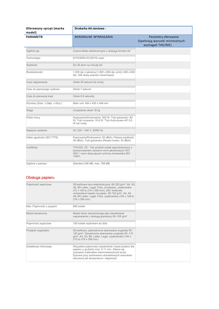 Oferowany sprzęt (marka model) PARAMETR Drukarka A4 sieciowa MINIMALNE WYMAGANIA Ogólnie typ Czarno-Białe wielofunkcyjne z obsługą formatu A4 Technologia KYOCERA ECOSYS Laser Szybkość Do 35 stron na minutę A4 Rozdzielczość 1,200 dpi z jakością (1,800 x 600 dpi, print), 600 x 600 dpi, 256 skalą szarości (skan/kopia) Czas nagrzewania Około 20 sekund lub mniej Czas do pierwszego wydruku Około 7 sekund Czas do pierwszej kopii Około 6.9 sekundy Wymiary (Szer. x Głęb. x Wys.) Main unit: 494 x 430 x 448 mm Waga Urządzenie około 18 kg Pobór mocy Kopiowanie/Drukowanie: 502 W, Tryb gotowości: 84 W, Tryb czuwania: 10.6 W, Tryb Auto-power-off: 0,5 W lub mniej Napięcie zasilania AC 220 ~ 240 V, 50/60 Hz Hałas zgodność (ISO 7779) Kopiowanie/Drukowanie: 55 dB(A), Połowa prędkości: 49 dB(A), Tryb gotowości (Ready-mode): 30 dB(A) Certifikaty TÜV/GS, CE - Ten produkt został wyprodukowany z poszanowaniem zarówno norm jakościowych ISO 9001 i norm dotyczących ochrony środowiska ISO 14001. Ogólnie o pamięci Standard 256 MB, max. 768 MB Obsługa papieru Pojemność wejsciowa 50-kartkowa taca wielofunkcyjna, 60-220 g/m², A4, A5, A6, B5 Letter, Legal, Folio, envelopes, użytkownika (70 x 148 to 216 x 356 mm); 250- kartkowa uniwerslana kaseta na papier, 60-120 g/m², A4, A5, A6, B5 Letter, Legal, Folio, użytkownika (105 x 148 to 216 x 356 mm) Max. Pojemność z opcjami 800 kartek Moduł dwustronny Moduł druku dwustronnego jako standartowe wyposażenie z obsługą gramatury 60–105 g/m² Pojemność wyjściowa 150 kartek wydrukiem do dołu Podajnik oryginałów 50-kartkowy, jednostronne skanowane oryginały 50– 120 g/m², Dwustronnie skanowane oryginały 50–110 g/m², A4, A5, B5, Letter, Legal, użytkownika (140 x 210 to 216 x 356 mm) Dodatkowe informacje Wszystkie pojemności zasobników i kaset podano dla papieru o grubości max. 0.11 mm. Zaleca się używanie materiałów rekomnedowanych przez Kyocera przy zachowaniu standartowych warunków otoczenia jak temperatura i wilgotność. Parametry oferowane: (Spełniają warunki minimalnych wymagao TAK/NIE) Drukowanie Emulacje PCL6 (5c/XL), KPDL 3 (PostScript 3 compatible), Line Printer, IBM Proprinter X24E, Epson LQ-850, Diablo 630, PDF Direct Print, XPS Direct Print (wymaga rozszerzenia pamięci) Dodatkowe możliwości drukowanie wydruk bezpośredni kodowanych PDF , IPP printing, e-mail printing, WSD print, bezpieczny wydruk via SSL, IPsec, SNMPv3 i Wydruk Poufny Obsługiwane Systemy Operacyjne (Wydruk) Wszystkie aktualnie systemy Windows, Mac OS X Version 10.4 i wyższe, UNIX, LINUX, pozostałe inne w zależności od potrzeb. Kopiowanie Max. Rozmiar oryginału A4 Dodatkowe możliwości kopiowanie elektroniczne sortowanie, program kopiowanie ID, rezrwacja zadania, priorytetowy wydruk,dwustronne kopiowanie, łaczenie prac, skanowanie ciągłe, automatyczna zmiana kaset, kontrola intesywności kopii Wbudowane zakresy powiększenia i pomniejszenia Auto, ręczny Zakres zoom-u 25 - 400 % z krokiem co 1% Skanowanie Typ pliku PDF, JPG, TIFF, XPS Dodatkowo o skanowaniu Kolorowy skan, zintegrowana książka adresowa, obsługa Active Directory, kodowany transfer danych, (e-mail, fax, SMB/FTP folder) Rozpoznawanie oryginału Text, Photo, Text + Photo, OCR Max. Rozmiar skanu A4 Funkcjonalności skanera -skanowanie do: e-mail, FTP ,SMB, USB Host, TWAIN (USB), Rozdzielczość skanera 200- 600 dpi Fax Szybkość modemu Max. 33.6 kbps Szybkość skanowania 2.5 sekundy lub mniej Szybkość transmisji 3 sekundy lub mniej Max. Rozmiar oryginału A4 Skanowanie do e-mail, ftp, folder, smb, Wbudowane lub przez zewnętrzną aplikację Dodatkowo o Faxie Sieciowy fax, Duplex fax transmisja i odbiór w tym samym czasie, kodowana transmisja i odbiór, Wdzwaniana transmisja i odbiór, Rozsyłnie grupowe, Odbiór do pamięci Rozmowa Wbudowane urządzenie głośnomówiące (mikrofon/głośnik) lub słuchawka stanowiąca pasujący element urządzenia. Interfejsy Standardowy interfejs USB 2.0 (Hi-Speed), USB Host, Fast Ethernet 10/100Base-TX, Gwarancja 2 lata gwarancji na urządzenie bez żadnych dodatkowych kosztów konserwacyjnych. 2 lata na kluczowe podzespoły : bęben i moduł developera, przy założeniu wydrukowania 100 000 stron w ciągu trwania gwarancji