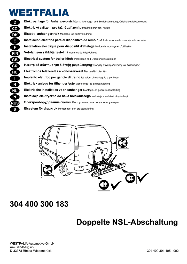 Elektroanlage für Anhängevorrichtung Montage- und Betriebsanleitung, Originalbetriebsanleitung Elektrické zařízení pro tažné zařízení Montážní a provozní návod Elsæt til anhængertræk Montage- og driftsvejledning Instalación eléctrica para el dispositivo de remolque Instrucciones de montaje y de servicio Installation électrique pour dispositif d'attelage Notice de montage et d'utilisation Vetolaitteen sähköjärjestelmä Asennus- ja käyttöohjeet Electrical system for trailer hitch Installation and Operating Instructions Ηλεκτρικό σύστημα για διάταξη ρυμούλκησης Οδηγίες συναρμολόγησης και λειτουργίας Elektromos felszerelés a vonószerkezet Beszerelési utasítás Impianto elettrico per gancio di traino Istruzioni di montaggio e per l'uso Elektrisk anlegg for tilhengerfeste Monterings- og bruksanvisning Elektrische installaties voor aanhanger Montage- en gebruikshandleiding Instalacja elektryczna do haka holowniczego Instrukcja montażu i eksploatacji Электрооборудование сцепки Инструкция по монтажу и эксплуатации Elsystem för dragkrok Monterings- och bruksanvisning 304 400 300 183 Doppelte NSL-Abschaltung WESTFALIA-Automotive GmbH Am Sandberg 45 D-33378 Rheda-Wiedenbrück 304 400 391 105 - 002 2 304 400 391 105 - 002 304 400 391 105 - 002 3 hvit wit biały белый vit zwart czarno черный svart white black svart valkoinen musta bianco blanc noir nero blanco negro fehér hvid sort fekete bílá černo λευκό weiß schwarz μαύρο wh bk zielony groen grønn verde zöld πράσινο green vihreä vert verde grøn zelená grün gn brun grön коричневый зеленый brązowo bruin brun marrone barna καφέ brown ruskea marron marrón brun hnědá braun bn grå серый szaro grijs grå grigio szürke γκρι grey harmaa gris gris grå šedo grau gy röd красный czerwony rood rød rosso piros κόκκινο red punainen rouge rojo rød červená rot rd gul желтый żółty geel gul giallo sárga κίτρινο yellow keltainen jaune amarillo gul žlutá gelb ye oranje oransje arancione narancssárga πoρτoκαλί orange oranssi orange anaranja-do orange oranžový orange or blå гoлубoй orange opaнжевый niebieski pomaraʼnczowe blauw blå blu kék μπλε blue sininen bleu azul blå modrý blau bu violett пуpпуpный fioletowe violet fiolett viola ibolyakék Mωβ purple violetti violet violeta violet fialový violett pu Nationale Richtlinien über die Anbauabnahmen sind zu beachten. Vor Arbeitsbeginn die Einbauanleitung lesen. Die Elektroanlage für Anhängevorrichtung darf nur von Fachunternehmen montiert werden. Bei falscher Montage besteht schwere Unfallgefahr! Achtung – vor Arbeitsbeginn den Fehlerspeicher auslesen, ggf. Ruhestrom-Erhaltungsgerät verwenden, ansonsten können elektronisch gespeicherten Daten verloren gehen. Batterie abklemmen, um Beschädigungen der KFZ- Elektronik zu vermeiden. Leitungen dürfen weder eingeklemmt noch beschädigt sein. Alle Dichtungselemente ordnungsgemäß anbringen. Bei Anhängerbetrieb wird die Nebelschlussleuchte des Zugfahrzeugs abgeschaltet. Die Prüfung der Anhängerfunktionen mit einem Anhänger oder einem Prüfgerät mit Belastungswiderständen durchführen. Der deutsche Text dieser Anleitung ist bindend. Änderungen vorbehalten. Je nutné dodržovat místní směrnice o demontáži nástaveb. Před zahájením práce si prostudujte návod k montáži. Elektrické zařízení pro tažné zařízení smí montovat pouze odborné podniky. Při chybné montáži hrozí vážné nebezpečí nehody! Pozor – před zahájením práce načtěte paměť chyb, popř. použijte zařízení pro udržení klidového proudu, jinak můžete ztratit elektronicky uložená data. Odpojte akumulátorovou baterii, aby nedošlo k poškození elektronické soustavy vozidla. Vodiče nesmí být sevřené ani poškozené. Všechny těsnicí prvky náležitě namontujte. Při provozu s tažným zařízením se vypne koncové světlo do mlhy na tažném vozidle. Kontrolu funkcí přívěsu provádějte pomocí přívěsu nebo vhodného kontrolního přístroje se zatěžovacími odpory. Německý text tohoto návodu je závazný. Změny vyhrazeny. De nationale direktiver for montering af tilbehør skal overholdes. Læs monteringsvejledningen inden påbegyndelse af arbejdet. Elsættet til anhængertrækket må kun monteres af kvalificeret personel. Ved forkert montering er der fare for alvorlige fejlfunktioner! Bemærk – udlæs fejlloggen inden påbegyndelse af arbejdet, anvend evt. apparat til opretholdelse af hvilestrøm, ellers kan elektronisk lagrede data gå tabt. Frakobl batteriet for at undgå beskadigelse af personbilens elektronik. Ledningerne må ikke hverken blive klemt eller beskadiget. Alle tætningselementerne skal anbringes efter forskrifterne. Ved brug af anhængerens elstik frakobles trækkøretøjets tågebaglygte. Kontrol af anhængerfunktionerne skal foretages med en anhænger eller et kontrolapparat med belastningsmodstand. Den tyske tekst i denne vejledning er bindende. Ret til ændringer forbeholdes. Deben respetarse las directivas nacionales referentes a controles de enganches. Antes de iniciar la tarea, lea las instrucciones de montaje. La instalación eléctrica para el dispositivo de remolque sólo debe montarla personal cualificado. ¡En caso de montaje erróneo existe peligro de accidentes graves! Atención – antes de iniciar la tarea, leer la memoria de fallos, si es necesario utilizar un dispositivo de mantenimiento de corriente de reposo, de lo contrario podría perder los datos memorizados electrónicamente. Desconecte la batería para evitar daños en la instalación eléctrica del vehículo. Se debe evitar dañar o aprisionar los cables. Instalar correctamente todas las juntas. Al circular con remolque se desconec