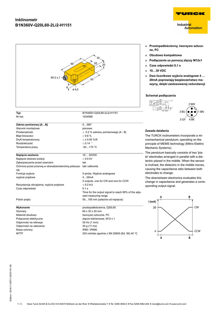 Inklinometr B1N360V-Q20L60-2Li2-H1151 ■ Prostopadłościenny, tworzywo sztuczne, PC ■ Obudowa kompaktowa ■ Podłączenie za pomocą złączy M12x1 ■ Czas odpowiedzi 0,1 s ■ 10…30 VDC ■ Dwa licznikowe wyjścia analogowe 4 … 20mA poprawiają bezpieczeństwo maszyny, dzięki zastosowanej redundancji Schemat podłączenia Typ Nr kat. B1N360V-Q20L60-2Li2-H1151 1534068 Zakres pomiarowy [A…B] Warunki montażowe Powtarzalność Błąd liniowości Dryft temperaturowy Rozdzielczość Temperatura pracy 0…360° pionowo ð 0.2 % zakresu pomiarowego |A - B| ð 0.6 % ð ± 0.05 %/K ð 0.14 ° -30…+70 °C Napięcie zasilania Napięcie testowe izolacji Zabezpieczenie przed zwarciem Ochrona przed przerwą w obwodzie/odwrotną polaryzacją Funkcja wyjścia wyjście prądowe 10… 30VDC ð 0.5 kV tak tak/ całkowita Pobór prądu 5 pinów, Wyjście analogowe 4…20mA 2 outputs, one for CW and one for CCW ð 0.2 kò 0.1 s Time for the output signal to reach 90% of the adjusted measuring range 50…105 mA (zależnie od napięcia) Wykonanie Wymiary Materiał obudowy Połączenie elektryczne Odporność na wibracje Odporność na uderzenia Klasa ochrony MTTF prostopadłościenna, Q20L60 60 x 30 x 20 mm tworzywo sztuczne, PC złącze kołnierzowe, M12 x 1 55 Hz (1 mm) 30 g (11 ms) IP68 / IP69K 203 rok/lata zgodnie z SN 29500 (Ed. 99) 40 °C The TURCK inclinometers incorporate a micromechanical pendulum, operating on the principle of MEMS technology (Mikro Elektro Mechanic Systems). The pendulum basically consists of two 'plate' electrodes arranged in parallel with a dielectric placed in the middle. When the sensor is inclined, the dielectric in the middle moves, causing the capacitance ratio between both electrodes to change. The downstream electronics evaluates this change in capacitance and generates a corresponding output signal. Edition • 2016-11-09T11:09:57+01:00 Rezystancja obciążenia, wyjście prądowe Czas odpowiedzi Zasada działania 1/3 Hans Turck GmbH & Co.KG ñ D-45472 Mülheim an der Ruhr ñ Witzlebenstraße 7 ñ Tel. 0208 4952-0 ñ Fax 0208 4952-264 ñ [email protected] ñ www.turck.com Inklinometr B1N360V-Q20L60-2Li2-H1151 Instrukcja montażu / Opis Kąt nachylenia Nastawa zakresu pomiarowego za pomocą adaptera TX1-Q20L60 Nastawa zakresu kąta zgodnie ze wskazówkami zegara: ■ Ustawić czujnik w pozycji początkowej ■ Nacisnąć i przytrzymać przycisk uczący (zwarcie do masy) dopóki wyjście nie zmieni wartości na 4 mA (ok. 1 s) ■ Ustawić czujnik w pozycji końcowej ■ Nacisnąć i przytrzymać przycisk uczący (zwarcie do masy) dopóki wyjście nie zmieni wartości na 20 mA (ok. 3 s) Ponowne ustawianie zakresu kąta: ■ Nacisnąć i przytrzymać przycisk uczący (zwarcie do masy) dopóki wyjście nie zmieni wartości na 12 mA (ok. 6 s) ■ Kąt pomiarowy powraca do zakresu 360° (w pozycji "złączem w dół" czujnik zapewnia sygnał wyjściowy Edition • 2016-11-09T11:09:57+01:00 dla 0°) 2/3 Hans Turck GmbH & Co.KG ñ D-45472 Mülheim an der Ruhr ñ Witzlebenstraße 7 ñ Tel. 0208 4952-0 ñ Fax 0208 4952-264 ñ [email protected] ñ www.turck.com Inklinometr B1N360V-Q20L60-2Li2-H1151 Akcesoria montażowe Typ Nr kat. IM43-13-SR 7540041 Rysunek wymiarowy Kontroler wartości granicznych; jeden kanał; wejście 0/4…20 mA lub 0/2…10 V; zasilanie przetworników/czujników 2- lub 3-przewodowych; wartość graniczna ustawiana za pomocą przycisku teach; trzy wyjścia przekaźnikowe ze stykami normalnie otwartymi; zdejmowalne terminale zaciskowe; szerokość 27 mm; uniwersalne napięcie zasilania 20…250 VUC; inne kontrolery wartości granicznych opisane są w katalogu "Interfejsy modułowe". SG-Q20L60 6901100 Obudowa dla inklinometru serii Q20L60; dodatkowa ochrona przed uszkodzeniem mechanicznym; materiał: Stal nierdzewna TX1-Q20L60 6967114 Adapter uczący dla enkoderów indukcyjnych, czujników przemieszczenia liniowego i kątowego oraz czujników ultradźwię- Edition • 2016-11-09T11:09:57+01:00 kowych i pojemnościowych 3/3 Hans Turck GmbH & Co.KG ñ D-45472 Mülheim an der Ruhr ñ Witzlebenstraße 7 ñ Tel. 0208 4952-0 ñ Fax 0208 4952-264 ñ [email protected] ñ www.turck.com