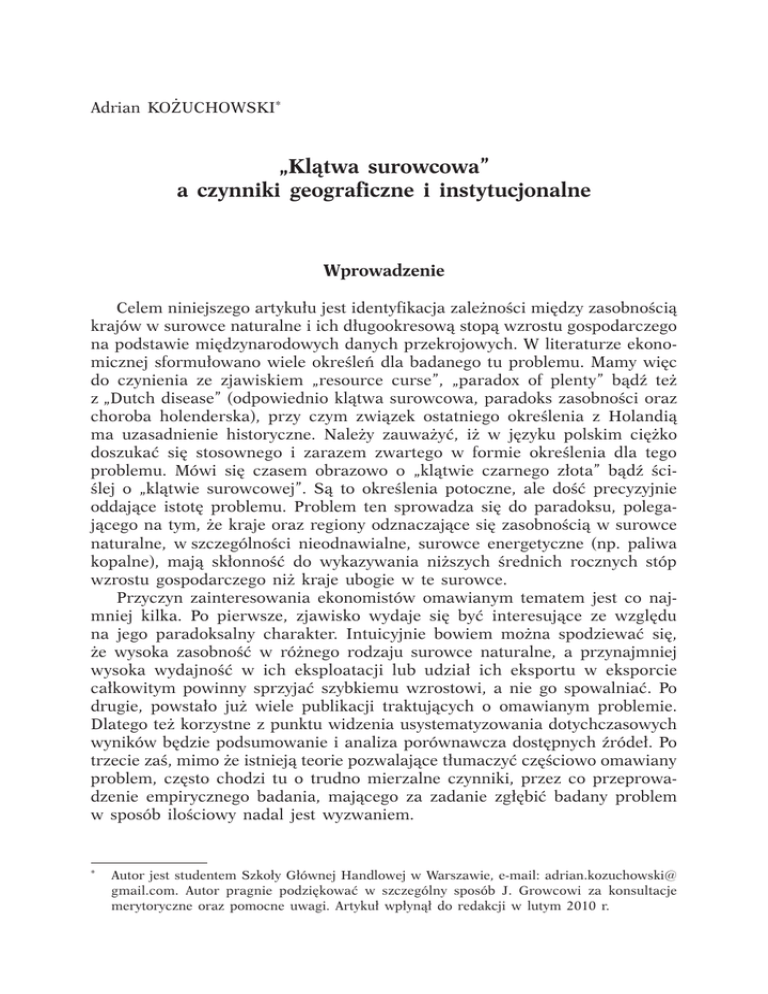 Adrian KOŻUCHOWSKI* „Klątwa surowcowa” a czynniki geograficzne i instytucjonalne Wprowadzenie Celem niniejszego artykułu jest identyfikacja zależności między zasobnością krajów w surowce naturalne i ich długookresową stopą wzrostu gospodarczego na podstawie międzynarodowych danych przekrojowych. W literaturze ekonomicznej sformułowano wiele określeń dla badanego tu problemu. Mamy więc do czynienia ze zjawiskiem „resource curse”, „paradox of plenty” bądź też z „Dutch disease” (odpowiednio klątwa surowcowa, paradoks zasobności oraz choroba holenderska), przy czym związek ostatniego określenia z Holandią ma uzasadnienie historyczne. Należy zauważyć, iż w języku polskim ciężko doszukać się stosownego i zarazem zwartego w formie określenia dla tego problemu. Mówi się czasem obrazowo o „klątwie czarnego złota” bądź ściślej o „klątwie surowcowej”. Są to określenia potoczne, ale dość precyzyjnie oddające istotę problemu. Problem ten sprowadza się do paradoksu, polegającego na tym, że kraje oraz regiony odznaczające się zasobnością w surowce naturalne, w szczególności nieodnawialne, surowce energetyczne (np. paliwa kopalne), mają skłonność do wykazywania niższych średnich rocznych stóp wzrostu gospodarczego niż kraje ubogie w te surowce. Przyczyn zainteresowania ekonomistów omawianym tematem jest co najmniej kilka. Po pierwsze, zjawisko wydaje się być interesujące ze względu na jego paradoksalny charakter. Intuicyjnie bowiem można spodziewać się, że wysoka zasobność w różnego rodzaju surowce naturalne, a przynajmniej wysoka wydajność w ich eksploatacji lub udział ich eksportu w eksporcie całkowitym powinny sprzyjać szybkiemu wzrostowi, a nie go spowalniać. Po drugie, powstało już wiele publikacji traktujących o omawianym problemie. Dlatego też korzystne z punktu widzenia usystematyzowania dotychczasowych wyników będzie podsumowanie i analiza porównawcza dostępnych źródeł. Po trzecie zaś, mimo że istnieją teorie pozwalające tłumaczyć częściowo omawiany problem, często chodzi tu o trudno mierzalne czynniki, przez co przeprowadzenie empirycznego badania, mającego za zadanie zgłębić badany problem w sposób ilościowy nadal jest wyzwaniem. * Autor jest studentem Szkoły Głównej Handlowej w Warszawie, e-mail: adrian.kozuchowski@ gmail.com. Autor pragnie podziękować w szczególny sposób J. Growcowi za konsultacje merytoryczne oraz pomocne uwagi. Artykuł wpłynął do redakcji w lutym 2010 r. 22 GOSPODARKA NARODOWA Nr 4/2010 Innym, jednak niemniej ważnym powodem podjęcia próby opisania badanego zjawiska w sposób syntetyczny są konkretne przykłady krajów lub ich grup, których długookresowy wzrost gospodarczy na przestrzeni różnych okresów czasu, w zestawieniu z ich zasobnością w surowce naturalne, daje wyraźne dowody na istnienie badanego paradoksu. Mowa tu m.in. o tzw. krajach naftowych, takich jak państwa znad Zatoki Perskiej, jak również Wenezuela, Meksyk czy Nigeria, o których mimo niezaprzeczalnej zasobności w ropę naftową nie da się powiedzieć, by doświadczyły gwałtownego, ponadprzeciętnego wzrostu w jakimkolwiek okresie swojej najnowszej historii (por. [Sachs, Warner, 2001]). Klasyczne przykłady stanowią również Hiszpania oraz Holandia i ich sytuacja w wieku XVII, kiedy to Holandia wykazywała się lepszą sytuacją gospodarczą m.in. w wymiarze wzrostu gospodarczego, mimo iż to Hiszpania zbierała znaczne korzyści z eksportu złota oraz srebra z obszarów kolonialnych. Analogicznych przykładów możemy doszukać się również na przestrzeni wieków XIX oraz XX, kiedy to Szwajcaria i Japonia, mimo surowcowego „ubóstwa”, wyraźnie wyprzedziły kraje będące wówczas największymi eksporterami surowców, do których należała np. Rosja. Natomiast ostatnie trzydziestolecie XX w. to wyraźny przykład krajów Azji Wschodniej (Tajwan, Hongkong, Korea Płd., Singapur), które stały się światowymi liderami pod względem wzrostu gospodarczego, podczas gdy kraje bogate w surowce, w tym najwięksi eksporterzy ropy naftowej – Wenezuela, Meksyk, Nigeria – wykazywały często nawet poważne problemy w wypłacalnością. Historia pokazała, iż istnieje miejsce dla teorii ekonomicznych, obalających znaczenie gospodarki surowcowej w kontekście jej międzynarodowej konkurencyjności. Co więcej, z punktu widzenia badań empirycznych, wykazuje się ujemną zależność między zasobnością w surowce a wzrostem gospodarczym. W świetle powyższych rezultatów, wartością dodaną niniejszego artykułu jest wykorzystanie dotychczas niezestawianych ze sobą w badaniach klątwy surowcowej zestawów danych, uwzględniających zmienne kontrolne o charakterze geograficznym oraz instytucjonalnym. Takie unikalne zestawienie pozwala pokazać, w jakim stopniu za występowanie zjawiska klątwy surowcowej odpowiedzialne są zmienne z tych dwu grup charakterystyk. Za krokiem tym przemawia zarówno logiczne rozumowanie w miarę doszukiwania się przyczyn zjawiska klątwy surowcowej, jak również relatywnie niewielka dostępność danych o charakterze instytucjonalnym, przez co w wielu publikacjach są one pomijane na rzecz zmiennych powszechniej dostępnych lub bezpośrednio mierzalnych. Struktura artykułu jest następująca. W kolejnej części omówione zostaną publikacje i badania innych autorów na przestrzeni ostatnich lat. Następnie Odwrotne zjawisko występowało natomiast w historii krajów wysoko rozwiniętych: Wielka Brytania, Niemcy czy Stany Zjednoczone pod koniec XIX w. wykazywały ponadprzeciętne stopy wzrostu, na które niewątpliwie wpływ miało dynamiczne wydobycie surowców (rud żelaza, węgla kamiennego) w tamtym okresie. Później jednak, ze względu na malejącą dostępność surowców, surowce przestały już odgrywać decydującą rolę w generowaniu wzrostu gospodarczego. Adrian Kożuchowski, „Klątwa suro