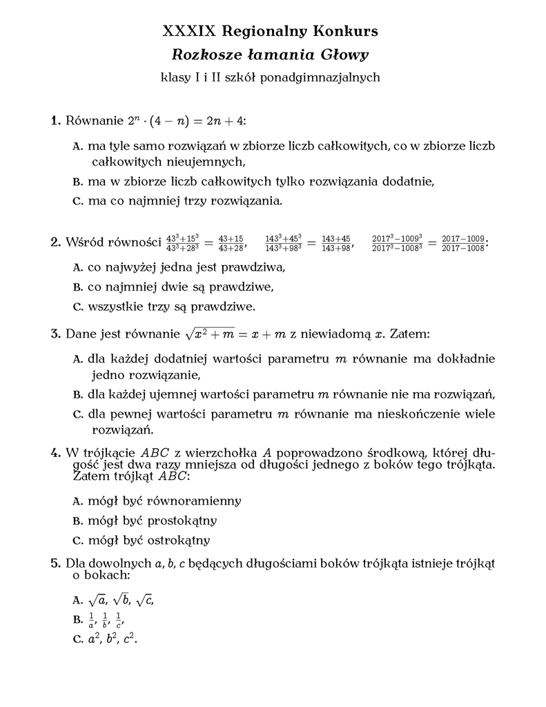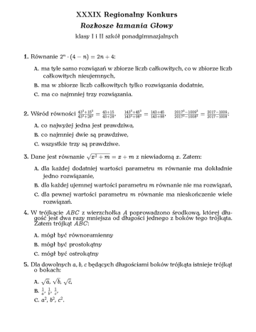 XXXIX Regionalny Konkurs Rozkosze łamania Głowy klasy I i II szkół ponadgimnazjalnych 1. Równanie 2n (4 n) = 2 n + 4: A. ma tyle samo rozwiązań w zbiorze liczb całkowitych, co w zbiorze liczb całkowitych nieujemnych, B. ma w zbiorze liczb całkowitych tylko rozwiązania dodatnie, C. ma co najmniej trzy rozwiązania. +15 2. Wśród równości 43 433 +283 3 3 = 43+15 43+28 , 14333 +4533 143 +98 = 143+45 143+98 , 201733 100933 2017 1008 = 2017 1009 2017 1008 : A. co najwyżej jedna jest prawdziwa, B. co najmniej dwie są prawdziwe, C. wszystkie trzy są prawdziwe. 3. Dane jest równanie p x 2 + m = x + m z niewiadomą x. Zatem: A. dla każdej dodatniej wartości parametru m równanie ma dokładnie jedno rozwiązanie, B. dla każdej ujemnej wartości parametru C. dla pewnej wartości parametru m m równanie nie ma rozwiązań, równanie ma nieskończenie wiele rozwiązań. 4. W trójkącie ABC z wierzchołka A poprowadzono środkową, której długość jest dwa razy mniejsza od długości jednego z boków tego trójkąta. Zatem trójkąt ABC : A. mógł być równoramienny B. mógł być prostokątny C. mógł być ostrokątny 5. Dla dowolnych a, b, c będących długościami boków trójkąta istnieje trójkąt o bokach: A. p ,p,p, a b B. a1 , 1b , 1c , C. a2 , b2 , c2 . c 6. Funkcja liniowa f spełnia warunek f (0) f (2016) + f (1) = 59. Suma + f (1) + f (2) + : : : + f (2017) jest: A. liczbą naturalną o co najmniej czterech dzielnikach naturalnych, B. liczbą naturalną o dokładnie trzech dzielnikach naturalnych, C. liczbą większą niż 60000. 7. W prostokątnym układzie współrzędnych zaznaczono trzy niewspółliniowe punkty A; B; C . . Jeżeli A1 ; B1 ; C1 są obrazami punktów A; B; C w: A. symetrii względem osi Ox to figura 4 ABC [4 1 1 1 może być tra- A B C pezem równoramiennym, to pole figury 4ABC może być dwa razy większe od pola trójkąta ABC , B. symetrii względem prostej y = 2x, [4 C. symetrii względem początku układu współrzędnych to figura 4 1 1 1 może być równoległobokiem. 2017 2017 2017 8. Niech S = 2017 12 + 23 + 34 + ::: + 20162017 . Wówczas: 1 1 1 A B C 4 ABC [ A B C A. S jest liczbą całkowitą większą niż 2015, B. S jest liczbą większą niż 2016, C. S jest liczbą wymierną, ale nie jest liczbą całkowitą. 9. Dane są liczby pierwsze p; q , gdzie p > q > 3. Wówczas: 2 + q 2 możne mieć dokładnie 4 dzielniki, 2 B. różnica p2 q jest podzielna przez 12, 2 C. p2 pq + q możne być liczbą złożoną. A. p 10. W pewnych wyścigach żużlowych było tylu zawodników ile wszystkich biegów (w każdym biegu startowało czterech zawodników), przy czym każdy z zawodników zmierzył się z każdym z pozostałych zawodników tylko w jednym biegu. Wtedy: A. każdy z zawodników startował w parzystej liczbie biegów, B. liczba wszystkich biegów musiała być podzielna przez 4, C. gdyby podwoić liczbę zawodników, to przynajmniej dwóch zawodni- ków musiałoby się spotkać w przynajmniej dwóch biegach. 11. W pewnym klubie liczącym 42 członków, 24 lubi rozwiązywać krzyżówki, 24 lubi rozwiązywać sudoku, 24 lubi rozwiązywać kakuro. Wszystkich uczestników klubu można podzielić na siedem rozłącznych grup, a każda z nich ma inną liczbę członków. Pierwsze trzy grupy – to Ci, którzy lubią dokładnie jedną z tych rozrywek, następne trzy to Ci, którzy lubią dokładnie dwie z nich, zaś siódmą grupę tworzą uczestnicy lubiący wszystkie trzy. Najliczniejszą grupę stanowią uczestnicy lubiący dwie z nich – krzyżówki i kakuro. Najmniej liczna grupa ma tylko 3 członków. Zatem: A. uczestników lubiących jedynie sudoku mogło być 8, B. dokładnie 3 uczestników musi mieć grupa uczestników lubiących wszyst- kie trzy z tych rozrywek, C. uczestników lubiących krzyżówki, ale nie lubiących kakuro mogło być 12. 12. Na bokach KB AL i BC trójkąta ABC wybrano takie punkty K i L, że oraz C L = 5 BL. Punkt P jest punktem przecięcia prostych i C K . Wówczas: =5 AB AK A. pole trójkąta AC P B. pole trójkąta BK P C. pole trójkąta BP C jest równe polu czworokąta K BLP , jest pięć razy większe od pola trójkąta stanowi mniej niż 56 pola trójkąta ABC ABP , . 13. W trapezie prostokątnym o obwodzie 16, długość każdego z boków jest liczbą naturalną. Najkrótszy z boków: A. może być wysokością tego trapezu, B. może mieć długość 3, C. musi mieć długość 2. 14. Iloczyn trzech kolejnych liczb całkowitych jest trzecią potęgą liczby całkowitej n. Wówczas: A. liczba n jest podzielna przez 3, B. liczba n jest nieujemna, C. każdy z trzech czynników może być liczbą mniejszą niż 1. 15. Prawdą jest, że: A. 210 + 512 jest liczbą złożoną, B. pewna potęga dwójki o wykładniku naturalnym może się kończyć dwoma takimi samymi cyframi, C. pewna potęga dwójki o wykładniku naturalnym może się kończyć trze- ma takimi samymi cyframi. 16. Funkcja f dla każdej liczby rzeczywistej dodatniej x spełnia warunek 1) 1) : Ponadto f (1) = 10. Zatem: 2 f (x) = x (f (x A. f (2) B. f jest kwadratem liczby naturalnej, jest funkcją liniową, C. nie istnieje funkcja spełniająca podane warunki dla każdej liczby rze- czywistej x. 17. Niech min(x; y ) oznacza nie większą z liczb Równanie min (2 + x; 1 x) = ax: x i y. A. ma dokładnie jedno rozwiązanie dla dokładnie jednej wartości para- metru a, B. może mieć nieskończenie wiele rozwiązań dla pewnej wartości para- metru a, C. może nie mieć rozwiązań. 18. Niech s(n) oznacza sumę cyfr występujących w zapisie dziesiętnym liczby naturalnej n. Jeśli s(n) > 10 możemy obliczyć s (s (n)). Jeśli s(s (n)) > 10 liczymy s (s (s (n))) i tak dalej, aż dojdziemy do liczby jednocyfrowej an : Na przykład dla n = 96 liczba a96 = 6, bo s (96) = 15, a s (15) = 6 , czyli a96 = s (s (96)) = s (15) = 6. 333 ; a334 ; a335 ; : : : ; a2017 liczby 1 i 9 występują tyle samo razy. B. Równość an = a2017 jest spełniona dla