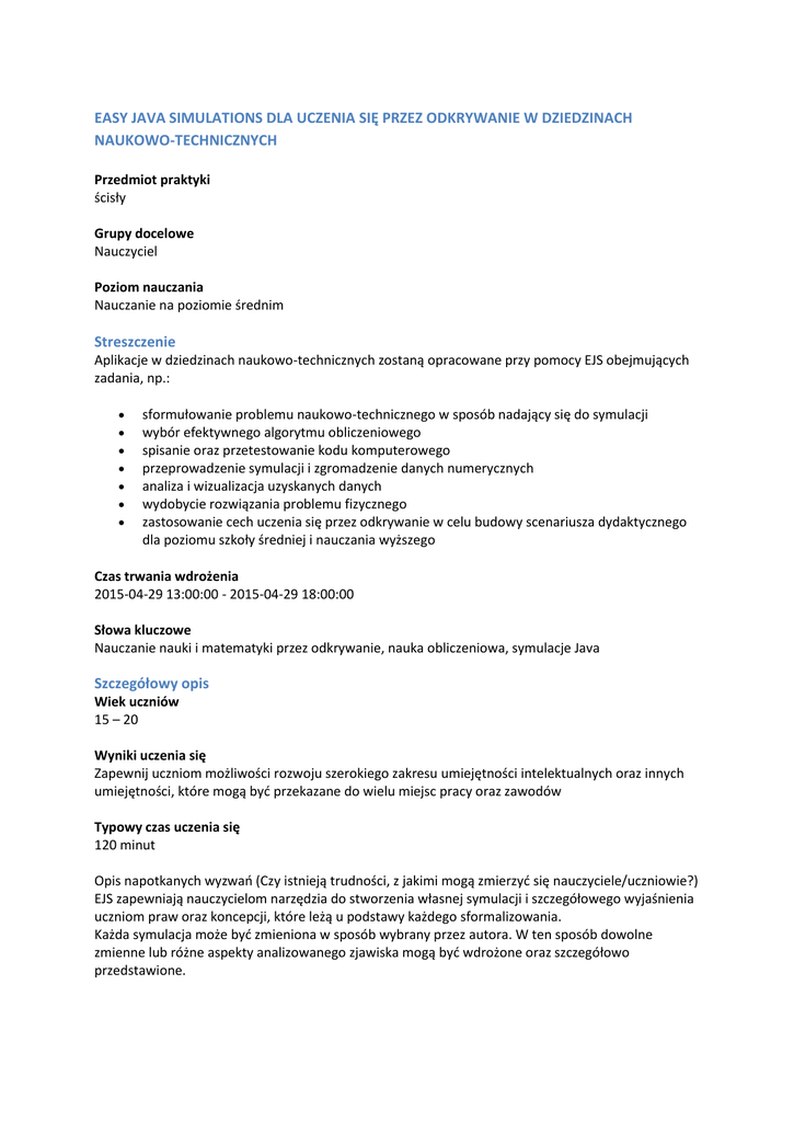 EASY JAVA SIMULATIONS DLA UCZENIA SIĘ PRZEZ ODKRYWANIE W DZIEDZINACH NAUKOWO-TECHNICZNYCH Przedmiot praktyki ścisły Grupy docelowe Nauczyciel Poziom nauczania Nauczanie na poziomie średnim Streszczenie Aplikacje w dziedzinach naukowo-technicznych zostaną opracowane przy pomocy EJS obejmujących zadania, np.: sformułowanie problemu naukowo-technicznego w sposób nadający się do symulacji wybór efektywnego algorytmu obliczeniowego spisanie oraz przetestowanie kodu komputerowego przeprowadzenie symulacji i zgromadzenie danych numerycznych analiza i wizualizacja uzyskanych danych wydobycie rozwiązania problemu fizycznego zastosowanie cech uczenia się przez odkrywanie w celu budowy scenariusza dydaktycznego dla poziomu szkoły średniej i nauczania wyższego Czas trwania wdrożenia 2015-04-29 13:00:00 - 2015-04-29 18:00:00 Słowa kluczowe Nauczanie nauki i matematyki przez odkrywanie, nauka obliczeniowa, symulacje Java Szczegółowy opis Wiek uczniów 15 – 20 Wyniki uczenia się Zapewnij uczniom możliwości rozwoju szerokiego zakresu umiejętności intelektualnych oraz innych umiejętności, które mogą być przekazane do wielu miejsc pracy oraz zawodów Typowy czas uczenia się 120 minut Opis napotkanych wyzwań (Czy istnieją trudności, z jakimi mogą zmierzyć się nauczyciele/uczniowie?) EJS zapewniają nauczycielom narzędzia do stworzenia własnej symulacji i szczegółowego wyjaśnienia uczniom praw oraz koncepcji, które leżą u podstawy każdego sformalizowania. Każda symulacja może być zmieniona w sposób wybrany przez autora. W ten sposób dowolne zmienne lub różne aspekty analizowanego zjawiska mogą być wdrożone oraz szczegółowo przedstawione. Szczegółowy opis Easy Java Simulations to narzędzie oprogramowania (kod i generator java) zaprojektowane w celu tworzenia odrębnych symulacji komputerowych. Odrębna symulacja komputerowa bądź po prostu symulacja komputerowa jest programem komputerowym, który próbuje odtworzyć, w celu pedagogicznym lub naukowym, zjawisko naturalne poprzez wizualizację różnych stanów, jakie może ono mieć. Każdy z tych stanów jest opisany przez zespół zmiennych, które zmieniają się w czasie w wyniku iteracji danego algorytmu. EJS zostało zaprojektowane, aby pozwolić użytkownikowi na pracę na wysoce koncepcyjnym poziomie za pomocą zbioru uproszczonych narzędzi oraz na skoncentrowanie większości jego czasu na aspekty naukowe "modelu symulacji", z nakazaniem, aby komputer automatycznie wykonał wszystkie pozostałe, ale łatwo zautomatyzowane zadania. Mimo to, ostateczny wynik, który jest generowany automatycznie przez opis EJS, może, pod względem wydajności i wyrafinowania, być uznany za dzieło profesjonalnego programisty. W szczególności, EJS tworzy aplikacje Java, które są niezależne od platformy, bądź aplety, które można wizualizować przy pomocy przeglądarki internetowej (i tym samym rozpowszechniać przez internet), które odczytują dane w interncie i które można kontrolować przy pomocy skryptów ze stron internetowych. Działania w zakresie uczenia się/Wdrożenie Zaproponowano grupę proponowanych zasobów: http://www.opendiscoveryspace.eu/searchresources-in-community/330376 . Przedstawiono szczegółowe omówienie. Wyjaśniono dwa przypadki już wdrożonych scenariuszy symulacji. Nauczyciele zostali poproszeni o przekazanie reguł oraz koncepcji ich własnego oprogramowania EJS (na ich komputerach) i rozpoczęcie próby symulacji oraz zmiany zmiennych ad hoc, aby zrozumieć sposób jego działania. EJS Astronomia Erastotenes EJS Fazy księżyca EJS Pola magnetyczne Kraj pochodzenia Język praktyki Powiązany serwis internetowy Status praktyki Pobierz pełny opis praktyki Grecja Grecki http://www.opendiscoveryspace.eu/community/easy-javasimulations-inquiry-base... Końcowy Obszar dobrej praktyki Uczenie się z wykorzystaniem TIK - korzystanie z zasobów cyfrowych do prowadzenia zajęć w klasie i nauczania online Cechy praktyki Przenaszalność, adaptowalność, innowacyjność, akceptowalność, wpływ, skuteczność, dostępność, kreatywność, współpraca Inni kontrybutorzy Jest to inicjatywa przedstawiona i wspierana przez profesora Sarantosa Psycharisa Przydatna literatura http://www.um.es/fem/EjsWiki/pmwiki.php O autorze Nazwisko kontrybutora Petros Georgiakakis Powiązanie kontrybutora Starszy pracownik naukowo-badawczy Instytucja, w której wdrożono praktykę Szkoła Edukacji Pedagogicznej i Technologicznej - ASPETE E-mail kontaktowy [email protected]