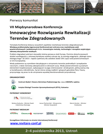 Pierwszy komunikat VII Międzynarodowa Konferencja Innowacyjne Rozwiązania Rewitalizacji Terenów Zdegradowanych Tematyka Konferencji dotyczy wszystkich aspektów rewitalizacji terenów zdegradowanych. Wiodącą problematyką tegorocznej Konferencji jest ochrona oraz rewitalizacja wód powierzchniowych i podziemnych m.in. innowacyjne metody, technologie i narzędzia wspierające odnowę ekosystemów wodnych. Problem degradacji wód jest niezwykle istotną sprawą w skali Europy. Pomimo dotychczasowych działań wynikających z ramowej dyrektywy wodnej szacuje się, że wymóg osiągnięcia „dobrego stanu ekologicznego” do 2015 r. będzie spełniony dla zaledwie około 53% części wód powierzchniowych w Unii Europejskiej. Wody podziemne są czynnikiem decydującym o utrzymaniu terenów podmokłych i przepływów rzecznych, a także stanowią zabezpieczenie w okresach suszy. Wody powierzchniowe są ważnym elementem krajobrazowym, wpływającym na jego zróżnicowanie i atrakcyjność, pełnią ważną rolę w kształtowaniu mikroklimatu. Są też nieraz ostoją rzadkich i ginących gatunków flory i fauny, przyczyniając się przez to do utrzymania wysokiej bioróżnorodności przyrodniczej. ORGANIZATORZY Centrum Badań i Dozoru Górnictwa Podziemnego Sp. z o.o. (CBiDGP), Lędziny Instytut Ekologii Terenów Uprzemysłowionych (IETU), Katowice PATRONAT HONOROWY Barbara Kudrycka – Minister Nauki i Szkolnictwa Wyższego Janusz Piechociński – Wicepremier, Minister Gospodarki Marcin Korolec – Minister Środowiska PATRONAT MEDIALNY Szczegółowe Informacje na stronie internetowej Konferencji www.revitare-conf.pl 2–4 października 2013, Ustroń TEMATYKA KONFERENCJI Charakterystyka terenu/rozpoznawanie i monitoring Innowacyjne technologie oczyszczania terenów Przyrodnicze i krajobrazowe aspekty rewitalizacji terenów zdegradowanych Innowacyjne zarządzanie ponownym wykorzystaniem terenów – aspekty zdrowotne, społeczne i ekonomiczne Rewitalizacja terenów zdegradowanych – studia przypadków i dobre praktyki Narzędzia wsparcia rewitalizacji zdegradowanych obszarów miejskich Lista tematów dostępna na stronie internetowej: www.revitare-conf.pl. Szczególnie zachęcamy do prezentacji wyników badań podstawowych i stosowanych, uwzględniających następujące aspekty rewitalizacji terenów zdegradowanych i poprzemysłowych: przyrodniczy i środowiskowy, technologiczno-inżynierski, projektowo-planistyczny, ekonomiczny i finansowy, społeczny. UCZESTNICY Do udziału w Konferencji zapraszamy polskich i zagranicznych naukowców, a także przedstawicieli władz regionalnych i lokalnych, właścicieli terenów, inwestorów, przedsiębiorstw zajmujących się oczyszczaniem oraz rekultywacją gleb i wód, firm budowlanych, a również instytucji finansujących. JĘZYK Konferencja będzie prowadzona w języku polskim i angielskim. Zapewniamy tłumaczenie symultaniczne. WSTĘPNY PROGRAM KONFERENCJI Środa, 2 października 2013 Otwarcie Konferencji Referat wprowadzający prof. dr inż. Piotr Małoszewski – Helmholtz Center Munich, HMGU, Niemcy Wręczenie nagród Konkursu REVITARE Sesja I Charakterystyka terenu/Rozpoznawanie i monitoring Uroczysta kolacja Czwartek, 3 października 2013 Sesja II Innowacyjne technologie oczyszczania terenów Sesja III Przyrodnicze i krajobrazowe aspekty rewitalizacji terenów zdegradowanych Sesja IV Innowacyjne zarządzanie ponownym wykorzystaniem terenów – aspekty zdrowotne, społeczne i ekonomiczne Kolacja plenerowa Piątek, 4 października 2013 Sesja V Rewitalizacja terenów zdegradowanych – studia przypadków i dobre praktyki Sesja VI Narzędzia wspierające rewitalizację zdegradowanych obszarów miejskich Zakończenie konferencji WYTYCZNE DLA AUTORÓW REFERATÓW Rada Naukowo-Programowa przyjmuje artykuły z obszaru tematycznego konferencji, dotychczas nie publikowane. Wytyczne i uwagi edytorskie dotyczące streszczenia znajdują się na stronie internetowej www.revitare-conf.pl. Streszczenia w języku polskim i angielskim prosimy przesłać do 3 czerwca 2013 e-mailem do Anny Pilch na adres: [email protected] 2–4 października 2013, Ustroń MATERIAŁY KONFERENCYJNE I MONOGRAFIA Streszczenia zostaną opublikowane w materiałach konferencyjnych, a pełne teksty referatów zostaną wydane na płycie CD. Po Konferencji artykuły zostaną poddane recenzji przez członków Rady NaukowoProgramowej, a wybrane opublikowane w monografii Innowacyjne rozwiązania rewitalizacji terenów zdegradowanych 2013. WAŻNE TERMINY 3 czerwca – termin zgłoszenia referatu i nadsyłania streszczeń 17 czerwca – przekazanie prelegentom informacji o przyjęciu referatu 19 sierpnia – nadesłanie pełnych tekstów referatów 31 sierpnia – 2 komunikat i wstępny program konferencji (wersja elektroniczna) 20 września – zakończenie rejestracji REJESTRACJA Za pomocą formularza on-line lub na formularzu zgłoszenia uczestnictwa dostępnym do pobrania (doc lub pdf). Szczegóły na stronie internetowej www.revitare-conf.pl. OPŁATA KONFERENCYJNA Opłata konferencyjna obejmuje zakwaterowanie (noclegi w hotelu z 2/3 i 3/4 października), wyżywienie oraz materiały konferencyjne. Osoba wygłaszająca referat korzysta ze zniżki w opłacie konferencyjnej. pobyt autora wygłaszającego referat (nie promocyjny) – 1.000,00 zł + (23% VAT) = 1.230,00 zł pobyt autora wygłaszającego referat (nie promocyjny) pokój 1 osobowy – 1.200,00 zł + (23% VAT) = 1.476,00 zł pobyt uczestnika – 1.300,00 zł + (23% VAT) = 1.599,00 zł pobyt uczestnika w pokoju 1 osobowym – 1.500,00 zł + (23% VAT) = 1.845,00 zł inne formy udziału (wg uzgodnień z organizatorem) Opłatę prosimy wpłacić do 20 września 2013 na konto CBiDGP: Bank Spółdzielczy Tychy, nr konta: 75 8435 0004 0000 0002 3908 0001 PROMOCJA NA KONFERENCJI Organizatorzy zapraszają przedsiębiorstwa do współorganizacji Konferencji oraz do prezentacji firm. reklama firmy w materiałach konferencyjnych wg prze