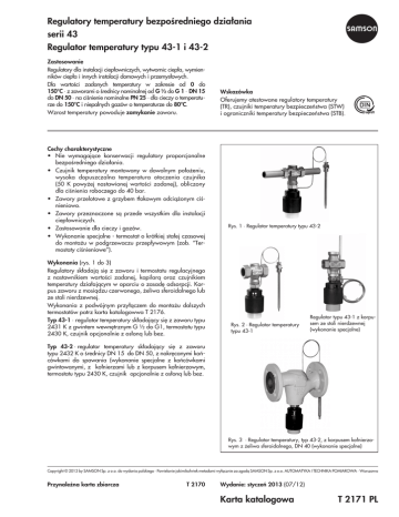 Regulatory temperatury bezpoœredniego dzia³ania serii 43 Regulator temperatury typu 43-1 i 43-2 Zastosowanie Regulatory dla instalacji ciep³owniczych, wytwornic ciep³a, wymienników ciep³a i innych instalacji domowych i przemys³owych. Dla wartoœci zadanych temperatury w zakresie od 0 do 150°C ⋅ z zaworami o œrednicy nominalnej od G ½ do G 1 ⋅ DN 15 do DN 50 ⋅ na ciœnienie nominalne PN 25 ⋅ dla cieczy o temperaturze do 150°C i niepalnych gazów o temperaturze do 80°C. Wzrost temperatury powoduje zamykanie zaworu. Cechy charakterystyczne • Nie wymagaj¹ce konserwacji regulatory proporcjonalne bezpoœredniego dzia³ania. • Czujnik temperatury montowany w dowolnym po³o¿eniu, wysoka dopuszczalna temperatura otoczenia czujnika (50 K powy¿ej nastawionej wartoœci zadanej), obliczony dla ciœnienia roboczego do 40 bar. • Zawory przelotowe z grzybem t³okowym odci¹¿onym ciœnieniowo. • Zawory przeznaczone s¹ przede wszystkim dla instalacji ciep³owniczych. • Zastosowanie dla cieczy i gazów. • Wykonanie specjalne - termostat o krótkiej sta³ej czasowej do monta¿u w podgrzewaczu przep³ywowym (zob. “Termostaty ciœnieniowe”). Wykonania (rys. 1 do 3) Regulatory sk³adaj¹ siê z zaworu i termostatu regulacyjnego z nastawnikiem wartoœci zadanej, kapilar¹ oraz czujnikiem temperatury dzia³aj¹cym w oparciu o zasadê adsorpcji. Korpus zaworu z mosi¹dzu czerwonego, ¿eliwa sferoidalnego lub ze stali nierdzewnej. Wykonania z podwójnym przy³¹czem do monta¿u dalszych termostatów patrz karta katalogowwa T 2176. Typ 43-1 ⋅ regulator temperatury sk³adaj¹cy siê z zaworu typu 2431 K z gwintem wewnêtrznym G ½ do G1, termostatu typu 2430 K, czujnik opcjonalnie z os³on¹ lub bez. Wskazówka Oferujemy atestowane regulatory temperatury (TR), czujniki temperatury bezpieczeñstwa (STW) i ograniczniki temperatury bezpieczeñstwa (STB). Rys. 1 ⋅ Regulator temperatury typu 43-2 Rys. 2 ⋅ Regulator temperatury typu 43-1 Regulator typu 43-1 z korpusem ze stali nierdzewnej (wykonanie specjalne) Typ 43-2 ⋅ regulator temperatury sk³adaj¹cy siê z zaworu typu 2432 K o œrednicy DN 15 do DN 50, z nakrêcanymi koñcówkami do spawania (wykonanie specjalne z koñcówkami gwintowanymi, z ko³nierzami lub z korpusem ko³nierzowym, termostatu typu 2430 K, czujnik opcjonalnie z os³on¹ lub bez. Rys. 3 ⋅ Regulator temperatury, typ 43-2, z korpusem ko³nierzowym z ¿eliwa sferoidalnego, DN 40 (wykonanie specjalne) Copyright © 2013 by SAMSON Sp. z o.o. do wydania polskiego · Powielanie jakimikolwiek metodami wy³¹cznie za zgod¹ SAMSON Sp. z o.o. AUTOMATYKA I TECHNIKA POMIAROWA · Warszawa Przynale¿na karta zbiorcza T 2170 Wydanie: styczeñ 2013 (07/12) Karta katalogowa T 2171 PL Atestowane urz¹dzenia zabezpieczaj¹ce Numer rejestru podajemy na zapytanie. Nasza oferta obejmuje: Regulator temperatury (TR) typu 43-1 i typu 43-2, w którym maks. ciœnienie robocze nie mo¿e przekroczyæ podanej w danych technicznych maksymalnej dopuszczalnej ró¿nicy ciœnieñ ∆p. W czujnikach z os³on¹ nale¿y stosowaæ tylko os³ony firmy SAMSON. Szczegó³owe informacje dotycz¹ce doboru i zastosowania urz¹dzeñ atestowanych patrz karta zbiorcza T 2181. Ponadto oferujemy: czujnik temperatury bezpieczeñstwa (STW) i ogranicznik temperatury bezpieczeñstwa (STB). Szczegó³owe informacje patrz karty katalogowe T 2183 i T 2185. regulator typu 43-2 zawór typu 2432 K - po³¹czenie gwintowe - Wyposa¿enie dodatkowe – os³ona zanurzeniowa: z miedzi PN 40 ze stali CrNiMo PN 40 – przy³¹cze podwójne Do3K lub pokrêt³o do nastawy rêcznej – element poœrednicz¹cy dla ruroci¹gów izolowanych lub dla temperatury medium do −15°C regulator typu 43-1 zawór typu 2431 K - gwint wewnêtrzny - Regulator temperatury typu 43-1 i 43-2 Na rysunku lewe przy³¹cze zaworu przedstawia regulator typu 2432 K, a prawe typu 2431 K. Sposób dzia³ania obu regulatorów jest jednakowy. Wykonania specjalne – kapilara o d³ugoœci 5 m – mniejszy wspó³czynnik KVS dla DN 15 i G ½ – czêœci wewnêtrzne odporne na dzia³anie oleju – szybko dzia³aj¹cy termostat (zob. str. 5 “Termostaty ciœnieniowe”) – na zapytanie – – wykonania wed³ug ANSI – zob. karta katalogowa T 2175 – – korpus ze stali nierdzewnej dla regulatora typu 43-1/G ½, G ¾ i G1, DN 15 i DN 25 – korpus ko³nierzowy z ¿eliwa sferoidalnego EN-JS1049 dla regulatora typu 43-2 regulator typu 43-2 ⋅ zawór z korpusem ko³nierzowym (wykonanie specjalne) Sposób dzia³ania (rys. 4) Regulatory temperatury dzia³aj¹ na zasadzie adsorpcji. Zmiana temperatury wywo³uje odpowiedni¹ zmianê ciœnienia w czujniku pomiarowym. Ciœnienie to przenoszone jest przez kapilarê (11) na mieszek nastawczy (9) i przetwarzane na si³ê nastawcz¹. Wytworzona si³a zmienia po³o¿enie grzyba zaworu (3) w zale¿noœci od nastawy wartoœci zadanej. Obrót nastawnika wartoœci zadanej (8) powoduje zmianê punktu progowego w taki sposób, ¿e grzyb zaworu pokonuje swój skok zale¿nie od zakresu temperatury mierzonej przez czujnik. Regulatory s¹ przeznaczone dla instalacji grzewczych. Wzrost temperatury i przekroczenie ustawionej wartoœci zadanej powoduje zamykanie zaworów. Rys. 4 ⋅ Sposób dzia³ania; regulator temperatury typu 43-1 i 43-2 1 korpus zaworu 2 gniazdo (wymienne) 3 grzyb 4 trzpieñ grzyba 5 sprê¿yna zaworu 7 sprê¿yny nastawcze 8 nastawnik wartoœci zadanej 9 si³ownik 10 trzpieñ si³ownika 11 kapilara 12 nakrêtka ko³pakowa (do po³¹czenia termostatu z zaworem) Copyright © 2013 by SAMSON Sp. z o.o. do wydania polskiego · Powielanie jakimikolwiek metodami wy³¹cznie za zgod¹ SAMSON Sp. z o.o. AUTOMATYKA I TECHNIKA POMIAROWA · Warszawa 2 T 2171 PL Tabela 1 · Materia³y numer materia³u zgodnie z normami DIN EN Korpus CC491K/CC499K (Rg 5) · EN-JS1049 (GGG-40.3) 1) stal nierdzewna 1.4408 2) stal nierdzewna 1.4305 1.4404 1.4305 i mosi¹dz odporny na odcynkowanie z uszczelnieniem miêkkim z EPDM 3)
