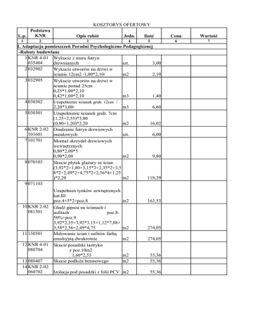 KOSZTORYS OFERTOWY Podstawa KNR L.p. 1 2 Opis robót Jedn. Ilość Cena Wartość 3 4 5 6 7 I. Adaptacja pomieszczeń Poradni Psychologiczno Pedagogicznej -Roboty budowlane 1 KNR 4-01 Wykucie z muru futryn 035404 drewnianych szt. 3,00 2 032902 Wykucie otworów na drzwi w ścianie 12cm2 /1,00*2,10/ m2 2,10 3 032905 Wykucie otworów na drzwi w ścianie ponad 25cm 0,25*1,00*2,10 0,42*1,00*2,10 m3 1,40 4 030302 Uzupełnienie ścianek grub. 12cm / 2,20*3,00/ m3 6,60 5 030301 Uzupełnienie ścianek grub. 7cm (1,25+2,55)*3,00 (0,90+1,20)*2,20 m2 16,02 6 KNR 2-02 Osadzenie futryn drzwiowych 101601 metalowych szt. 6,00 7 101701 Montaż skrzydeł drzwiowych wewnętrznych 0,80*2,00*5 0,90*2,00 m2 9,80 8 070103 Skucie płytek glazury ze ścian (3,92*2+1,80+3,15*2+2,35*2+3,5 8*2+2,49*2+4,75*2+2,56*4+1,25 )*2,20 m2 118,29 9 071103 Uzupełnien tynków zewnętrznych kat.III poz.4+5*2+poz.8 m2 10 KNR 2-02 081501 11 150501 12 KNR 4-01 080704 13 080407 14 KNR 2-02 060702 Gładź gipsoa na ścianach i sufitach poz.850%+poz.9 3,92*2,35+3,92*3,15+1,12*7,88+ 3,58*2,56+2,49*4,75 Malowanie ścian i sufitów farbą emulsyjną dwukrotnie Skucie posadzki lastryko z poz.10m2 1,60*2,55 Skucie podłoża betonowego 163,53 m2 274,05 m2 274,05 m2 m2 55,36 55,36 Izolacja pod posadzki z folii PCV m2 55,36 1 2 15 110201 110203 16 110405 3 Gładź cementowa pod izolacje i pod posadzki Posadzka z terakoty układana na klej 3,92*2,35+4,70+6,47+2,97 17 010503 Cokoliki z terakoty 3,92*2+2,35*2+7,88*2+2,55*2+1 ,25 18 KNNR 2 Posadzka z paneli Kl. ACIII 120509 16,28+9,16+12,81 19 120606 Listwy przyścienne drewniane (3,58+2,56+4,75+2,49+3,92+3,15 )*2 20 032202 Osadzenie kratek wentylacyjnych 21 010813 Wywiezienie gruzu na odległość 010816 5km 1,40+2,10*0,15+118,29*0,03+55, 36*0,07 22 KNR 2-02 Licowanie ścian płytkami glazury 082906 (2,05*2+1,60*4+1,25*2)*2,10 23 ANALIZA Dostarczenie i montaż lustra weneckiego 24 KNNR 7 Drzwi zewnętrzne aluminiowe 050308 1,35*2,20 4 5 6 m2 110,92 m2 23,35 mb 34,65 m2 38,25 mb szt. 40,90 5,00 m3 9,14 m2 27,30 szt. 1,00 m2 2,97 Razem: .7 - 1 2 3 4 - Roboty sanitarne 25 KNR 8 wykonanie podejść odpływowych 021005 PCV fi 50 szt. 26 021003 j.w. Fi 110 szt. 27 020306 Rury PCV fi 110 układane na ścianach m 28 020304 J.w. Fi 50 m 29 010501 Rury wodociągowe fi 15 układane na ścianach m 30 013001 Zawory przelotowe kulowe fi 15 szt. 31 011501 Podejścia dopływowe fi 15 szt. 32 021802 Montaż kompletnego ustępu z dolnopłukiem szt. 33 021602 Montaż umywalki z syfonem PCV szt. 34 022005 Montaż pisuaru szt. 35 011805 Montaż baterii umywalkowych szt. 36 021504 Montaż zlewozmywaka z blachy nirdzewnej szt. 37 KNR 4-01 Wykoanie bruzd w cegle na 033601 przewody wodociągowe m 38 033321 Przebicie stropów pod podejścia i piony wod-kan. szt. 1 2 3 - Roboty elektryczne 39 KNR 4-03 100105 Wykucie bruzd pod przewody 40 100502 Ręczne przebicie ścian 41 KNNR 9 030102 Wymiana przewodów YDY 3*2,5 42 040201 Wymiana gniazd wtykowych 43 040101 Wymiana przełączników 44 040306 Wymiana puszek podtynkowych . 45 050201 Wymiana opraw żarowych 46 050102 Wymiana opraw świetlówkowych z rastrem 4 5 6 7 4,00 1,00 7,00 4,00 11,00 2,00 8,00 1,00 1,00 1,00 2,00 1,00 11,00 6,00 Razem: 5 mb szt. 112,00 12,00 mb szt. szt. 112,00 12,00 7,00 szt. szt. 18,00 3,00 szt. 11,00 Razem: 6 7 - 1 2 3 4 5 6 7 II. Roboty remontowe I piętra 47 4-01 081805 Zerwanie posadzki z wykładziny PCV 48 021101 49 2-022 111501 50 111207 51 111209 52 KNNR 2 120509 53 120606 18,50*1,70+9,50*2,20 Skucie podłoża betonowego grub 1cm Przygotowanie podłoża pod posadzkę PCV Posadzka PCV rulonowa Zgrzewanie posadzki PCV Posadzki z paneli podłogowych HDF KL AC3 3,15*5,45+3,25*5,45+3,70*2,80+ 5,00*4,77+3,45*5,45*2 Listwy przyścienne drewniane 17,80+17,40+13,00+19,54+ 17,80*2 54 111601 Dostarczenie i osadzenie futryn drzwiowych metalowych 55 101901 Montaż skrzydeł drzwiowych z fakturą drewnopodobną 1,60*2,00*4 56 4-02 120401 Malowanie ścian i sufitów farbą emulsyjną dwukrotnie 52,35+106,69+85,54*2,65 56,00*1,15 57 120609 Lamperie olejne malowane dwukrotnie ze szpachlowaniem (18,50+9,50)*2*1,50 58 035404 Wykucie z muru futryn drzwiowych drewnianych m2 22,00 m2 22,00 m2 m2 m2 22,00 22,00 22,00 m2 106,69 mb 85,54 szt. 7,00 m2 6,40 m2 450,12 m2 84,00 szt. 7,00 Razem: - 1 2 3 4 III. Roboty remontowe II piętra 59 4-01 081805 Zerwanie posadzki z wykładziny PCV 10,00*2,20 m2 60 021101 Skucie podłoża betonowego grub 2cm m2 61 2-02 111501 Przygotowanie podłoża pod posadzkę PCV m2 62 111207 Posadzka PCV rulonowa m2 63 111209 Zgrzewanie posadzki PCV m2 64 4-01 120207 Skasowanie zacieków na tynkach sufitów m2 65 120401+08 Malowanie tynków ścian i sufitów farbą emulsyjną dwukrotnie z przygotowaniem powierzchni korytarz: 18,50*1,75+11,90*1,90+9,50* 2,20 (18,50+11,90+9,50+1,75)*2* 1,15 pokoje: 5,55*3,45*6 (5,55+3,45)*2*2,65*6 klatka schodowa 5,26*2,90 m2 (5,26*2+2,90)*3,90 66 120609 Malowanie lamperii farbą olejną dwukrotnie ze szpachlowaniem 79,80*1,50 (5,62*2+2,90)*1,50 m2 67 032001 Uszczelnienie styku futryny z murem 4,80*12 m2 68 032603 Zamurowanie bruzdy pionowej 12*6cm m 69 070502 Zatynkowanie bruzdy szer 20cm m 70 120908 Malowanie szaf drewnianych w pokojach farbą olejną jenokrotnie 2,10*2,65*6 m2 71 035404 Wykucie z muru futryn drzwiowych drewnianych szt. 72 2-02 101601 Dostarczenie i osadzenie futryn drzwiowych metalowych szt. 73 101901 Dostarczenie i montaż skrzydeł drzwiowych pełnych 0,80*2,00*4 m2 5 6 7 22,00 22,00 22,00 22,00 22,00 12,00 618,32 169,55 57,60 2,65 2,65 33,40 5,00 5,00 8,00 Razem: - TABELA ELEMENTÓW SCALONYCH I. Adaptacja pomieszczeń Poradni Psychologiczno Pedagogicznej - -Roboty budowlane - - Roboty sanitarne - - Roboty elektryczne - II. Roboty remontowe I piętra - III. Roboty remontowe II piętra - Razem: VAT 22% Ogółem: