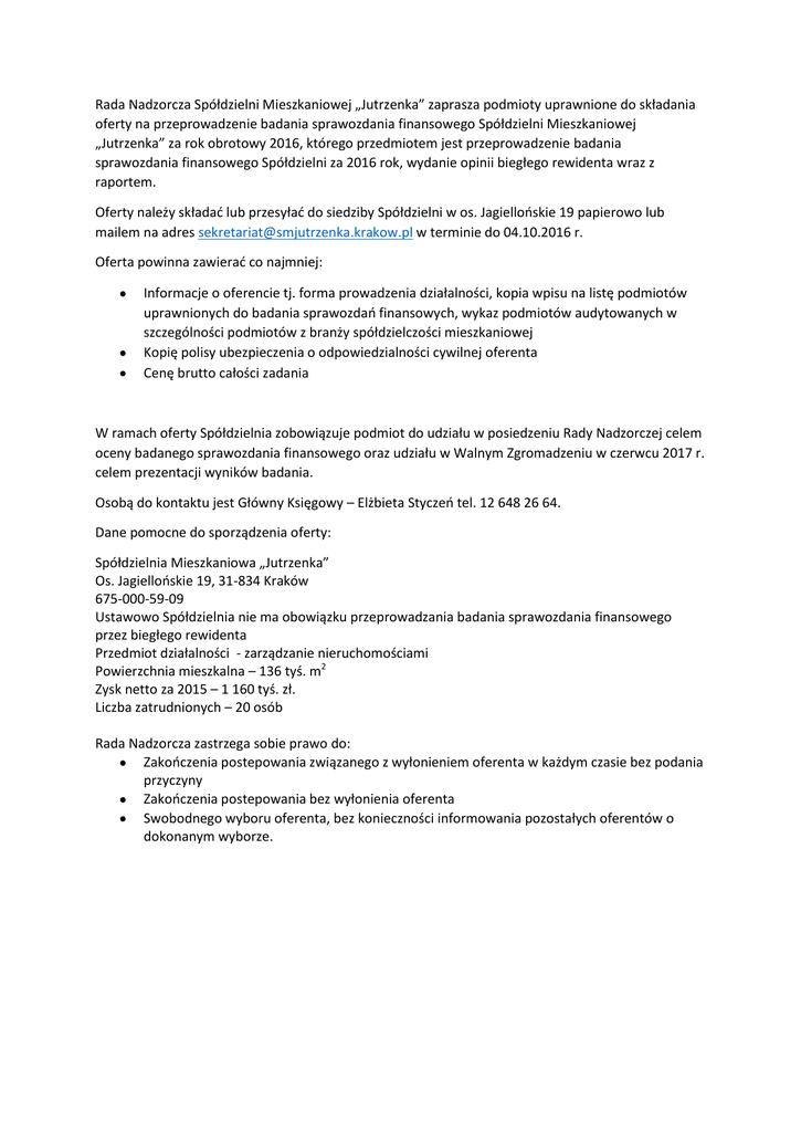 Rada Nadzorcza Spółdzielni Mieszkaniowej „Jutrzenka” zaprasza podmioty uprawnione do składania oferty na przeprowadzenie badania sprawozdania finansowego Spółdzielni Mieszkaniowej „Jutrzenka” za rok obrotowy 2016, którego przedmiotem jest przeprowadzenie badania sprawozdania finansowego Spółdzielni za 2016 rok, wydanie opinii biegłego rewidenta wraz z raportem. Oferty należy składać lub przesyłać do siedziby Spółdzielni w os. Jagiellońskie 19 papierowo lub mailem na adres [email protected] w terminie do 04.10.2016 r. Oferta powinna zawierać co najmniej: Informacje o oferencie tj. forma prowadzenia działalności, kopia wpisu na listę podmiotów uprawnionych do badania sprawozdań finansowych, wykaz podmiotów audytowanych w szczególności podmiotów z branży spółdzielczości mieszkaniowej Kopię polisy ubezpieczenia o odpowiedzialności cywilnej oferenta Cenę brutto całości zadania W ramach oferty Spółdzielnia zobowiązuje podmiot do udziału w posiedzeniu Rady Nadzorczej celem oceny badanego sprawozdania finansowego oraz udziału w Walnym Zgromadzeniu w czerwcu 2017 r. celem prezentacji wyników badania. Osobą do kontaktu jest Główny Księgowy – Elżbieta Styczeń tel. 12 648 26 64. Dane pomocne do sporządzenia oferty: Spółdzielnia Mieszkaniowa „Jutrzenka” Os. Jagiellońskie 19, 31-834 Kraków 675-000-59-09 Ustawowo Spółdzielnia nie ma obowiązku przeprowadzania badania sprawozdania finansowego przez biegłego rewidenta Przedmiot działalności - zarządzanie nieruchomościami Powierzchnia mieszkalna – 136 tyś. m2 Zysk netto za 2015 – 1 160 tyś. zł. Liczba zatrudnionych – 20 osób Rada Nadzorcza zastrzega sobie prawo do: Zakończenia postepowania związanego z wyłonieniem oferenta w każdym czasie bez podania przyczyny Zakończenia postepowania bez wyłonienia oferenta Swobodnego wyboru oferenta, bez konieczności informowania pozostałych oferentów o dokonanym wyborze.