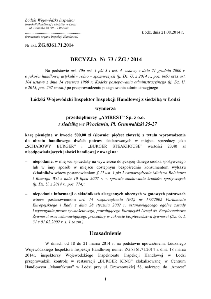 Łódzki Wojewódzki Inspektor Inspekcji Handlowej z siedzibą w Łodzi ul. Gdańska 38, 90 – 730 Łódź Łódź, dnia 21.08.2014 r. ..................................................... (oznaczenie organu Inspekcji Handlowej) Nr akt: ŻG.8361.71.2014 DECYZJA Nr 73 / ŻG / 2014 Na podstawie art. 40a ust. 1 pkt 3 i ust. 4 ustawy z dnia 21 grudnia 2000 r. o jakości handlowej artykułów rolno – spożywczych (tj. Dz. U. z 2014 r., poz. 669) oraz art. 104 ustawy z dnia 14 czerwca 1960 r. Kodeks postępowania administracyjnego (tj. Dz. U. z 2013, poz. 267 ze zm.) po przeprowadzeniu postępowania administracyjnego Łódzki Wojewódzki Inspektor Inspekcji Handlowej z siedzibą w Łodzi wymierza przedsiębiorcy „AMREST” Sp. z o.o. z siedzibą we Wrocławiu, Pl. Grunwaldzki 25-27 karę pieniężną w kwocie 500,00 zł (słownie: pięćset złotych) z tytułu wprowadzenia do obrotu handlowego dwóch potraw deklarowanych w miejscu sprzedaży jako „SCHABOWY BURGER” i „BURGER STEAKHOUSE” wartości 23,40 zł nieodpowiadających jakości handlowej z uwagi na: niepodanie, w miejscu sprzedaży na wywieszce dotyczącej danego środka spożywczego lub w inny sposób w miejscu dostępnym bezpośrednio konsumentom wykazu składników wbrew postanowieniom § 17 ust. 1 pkt 2 rozporządzenia Ministra Rolnictwa i Rozwoju Wsi z dnia 10 lipca 2007 r. w sprawie znakowania środków spożywczych (tj. Dz. U. z 2014 r., poz. 774); niepodanie informacji o składnikach alergennych obecnych w gotowych potrawach wbrew postanowieniom art. 14 rozporządzenia (WE) nr 178/2002 Parlamentu Europejskiego i Rady z dnia 28 stycznia 2002 r. ustanawiającego ogólne zasady i wymagania prawa żywnościowego, powołującego Europejski Urząd ds. Bezpieczeństwa Żywności oraz ustanawiającego procedury w zakresie bezpieczeństwa żywności (Dz. U. L 31 z 01.02.2002 r. s. 1 ze zm.). Uzasadnienie W dniach od 18 do 21 marca 2014 r. na podstawie upoważnienia Łódzkiego Wojewódzkiego Inspektora Inspekcji Handlowej numer ŻG.8361.71.2014 z dnia 18 marca 2014r. inspektorzy Wojewódzkiego Inspektoratu Inspekcji Handlowej w Łodzi przeprowadzili kontrolę w restauracji „BURGER KING” zlokalizowanej w Centrum Handlowym „Manufaktura” w Łodzi przy ul. Drewnowskiej 58, należącej do „Amrest” 1 Sp. z o.o. z siedzibą we Wrocławiu, Pl. Grunwaldzki 25-27. Kontrolę przeprowadzono na podstawie przepisów art. 3 ust. 1 - 3 rozporządzenia Parlamentu Europejskiego i Rady (WE) Nr 882/2004 z dnia 29 kwietnia 2004 r. w sprawie kontroli urzędowych przeprowadzanych w celu sprawdzenia zgodności z prawem paszowym i żywnościowym oraz regułami dotyczącymi zdrowia zwierząt i dobrostanu zwierząt (Dz. U. L 165 z 30.4.2004 ze zm.), art. 17 ust. 3 ustawy z dnia 21 grudnia 2000 r. o jakości handlowej artykułów rolno-spożywczych (Dz. U. z 2005 r. nr 187, poz. 1577, ze zm.), art. 24 ust. 1 rozporządzenia Parlamentu Europejskiego i Rady (WE) nr 1935/2004 z dnia 27 października 2004 r. w sprawie materiałów i wyrobów przeznaczonych do kontaktu z żywnością oraz uchylającego dyrektywy 80/590/EWG (Dz. U. z 27.10.2004 s. 4 ze zm.) w związku z art. 3 ust. 1 pkt 6 oraz art. 3 ust. 1 pkt 1 i 2 ustawy z dnia 15 grudnia 2000 r. o Inspekcji Handlowej (tj. Dz. U. z 2014 r., poz. 148) w obecności osób czynnych (…) w dniu 18 marca 2014 r. i (…) w dniu 21 marca 2014 r. Upoważnienie do przeprowadzenia kontroli wraz z pouczeniem o prawach i obowiązkach kontrolowanego przesłano w dniu 19 marca 2014 r. na adres siedziby spółki (Wrocław, Pl. Grunwaldzki 25-27), zaś w dniu 24 marca 2014 r. przesłano pozostałe dokumenty z kontroli, w tym protokół kontroli z dnia 18 marca 2014 r. Przesyłki te zostały odebrane przez stronę odpowiednio w dniu 24 marca 2014r. i 27 marca 2014 r. W toku czynności kontrolnych sprawdzono prawidłowość oznakowania oraz rzetelność przekazywanych informacji o sprzedawanych potrawach. Stwierdzono, że w miejscu sprzedaży na wywieszce dotyczącej danego środka spożywczego lub w inny sposób w miejscu dostępnym bezpośrednio konsumentom dla potraw zakupionych przez inspektorów, deklarowanych w miejscu sprzedaży (karty menu) jako „Schabowy Burger” w cenie 10,95 zł oraz „Burger Steakhouse” w cenie 12,45 zł, nie podano wykazu składników wbrew postanowieniom § 17 ust. 1 pkt 2 rozporządzenia Ministra Rolnictwa i Rozwoju Wsi z dnia 10 lipca 2007 r. w sprawie znakowania środków spożywczych (tj. Dz. U. z 2014 r., poz. 774) zwanego dalej „rozporządzeniem w sprawie znakowania środków spożywczych”. Przedmiotowe potrawy zostały wyprodukowane na zamówienie w dniu 18 marca 2014 r. w restauracji „BURGER KING” zlokalizowanej w Centrum Handlowym „Manufaktura” w Łodzi przy ul. Drewnowskiej 58, należącej do „Amrest” Sp. z o.o. z siedzibą we Wrocławiu, Pl. Grunwaldzki 25-27. Ponadto na podstawie „schematów przygotowania potraw” znajdujących się na zapleczu kuchennym oraz etykiet dołączonych przez producentów do surowców, półproduktów wykorzystywanych do produkcji zamówionych przez inspektorów wyrobów gastronomicznych stwierdzono, że do przygotowania potrawy pod nazwą: „SCHABOWY BURGER” używano: bułki sezamowe mrożone zawierające w składzie mąkę sojową, pikantny sos jogurtowy zawierający w składzie jaja, mleko, gorczycę, kotlet schabowy wieprzowy zawierający w składzie mąkę pszenną, pochodne mleka, jaja i białko sojowe, zaś w dostępnej dla konsumentów tabeli „wartości odżywczych i alergenów” potrawa ta nie została ujęta, 2 potrawy pod nazwą „BURGER STEAKHOUSE” używano: bułki zawierające w składzie mąkę sojową, ostry sos „Barbecure” zawierający w składzie gorczycę, majonez zawierający w składzie żółtko jaja, zaś w dostępnej dla konsumentów tabeli „wartości odżywczych i alergenów” wykazano tylko gluten i mleko. Brak lub podanie niepełnej informacji o obecności w gotowych potrawac