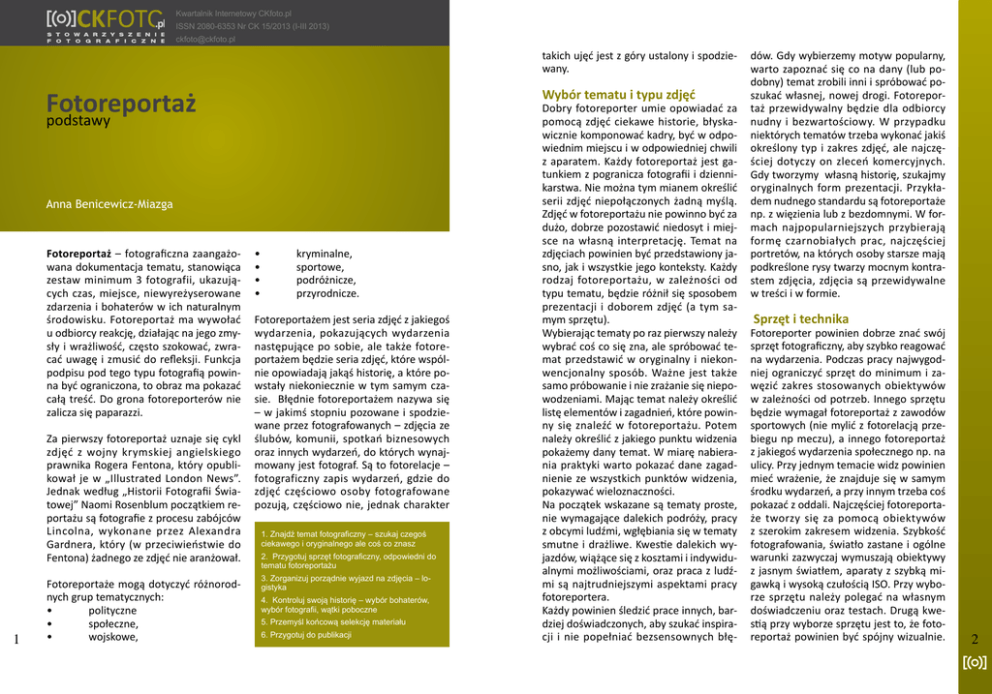 Kwartalnik Internetowy CKfoto.pl ISSN 2080-6353 Nr CK 15/2013 (I-III 2013) [email protected] takich ujęć jest z góry ustalony i spodziewany. Fotoreportaż podstawy Wybór tematu i typu zdjęć Anna Benicewicz-Miazga Fotoreportaż – fotograficzna zaangażowana dokumentacja tematu, stanowiąca zestaw minimum 3 fotografii, ukazujących czas, miejsce, niewyreżyserowane zdarzenia i bohaterów w ich naturalnym środowisku. Fotoreportaż ma wywołać u odbiorcy reakcję, działając na jego zmysły i wrażliwość, często szokować, zwracać uwagę i zmusić do refleksji. Funkcja podpisu pod tego typu fotografią powinna być ograniczona, to obraz ma pokazać całą treść. Do grona fotoreporterów nie zalicza się paparazzi. Za pierwszy fotoreportaż uznaje się cykl zdjęć z wojny krymskiej angielskiego prawnika Rogera Fentona, który opublikował je w „Illustrated London News”. Jednak według „Historii Fotografii Światowej” Naomi Rosenblum początkiem reportażu są fotografie z procesu zabójców Lincolna, wykonane przez Alexandra Gardnera, który (w przeciwieństwie do Fentona) żadnego ze zdjęć nie aranżował. 1 Fotoreportaże mogą dotyczyć różnorodnych grup tematycznych: • polityczne • społeczne, • wojskowe, • • • • kryminalne, sportowe, podróżnicze, przyrodnicze. Fotoreportażem jest seria zdjęć z jakiegoś wydarzenia, pokazujących wydarzenia następujące po sobie, ale także fotoreportażem będzie seria zdjęć, które wspólnie opowiadają jakąś historię, a które powstały niekoniecznie w tym samym czasie. Błędnie fotoreportażem nazywa się – w jakimś stopniu pozowane i spodziewane przez fotografowanych – zdjęcia ze ślubów, komunii, spotkań biznesowych oraz innych wydarzeń, do których wynajmowany jest fotograf. Są to fotorelacje – fotograficzny zapis wydarzeń, gdzie do zdjęć częściowo osoby fotografowane pozują, częściowo nie, jednak charakter 1. Znajdź temat fotograficzny – szukaj czegoś ciekawego i oryginalnego ale coś co znasz 2. Przygotuj sprzęt fotograficzny, odpowiedni do tematu fotoreportażu 3. Zorganizuj porządnie wyjazd na zdjęcia – logistyka 4. Kontroluj swoją historię – wybór bohaterów, wybór fotografii, wątki poboczne 5. Przemyśl końcową selekcję materiału 6. Przygotuj do publikacji Dobry fotoreporter umie opowiadać za pomocą zdjęć ciekawe historie, błyskawicznie komponować kadry, być w odpowiednim miejscu i w odpowiedniej chwili z aparatem. Każdy fotoreportaż jest gatunkiem z pogranicza fotografii i dziennikarstwa. Nie można tym mianem określić serii zdjęć niepołączonych żadną myślą. Zdjęć w fotoreportażu nie powinno być za dużo, dobrze pozostawić niedosyt i miejsce na własną interpretację. Temat na zdjęciach powinien być przedstawiony jasno, jak i wszystkie jego konteksty. Każdy rodzaj fotoreportażu, w zależności od typu tematu, będzie różnił się sposobem prezentacji i doborem zdjęć (a tym samym sprzętu). Wybierając tematy po raz pierwszy należy wybrać coś co się zna, ale spróbować temat przedstawić w oryginalny i niekonwencjonalny sposób. Ważne jest także samo próbowanie i nie zrażanie się niepowodzeniami. Mając temat należy określić listę elementów i zagadnień, które powinny się znaleźć w fotoreportażu. Potem należy określić z jakiego punktu widzenia pokażemy dany temat. W miarę nabierania praktyki warto pokazać dane zagadnienie ze wszystkich punktów widzenia, pokazywać wieloznaczności. Na początek wskazane są tematy proste, nie wymagające dalekich podróży, pracy z obcymi ludźmi, wgłębiania się w tematy smutne i drażliwe. Kwestie dalekich wyjazdów, wiążące się z kosztami i indywidualnymi możliwościami, oraz praca z ludźmi są najtrudniejszymi aspektami pracy fotoreportera. Każdy powinien śledzić prace innych, bardziej doświadczonych, aby szukać inspiracji i nie popełniać bezsensownych błę- dów. Gdy wybierzemy motyw popularny, warto zapoznać się co na dany (lub podobny) temat zrobili inni i spróbować poszukać własnej, nowej drogi. Fotoreportaż przewidywalny będzie dla odbiorcy nudny i bezwartościowy. W przypadku niektórych tematów trzeba wykonać jakiś określony typ i zakres zdjęć, ale najczęściej dotyczy on zleceń komercyjnych. Gdy tworzymy własną historię, szukajmy oryginalnych form prezentacji. Przykładem nudnego standardu są fotoreportaże np. z więzienia lub z bezdomnymi. W formach najpopularniejszych przybierają formę czarnobiałych prac, najczęściej portretów, na których osoby starsze mają podkreślone rysy twarzy mocnym kontrastem zdjęcia, zdjęcia są przewidywalne w treści i w formie. Sprzęt i technika Fotoreporter powinien dobrze znać swój sprzęt fotograficzny, aby szybko reagować na wydarzenia. Podczas pracy najwygodniej ograniczyć sprzęt do minimum i zawęzić zakres stosowanych obiektywów w zależności od potrzeb. Innego sprzętu będzie wymagał fotoreportaż z zawodów sportowych (nie mylić z fotorelacją przebiegu np meczu), a innego fotoreportaż z jakiegoś wydarzenia społecznego np. na ulicy. Przy jednym temacie widz powinien mieć wrażenie, że znajduje się w samym środku wydarzeń, a przy innym trzeba coś pokazać z oddali. Najczęściej fotoreportaże tworzy się za pomocą obiektywów z szerokim zakresem widzenia. Szybkość fotografowania, światło zastane i ogólne warunki zazwyczaj wymuszają obiektywy z jasnym światłem, aparaty z szybką migawką i wysoką czułością ISO. Przy wyborze sprzętu należy polegać na własnym doświadczeniu oraz testach. Drugą kwestią przy wyborze sprzętu jest to, że fotoreportaż powinien być spójny wizualnie. 2 Klasyczny fotoreportaż kojarzy się przede wszystkim z brakiem koloru – czarno-białe zdjęcia pozwalały skupić uwagę odbiorcy na sednie tematu i pomagały podkreślić idealną kompozycję. Podobna ogniskowa na każdym ze zdjęć nie pow