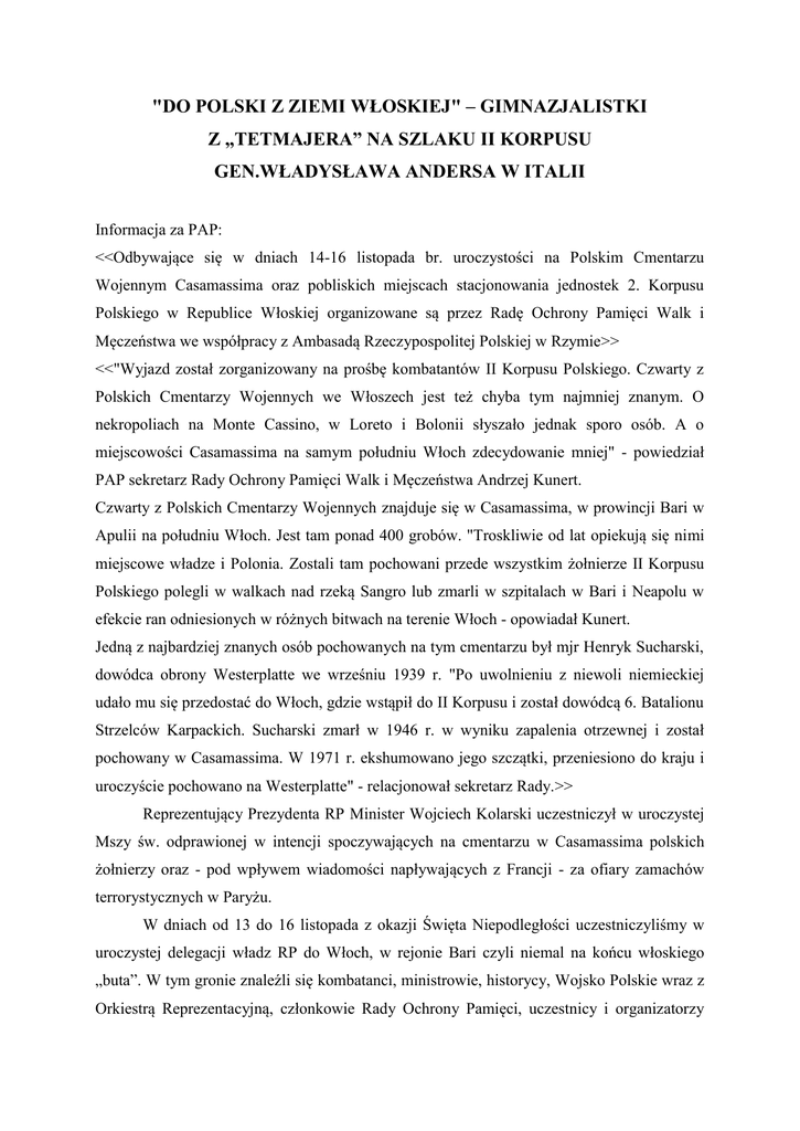 "DO POLSKI Z ZIEMI WŁOSKIEJ" – GIMNAZJALISTKI Z „TETMAJERA” NA SZLAKU II KORPUSU GEN.WŁADYSŁAWA ANDERSA W ITALII Informacja za PAP: <<Odbywające się w dniach 14-16 listopada br. uroczystości na Polskim Cmentarzu Wojennym Casamassima oraz pobliskich miejscach stacjonowania jednostek 2. Korpusu Polskiego w Republice Włoskiej organizowane są przez Radę Ochrony Pamięci Walk i Męczeństwa we współpracy z Ambasadą Rzeczypospolitej Polskiej w Rzymie>> <<"Wyjazd został zorganizowany na prośbę kombatantów II Korpusu Polskiego. Czwarty z Polskich Cmentarzy Wojennych we Włoszech jest też chyba tym najmniej znanym. O nekropoliach na Monte Cassino, w Loreto i Bolonii słyszało jednak sporo osób. A o miejscowości Casamassima na samym południu Włoch zdecydowanie mniej" - powiedział PAP sekretarz Rady Ochrony Pamięci Walk i Męczeństwa Andrzej Kunert. Czwarty z Polskich Cmentarzy Wojennych znajduje się w Casamassima, w prowincji Bari w Apulii na południu Włoch. Jest tam ponad 400 grobów. "Troskliwie od lat opiekują się nimi miejscowe władze i Polonia. Zostali tam pochowani przede wszystkim żołnierze II Korpusu Polskiego polegli w walkach nad rzeką Sangro lub zmarli w szpitalach w Bari i Neapolu w efekcie ran odniesionych w różnych bitwach na terenie Włoch - opowiadał Kunert. Jedną z najbardziej znanych osób pochowanych na tym cmentarzu był mjr Henryk Sucharski, dowódca obrony Westerplatte we wrześniu 1939 r. "Po uwolnieniu z niewoli niemieckiej udało mu się przedostać do Włoch, gdzie wstąpił do II Korpusu i został dowódcą 6. Batalionu Strzelców Karpackich. Sucharski zmarł w 1946 r. w wyniku zapalenia otrzewnej i został pochowany w Casamassima. W 1971 r. ekshumowano jego szczątki, przeniesiono do kraju i uroczyście pochowano na Westerplatte" - relacjonował sekretarz Rady.>> Reprezentujący Prezydenta RP Minister Wojciech Kolarski uczestniczył w uroczystej Mszy św. odprawionej w intencji spoczywających na cmentarzu w Casamassima polskich żołnierzy oraz - pod wpływem wiadomości napływających z Francji - za ofiary zamachów terrorystycznych w Paryżu. W dniach od 13 do 16 listopada z okazji Święta Niepodległości uczestniczyliśmy w uroczystej delegacji władz RP do Włoch, w rejonie Bari czyli niemal na końcu włoskiego „buta”. W tym gronie znaleźli się kombatanci, ministrowie, historycy, Wojsko Polskie wraz z Orkiestrą Reprezentacyjną, członkowie Rady Ochrony Pamięci, uczestnicy i organizatorzy konkursu z fundacji Ostoja przy Wiśle i wyjątkowy gość - pani Anna Maria Anders. Łącznie około 100 osób. Wydarzenie miało na celu podkreślić przyjaźń polsko – włoską oraz przypomnieć historię żołnierzy II Korpusu gen. Andersa. Najważniejsze uroczystości miały miejsce na Polskim Cmentarzu Wojennym w Casamassima. Odbyła się tam Msza Święta, Apel Poległych, przemówienia wraz z listem od Pana Prezydenta Andrzeja Dudy: <<Rzeczpospolitą i Italię od stuleci łączy wspólnota wartości i silne więzi przyjaźni. W epokach dawniejszych nasze kraje zbliżały się zarówno poprzez związki dynastyczne, jak i współpracę w dziedzinie kultury i nauki. Także drogi moich rodaków, walczących o wolność Ojczyzny, wiele razy prowadziły szlakiem bojowym „z ziemi włoskiej do Polski”, jak mówią słowa naszego hymnu narodowego. Tak było, kiedy w 1797 roku w Lombardii generał Jan Henryk Dąbrowski utworzył Legiony Polskie. Tak było również podczas Wiosny Ludów, w której po stronie Piemontu i Królestwa Sardynii walczyli Polacy pod dowództwem generałów Władysława Zamoyskiego i Wojciecha Chrzanowskiego. Z kolei najbliższy przyjaciel i towarzysz Giuseppe Garibaldiego, pułkownik Francesco Nullo, wziął udział w powstaniu styczniowym 1863 roku przeciw Rosji i poległ za wolną Polskę. Wspólne tradycje i związki polskiej irredenty i włoskiego risorgimenta znalazły kontynuację podczas II wojny światowej. Przed siedemdziesięcioma dwoma laty tutaj, w Apulii, wylądował 2 Korpus Polski generała Władysława Andersa. Jego żołnierze przebyli długą drogę:z sowieckich więzień, łagrów i kołchozów, z Syberii i Kazachstanu, przez Persję i Palestynę, aż do Włoch. Większość z nich pochodziła z Kresów Wschodnich II Rzeczypospolitej, zagarniętych w 1939 roku przez Stalina. Uratowani z „nieludzkiej ziemi”, walczyli na odległych frontach Azji, Afryki i Europy zgodnie z uświęconym tradycją polskim zawołaniem: „Za waszą wolność i naszą”. Mocno wierzyli bowiem, że celem ich drogi będzie własne niepodległe państwo. Wiosną i latem 1944 roku żołnierze Polskich Sił Zbrojnych – ramię w ramię z brytyjskimi i amerykańskimi aliantami – przynieśli narodowi włoskiemu wyzwolenie spod władzy nazistowskich Niemiec. Zdobycie Monte Cassino pozwoliło przełamać opór hitlerowców na Linii Gustawa i otworzyło drogę do Rzymu. Zwycięska bitwa o Ankonę była zaś ważnym krokiem ku oswobodzeniu całych północnych Włoch. Świetne sukcesy wojenne Polaków okupione jednak zostały znacznymi stratami: blisko pięcioma tysiącami poległych, rannych i zaginionych/.../ O tym wszystkim przypomina ta piękna nekropolia. Góruje nad nią ołtarz z wizerunkiem Matki Boskiej Ostrobramskiej – symbolem miłosierdzia, o które modlili się polscy żołnierze i które nieśli polscy lekarze, otaczając opieką medyczną również miejscową ludność włoską./.../Chcę dzisiaj z serca podziękować wszystkim, którzy dbają o miejsce wiecznego spoczynku bohaterów naszej – i polskiej, i włoskiej – wolności./.../ Wierzę, że dzięki zaangażowaniu wszystkich Państwa więzi łączące nasze kraje będą nadal się umacniać. Niechaj wspólna historia pomaga nam razem budować bezpieczną i pomyślną przyszłość naszych narodów i całej Europy. Andrzej Duda Prezydent Rzeczypospolitej Polskiej>> Następnie udaliśmy się na Rynek Główny na uroczystości pod