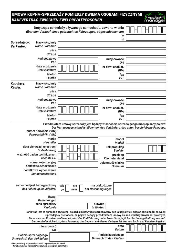 UMOWA KUPNA-SPRZEDAŻY POMIĘDZY DWIEMA OSOBAMI FIZYCZNYMI KAUFVERTRAG ZWISCHEN ZWEI PRIVATPERSONEN Dotycząca sprzedaży używanego samochodu, zawarta w dniu über den Verkauf eines gebrauchtes Fahrzeuges, abgeschlossen am w in Nazwisko, imię Sprzedający: Name, Vorname Verkäufer: ulica Straße kod pocztowy PLZ data urodzenia Geburtsdatum telefon Telefon Kupujący: Käufer: miejscowość Ort nr dow. osobist. BPA fax Fax Nazwisko, imię Name, Vorname ulica Straße kod pocztowy PLZ data urodzenia Geburtsdatum telefon Telefon miejscowość Ort nr dow. osobist. BPA fax Fax Przedmiotem umowy sprzedaży jest będący własnością sprzedającego niżej opisany pojazd: Der Vertagsgegenstand ist Eigentum des Verkäufers, das unten beschriebene Fahrzeug: numer nadwozia (VIN) Fahrgestell-Nr. (VIN) marka model Hersteller Modell data pierwszej rejestracji rok produkcji Erstzulassung Baujahr ważność badan technicznych przebieg nächste HU Kilometerstand numer rejestracyjny pojemność silnika Amtliches Kennzeichen Hubraum dodatkowe wyposażenie Sonderausstattung samochód jest bezwypadkowy das Fahrzeug ist unfallfrei tak ja Uwagi Bemerkungen cena sprzedaży Kaufpreis nie nein ma uszkodzone hat Beschädigungen słownie in Worten Ponieważ jest to sprzedaż prywatna, pojazd silnikowy jest sprzedawany bez jakiejkolwiek odpowiedzialności za wady. Sprzedający oświadcza, że pojazd będący przedmiotem umowy nie ma wad fizycznych ani prawnych. Da es sich um Privatverkauf handelt, wird das Kraftfahrzeug unter Ausschluss jeglicher Sachmängelhaftung verkauft. Der Verkäufer sichert zu, dass Fahrzeug, das Gegenstand dieses Vertages ist, frei von Sach- und Rechtsmängel ist. miejscowość Ort Podpis sprzedającego Unterschrift des Verkäufers * Nie ponosimy odpowiedzialności za prawidłowość treści. Wir übernehmen keine Haftung für die Richtigkeit der Inhalte. data Datum Podpis kupującego Unterschrift des Käufers