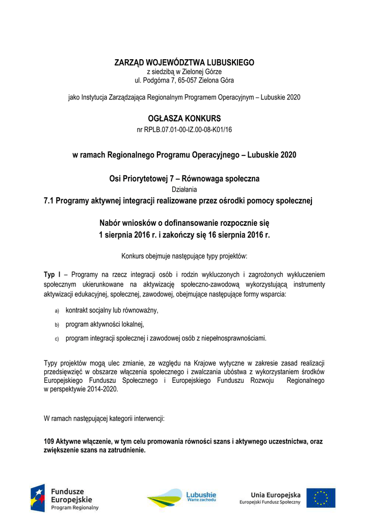 ZARZĄD WOJEWÓDZTWA LUBUSKIEGO z siedzibą w Zielonej Górze ul. Podgórna 7, 65-057 Zielona Góra jako Instytucja Zarządzająca Regionalnym Programem Operacyjnym – Lubuskie 2020 OGŁASZA KONKURS nr RPLB.07.01-00-IZ.00-08-K01/16 w ramach Regionalnego Programu Operacyjnego – Lubuskie 2020 Osi Priorytetowej 7 – Równowaga społeczna Działania 7.1 Programy aktywnej integracji realizowane przez ośrodki pomocy społecznej Nabór wniosków o dofinansowanie rozpocznie się 1 sierpnia 2016 r. i zakończy się 16 sierpnia 2016 r. Konkurs obejmuje następujące typy projektów: Typ I – Programy na rzecz integracji osób i rodzin wykluczonych i zagrożonych wykluczeniem społecznym ukierunkowane na aktywizację społeczno-zawodową wykorzystującą instrumenty aktywizacji edukacyjnej, społecznej, zawodowej, obejmujące następujące formy wsparcia: a) kontrakt socjalny lub równoważny, b) program aktywności lokalnej, c) program integracji społecznej i zawodowej osób z niepełnosprawnościami. Typy projektów mogą ulec zmianie, ze względu na Krajowe wytyczne w zakresie zasad realizacji przedsięwzięć w obszarze włączenia społecznego i zwalczania ubóstwa z wykorzystaniem środków Europejskiego Funduszu Społecznego i Europejskiego Funduszu Rozwoju Regionalnego w perspektywie 2014-2020. W ramach następującej kategorii interwencji: 109 Aktywne włączenie, w tym celu promowania równości szans i aktywnego uczestnictwa, oraz zwiększenie szans na zatrudnienie. Jeśli projekt realizowany jest w następujących formach: „projekt zrealizowany w pełni lub częściowo przez partnerów społecznych lub organizacje pozarządowe” – Partnerzy społeczni to termin szeroko używany w całej Europie w odniesieniu do przedstawicieli pracodawców i pracowników (organizacji pracodawców i związków zawodowych). Organizacja pozarządowa (NGO) to organizacja założona przez obywateli z własnej inicjatywy, która nie działa dla osiągnięcia zysku i jest zorganizowana na szczeblu lokalnym, krajowym lub międzynarodowym. Organizacje pozarządowe - zorientowane na działanie i prowadzone przez ludzi, którym przyświeca wspólny cel – realizują szereg usług i funkcji humanitarnych, przedstawiają rządom państw obawy obywateli, wspierają i monitorują realizację polityk oraz stymulują udział polityków poprzez dostarczanie informacji. Projekt jest częściowo realizowany przez partnerów społecznych lub organizacje pozarządowe, kiedy wśród projektodawców (rozumianych jako beneficjentów lub partnerów projektu) znajdują się m.in. partnerzy społeczni lub organizacje pozarządowe; „projekt ukierunkowany na trwały udział kobiet w zatrudnieniu i rozwoju ich kariery zawodowej” – projekt realizowany w celu zwiększenia trwałego udziału kobiet w zatrudnieniu, a tym samym zwalczania feminizacji ubóstwa, zmniejszenia podziału ze względu na płeć i zwalczania stereotypów dotyczących płci na rynku pracy. W zakresie kształcenia i szkolenia upowszechnienie godzenia życia zawodowego i prywatnego oraz równego podziału obowiązków związanych z opieką pomiędzy mężczyznami i kobietami; definicja opracowana na podstawie: Rozporządzenie Parlamentu Europejskiego i Rady w sprawie Europejskiego Funduszu Społecznego nr 1304/2013, Art. 7. Promowanie równości między kobietami i mężczyznami; „projekt obejmujący administrację publiczną lub służby publiczne na szczeblu krajowym, regionalnym lub lokalnym” – Europejski Fundusz Społeczny wzmacnia zdolności instytucjonalne i skuteczność administracji publicznej na szczeblu krajowym, regionalnym lub lokalnym; należy wykazać projekty realizowane w celu zapewnienia wsparcia w ww. obszarach; za służby publiczne uznaje się publiczne lub prywatne podmioty, które świadczą usługi publiczne (w przypadku usług publicznych zlecanych przez państwo podmiotom prywatnym lub świadczonych w ramach partnerstwa publiczno-prywatnego), Do wsparcia kwalifikują się wyłącznie te projekty, które nie zostały fizycznie (rzeczowo) ukończone lub w pełni zrealizowane przed złożeniem wniosku o dofinansowanie w ramach ogłoszonego konkursu, niezależnie od tego czy wszystkie powiązane płatności zostały dokonane przez Wnioskodawcę. Wartość środków Europejskiego Funduszu Społecznego przeznaczonych na dofinansowanie projektów w ramach konkursu nr RPLB.07.01.00-IZ.00-08-K01/16 dla Działania 7.1 – Programy aktywnej integracji realizowane przez ośrodki pomocy społecznej w ramach RPO – L2020 wynosi: 47 500 000,00 PLN* (w tym na procedurę odwoławczą przewidziano 10% alokacji konkursu, co stanowi 4 750 000 PLN). Środki pochodzą z Europejskiego Funduszu Społecznego. Maksymalny dopuszczalny poziom dofinansowania całkowitego wydatków kwalifikowalnych na poziomie projektu wynosi w przypadku: środków UE - 85%, Wkład własny beneficjenta jako % wydatków kwalifikowalnych - 15% Do składania wniosków w ramach konkursu w terminie od 1 sierpnia 2016 r. do 16 sierpnia 2016 r. uprawnieni są potencjalni beneficjenci: Uprawnionymi do aplikowania w konkursie są następujące typy Beneficjentów: − Jednostki samorządu terytorialnego i ich jednostki organizacyjne - ośrodki pomocy społecznej. Projekty mogą być realizowane również na zasadzie partnerstwa z udziałem następujących Partnerów: ośrodki pomocy społecznej jednostki samorządu terytorialnego (JST) ich związki, stowarzyszenia i porozumienia, jednostki organizacyjne JST posiadające osobowość prawną, organizacje pozarządowe, przedsiębiorstwa i ich związki i stowarzyszenia (mikroprzedsiębiorstwa, małe i średnie przedsiębiorstwa), w tym osoby fizyczne prowadzące działalność gospodarczą, osoby fizyczne prowadzące działalność oświatową na podstawie odrębnych przepisów, instytucje rynku pracy, podmioty ekonomii społecznej, podmioty działające w obszarze rynku pracy, zajmujące się aktywizacją osób wykluczonyc
