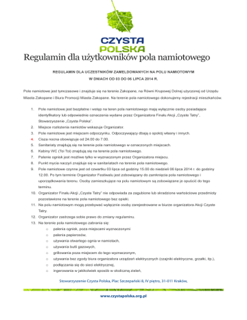 Regulamin dla użytkowników pola namiotowego REGULAMIN DLA UCZESTNIKÓW ZAMELDOWANYCH NA POLU NAMIOTOWYM W DNIACH OD 03 DO 06 LIPCA 2014 R. Pole namiotowe jest tymczasowe i znajduje się na terenie Zakopane, na Równi Krupowej Dolnej użyczonej od Urzędu Miasta Zakopane i Biura Promocji Miasta Zakopane. Na terenie pola namiotowego dokonujemy rejestracji mieszkańców. 1. Pole namiotowe jest bezpłatne i wstęp na teren pola namiotowego mają wyłącznie osoby posiadające identyfikatory lub odpowiednie oznaczenia wydane przez Organizatora Finału Akcji „Czyste Tatry”, Stowarzyszenie „Czysta Polska”. 2. Miejsce rozłożenia namiotów wskazuje Organizator. 3. Pole namiotowe jest miejscem odpoczynku. Odpoczywający dbają o spokój własny i innych. 4. Cisza nocna obowiązuje od 24.00 do 7.00. 5. Sanitariaty znajdują się na terenie pola namiotowego w oznaczonych miejscach. 6. Kabiny WC (Toi Toi) znajdują się na terenie pola namiotowego. 7. Palenie ognisk jest możliwe tylko w wyznaczonym przez Organizatora miejscu. 8. Punkt mycia naczyń znajduje się w sanitariatach na terenie pola namiotowego. 9. Pole namiotowe czynne jest od czwartku 03 lipca od godziny 15.00 do niedzieli 06 lipca 2014 r. do godziny 12.00. Po tym terminie Organizator Festiwalu jest zobowiązany do zamknięcia pola namiotowego i uporządkowania terenu. Osoby zamieszkujące na polu namiotowym są zobowiązane je opuścić do tego terminu. 10. Organizator Finału Akcji „Czyste Tatry” nie odpowiada za zagubione lub skradzione wartościowe przedmioty pozostawione na terenie pola namiotowego bez opieki. 11. Na polu namiotowym mogą przebywać wyłącznie osoby zarejestrowane w biurze organizatora Akcji Czyste Tatry. 12. Organizator zastrzega sobie prawo do zmiany regulaminu. 13. Na terenie pola namiotowego zabrania się: o palenia ognisk, poza miejscami wyznaczonymi o palenia papierosów, o używania otwartego ognia w namiotach, o używania butli gazowych, o grillowania poza miejscem do tego wyznaczonym, o używania bez zgody biura organizatora urządzeń elektrycznych (czajniki elektryczne, grzałki, itp.), o podłączania się do sieci elektrycznej, o ingerowania w jakikolwiek sposób w okoliczną zieleń, Stowarzyszenie Czysta Polska, Plac Szczepański 8, IV piętro, 31-011 Kraków, www.czystapolska.org.pl o dewastowania infrastruktury pola namiotowego, o zakłócania porządku na polu namiotowym, o zaśmiecania terenu pola namiotowego, o wnoszenia niebezpiecznych przedmiotów w tym broni, o wnoszenia i spożywania alkoholu o wnoszenia i używania środków odurzających, o wprowadzania zwierząt na teren campingu, 14. Na terenie Pola Namiotowego nie udostępniamy parkingu dla osób zamieszkałych na terenie pola namiotowego. 15. W razie jakichkolwiek uchybień lub spostrzeżonych zagrożeń wszystkie informacje kierować proszę do biura Organizatora. 16. Należy stosować się do zgodnych z prawem poleceń biura Organizatora i ochrony. 17. Każdy uczestnik pola namiotowego jest zobowiązany do przestrzegania niniejszego regulaminu. Osoby nie przestrzegające powyższego regulaminu zostaną wydalone poza teren pola namiotowego bez możliwości powrotu. Stowarzyszenie Czysta Polska, Plac Szczepański 8, IV piętro, 31-011 Kraków, www.czystapolska.org.pl