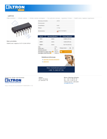 LM723 Pół pr z ewodni ki > Ukł adyscal one > Ukł adyscal oneanal ogowe > Zar z ądz ani eener gi ą-r egul ator yl i ni owe > Stabi l i z ator ynapi ęci ar egul owane N a z wa p ro d u ktu : LM723 P ro d u c en t: C ertyfi ka ty: RoHS Wa g a : 1.72kg Ka rta ka ta logowa D o ku m en ty: O pis pro duktu: Stabi l i z ator napi ęci a2-37 V0,15ADIP14 Ilo ś ć [brutto ] /[netto ] Cena [wa luta ] 50+ netto 0,98 8 3[PLN] 200+ netto 0,9119[PLN] 500+ netto 0,8 7 33[PLN] Vat: Ilośćmin.: Wielokrotność: 23% 50 50sz t. Dostępnewciąg u 3d ni: Dostępne:2017-03-27 925sz t. 1000sz t Pod ajIlość: 50 + - dokosz yka Maszdodatkowepytania? +48713439755 Wł aści ci el skl epui nter netowego: https://skl ep.el tr on.pl /pl /p/18 47 50404339/l m 7 23 Adres : 50-07 1Wr ocł aw pl .Wol ności 7 B Biuro O bs ługiKlienta : tel .:+48 7 134397 55 fax+48 7 13441141 Infol i ni apn-pt.8 .00-16.00 skl ep@ el tr on.pl