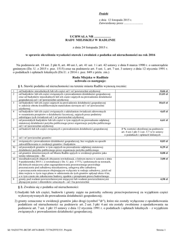 Projekt z dnia 12 listopada 2015 r. Zatwierdzony przez ......................... UCHWAŁA NR .................... RADY MIEJSKIEJ W RADLINIE z dnia 24 listopada 2015 r. w sprawie określenia wysokości stawek i zwolnień z podatku od nieruchomości na rok 2016 Na podstawie art. 18 ust. 2 pkt 8, art. 40 ust.1, art. 41 ust. 1 i art. 42 ustawy z dnia 8 marca 1990 r. o samorządzie gminnym (Dz. U. z 2015 r. poz. 1515) oraz na podstawie art. 5 ust. 1, art. 7 ust. 3 ustawy z dnia 12 stycznia 1991 r. o podatkach i opłatach lokalnych (Dz.U. z 2014 r. poz. 849 z późn. zm.) Rada Miejska w Radlinie uchwala co następuje: § 1. Stawki podatku od nieruchomości na terenie miasta Radlin wynoszą rocznie: od budynków mieszkalnych lub ich części od 1 m2 powierzchni użytkowej od budynków lub ich części związanych z prowadzeniem działalności gospodarczej oraz od budynków mieszkalnych lub ich części zajętych na prowadzenie działalności gospodarczej od 1 m2 powierzchni użytkowej od budynków lub ich części zajętych na prowadzenie działalności gospodarczej w zakresie obrotu kwalifikowanym materiałem siewnym od 1 m2 powierzchni użytkowej od budynków lub ich części związanych z udzielaniem świadczeń zdrowotnych w rozumieniu przepisów o działalności leczniczej, zajętych przez podmioty udzielające tych świadczeń od 1 m2 powierzchni użytkowej od pozostałych budynków lub ich części w tym zajętych na prowadzenie odpłatnej statutowej działalności pożytku publicznego przez organizacje pożytku publicznego od 1 m2 powierzchni użytkowej od budowli lub ich części związanych z prowadzeniem działalności gospodarczej 1 2 3 4 5 6 7 a) b) c) d) 8 od 1 m2 powierzchni gruntów: związanych z prowadzeniem działalności gospodarczej, bez względu na sposób zakwalifikowania w ewidencji gruntów i budynków od pozostałych gruntów w tym zajętych na prowadzenie odpłatnej statutowej działalności pożytku publicznego przez organizacje pożytku publicznego od gruntów dzierżawionych od Miasta Radlin ujętych w ewidencji gruntów jako tereny rekreacyjne – Bz niezabudowanych objętych obszarem rewitalizacji, o którym mowa w ustawie z dnia 9 października 2015 r. o rewitalizacji ( Dz. U. poz. 1777), i położonych na terenach, dla których miejscowy plan zagospodarowania przestrzennego przewiduje przeznaczenie pod zabudowę mieszkaniową, usługową albo zabudowę o przeznaczeniu mieszanym obejmującym wyłącznie te rodzaje zabudowy, jeżeli od dnia wejścia w życie tego planu w odniesieniu do tych gruntów upłynął okres 4 lat, a w tym czasie nie zakończono budowy zgodnie z przepisami prawa budowlanego grunty pod wodami powierzchniowymi stojącymi lub wodami powierzchniowymi płynącymi jezior i zbiorników sztucznych - od 1 ha powierzchni 0,66 zł 21,03 zł 10,63 zł 4,65 zł 6,61 zł 2 % wartości określonej na podstawie art. 4 ust.1 pkt 3 i ust. 3-7 w/w ustawy o podatkach i opłatach loklanych 0,83 zł 0,29 zł 0,08 zł 3,00 zł 4,58 zł § 2. Zwalnia się z podatku od nieruchomości: 1) budynki lub ich części, budowle i grunty zajęte na potrzeby ochrony przeciwpożarowej za wyjątkiem części wykorzystywanych do prowadzenia działalnośći gospodarczej; 2) grunty oznaczone w ewidencji gruntów jako drogi (symbol "dr"), które nie zostały wyłączone z opodatkowania podatkiem od nieruchomości na podstawie art. 2 ust. 3 pkt 4 ani nie zostały zwolnione z opodatkowania na podstawie art. 7 ust. 1 pkt 15 ustawy z dnia 12 stycznia 1991 r. o podatkach i opłatach lokalnych – z wyjątkiem związanych z prowadzeniem działalności gospodarczej. Id: 9AE83791-BCDF-4874-B46E-737562FFE535. Projekt Strona 1 § 3. Z dniem wejścia w życie niniejszej uchwały traci moc uchwała Nr BRM.0007.082.2014 Rady Miejskiej w Radlinie z dnia 28 paździenika 2014 r. w sprawie określenia wysokości stawek i zwolnień z podatku od nieruchomości na 2015 r. § 4. Wykonanie uchwały powierza się Burmistrzowi Radlina. § 5. Uchwała wchodzi w życie z dniem 1 stycznia 2016 r. § 6. Uchwałę podlega ogłoszeniu w Dzienniku Urzędowym Województwa Śląskiego oraz wywieszeniu na tablicy ogłoszeń Urzędu Miasta Radlin i BIP. Id: 9AE83791-BCDF-4874-B46E-737562FFE535. Projekt Strona 2 Uzasadnienie Na podstawie art. 20 ustawy z dnia 12 stycznia 1991r. o podatkach i opłatach lokalnych górne granice stawek kwotowych m.in. podatku od nieruchomości ulegają corocznie zmianie na następny rok podatkowy w stopniu odpowiadającym wskaźnikowi cen towarów i usług konsumpcyjnych w okresie pierwszego półrocza roku, w którym stawki ulegają zmianie, w stosunku do analogicznego okresu roku poprzedniego. Wskaźnik wzrostu cen ustala się na podstawie komunikatu Prezesa Głównego Urzędu Statystycznego ogłoszonego w Monitorze Polskim w terminie 20 dni po upływie pierwszego półrocza. Na podstawie komunikatu Prezesa Głównego Urzędu Statystycznego z dnia 15 lipca 2015r. ( MP z 2015r., poz. 640) wskaźnik cen towarów i usług konsumpcyjnych w I półroczu 2015r. w stosunku do I półrocza 2014r. wyniósł 98,8 (spadek cen o 1,2%). Mając na uwadze powyższy wskaźnik minister właściwy do spraw finansów publicznych ogłasza w drodze obwieszczenia, w Dzienniku Urzędowym Rzeczypospolitej Polskiej „Monitor Polski”, górne granice stawek kwotowych podatków i opłat lokalnych na każdy rok podatkowy. Stawki te na rok 2016 zostały ogłoszone w obwieszczeniu Ministra Finansów z dnia 5 sierpnia 2015r. (MP z 2015r., poz.735) Proponuje się wzrost stawek podatku od nieruchomości o 2 grosze w stosunku do roku poprzedniego. Żadna z tych stawek nie osiągnęła pułapu stawki maksymalnej. Wprowadzono również do uchwały nową kategorię gruntów, tzn.”gruntów pod wodami powierzchniowymi stojącymi lub wodami powierzchniowymi płynącymi jezior i zbiorników sztucznych”, wynikającą z ustawy z dnia 25.06.2015r. o zmianie ustawy o samorządzie gminnym oraz niektórych ustaw oraz z u