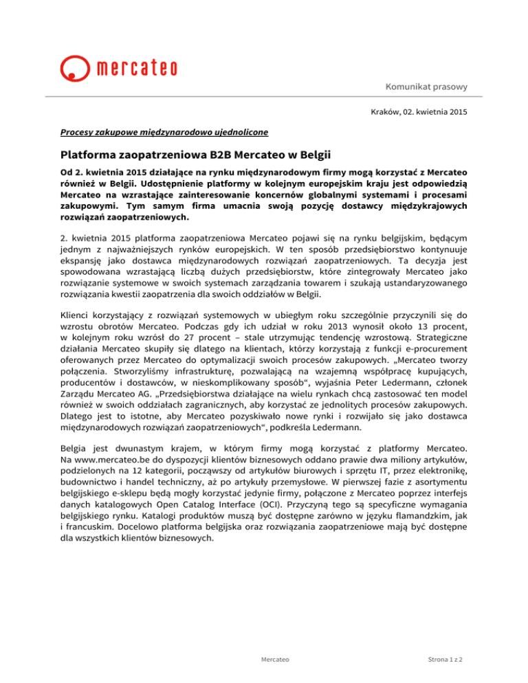 Komunikat prasowy Kraków, 02. kwietnia 2015 Procesy zakupowe międzynarodowo ujednolicone Platforma zaopatrzeniowa B2B Mercateo w Belgii Od 2. kwietnia 2015 działające na rynku międzynarodowym firmy mogą korzystać z Mercateo również w Belgii. Udostępnienie platformy w kolejnym europejskim kraju jest odpowiedzią Mercateo na wzrastające zainteresowanie koncernów globalnymi systemami i procesami zakupowymi. Tym samym firma umacnia swoją pozycję dostawcy międzykrajowych rozwiązań zaopatrzeniowych. 2. kwietnia 2015 platforma zaopatrzeniowa Mercateo pojawi się na rynku belgijskim, będącym jednym z najważniejszych rynków europejskich. W ten sposób przedsiębiorstwo kontynuuje ekspansję jako dostawca międzynarodowych rozwiązań zaopatrzeniowych. Ta decyzja jest spowodowana wzrastającą liczbą dużych przedsiębiorstw, które zintegrowały Mercateo jako rozwiązanie systemowe w swoich systemach zarządzania towarem i szukają ustandaryzowanego rozwiązania kwestii zaopatrzenia dla swoich oddziałów w Belgii. Klienci korzystający z rozwiązań systemowych w ubiegłym roku szczególnie przyczynili się do wzrostu obrotów Mercateo. Podczas gdy ich udział w roku 2013 wynosił około 13 procent, w kolejnym roku wzrósł do 27 procent – stale utrzymując tendencję wzrostową. Strategiczne działania Mercateo skupiły się dlatego na klientach, którzy korzystają z funkcji e-procurement oferowanych przez Mercateo do optymalizacji swoich procesów zakupowych. „Mercateo tworzy połączenia. Stworzyliśmy infrastrukturę, pozwalającą na wzajemną współpracę kupujących, producentów i dostawców, w nieskomplikowany sposób“, wyjaśnia Peter Ledermann, członek Zarządu Mercateo AG. „Przedsiębiorstwa działające na wielu rynkach chcą zastosować ten model również w swoich oddziałach zagranicznych, aby korzystać ze jednolitych procesów zakupowych. Dlatego jest to istotne, aby Mercateo pozyskiwało nowe rynki i rozwijało się jako dostawca międzynarodowych rozwiązań zaopatrzeniowych“, podkreśla Ledermann. Belgia jest dwunastym krajem, w którym firmy mogą korzystać z platformy Mercateo. Na www.mercateo.be do dyspozycji klientów biznesowych oddano prawie dwa miliony artykułów, podzielonych na 12 kategorii, począwszy od artykułów biurowych i sprzętu IT, przez elektronikę, budownictwo i handel techniczny, aż po artykuły przemysłowe. W pierwszej fazie z asortymentu belgijskiego e-sklepu będą mogły korzystać jedynie firmy, połączone z Mercateo poprzez interfejs danych katalogowych Open Catalog Interface (OCI). Przyczyną tego są specyficzne wymagania belgijskiego rynku. Katalogi produktów muszą być dostępne zarówno w języku flamandzkim, jak i francuskim. Docelowo platforma belgijska oraz rozwiązania zaopatrzeniowe mają być dostępne dla wszystkich klientów biznesowych. Mercateo Strona 1 z 2 Komunikat prasowy [Fotografia: Mercateo. Platforma zaopatrzeniowa B2B online w Belgii] O Mercateo Mercateo jest wiodąca europejską platformą zaopatrzeniową online dla klientów biznesowych. Na www.mercateo.com.pl oferujemy polskim przedsiębiorstwom asortyment składający się z ponad 1,7 mln. artykułów, podzielonych na kategorie, jak np. artykuły biurowe, sprzęt IT, artykuły przemysłowe czy wyposażenie zakładów i magazynów. W ofercie firmy znajdują się zarówno standardowe produkty, jak i specjalistyczny sprzęt oraz artykuły niszowe. Do klientów Mercateo należą przedsiębiorstwa wszystkich formatów, począwszy od firm jednoosobowych oraz osób wykonujących wolne zawody, poprzez podmioty publiczne, a skończywszy na koncernach. Przedsiębiorstwa mogą nie tylko korzystać z asortymentu standardowego, ale również zintegrować na platformie swoich dostawców na umowach ramowych i stosować modułowy system funkcji e-procurement. Należą do nich hosting katalogów, spersonalizowane widoki oraz oznakowania produktów, cyfrowy proces zatwierdzania ApproveNow oraz elektroniczne interfejsy w wewnętrznym systemie klienta. Mercateo jest obecne w 12 europejskich krajach i zatrudnia ponad 300 pracowników. Z średnimi rocznymi obrotami w wysokości 25 procent, Mercateo osiągnęło w 2014 roku obroty w wysokości 160 milionów euro. Kontakt: Mercateo Polska Sp. z o.o. Gabriela Kolarczyk ul. Stefana Batorego 25 31-135 Kraków Telefon: +48 12 681 64 19 E-mail: [email protected] WWW: www.mercateo.com.pl Mercateo Strona 2 z 2