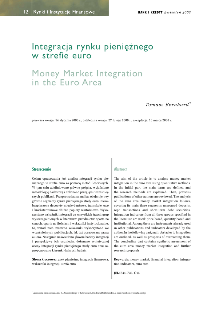 12 Rynki i Instytucje Finansowe Bank i K redyt kwiecień 2008 Integracja rynku pieni´˝nego w strefie euro Money Market Integration in the Euro Area Tomasz Bernhard * pierwsza wersja: 14 stycznia 2008 r., ostateczna wersja: 27 lutego 2008 r., akceptacja: 10 marca 2008 r. Streszczenie Abstract Celem opracowania jest analiza integracji rynku pieniężnego w strefie euro za pomocą metod ilościowych. W tym celu zdefiniowano główne pojęcia, wyjaśniono metodologię badawczą i dokonano przeglądu wcześniejszych publikacji. Przeprowadzona analiza obejmuje trzy główne segmenty rynku pieniężnego strefy euro: niezabezpieczone depozyty międzybankowe, transakcje repo i krótkoterminowe dłużne papiery wartościowe. Wykorzystano wskaźniki integracji ze wszystkich trzech grup wyszczególnionych w literaturze przedmiotu: oparte na cenach, oparte na ilościach i wskaźniki instytucjonalne. Są wśród nich zarówno wskaźniki wykorzystane we wcześniejszych publikacjach, jak też opracowane przez autora. Następnie naświetlono główne bariery integracji i perspektywy ich usunięcia, dokonano syntetycznej oceny integracji rynku pieniężnego strefy euro oraz zaproponowano kierunki dalszych badań. The aim of the article is to analyse money market integration in the euro area using quantitative methods. In the initial part the main terms are defined and the research methods are explained. Then, previous publications of other authors are reviewed. The analysis of the euro area money market integration follows, covering its main three segments: unsecured deposits, repo transactions and short-term debt securities. Integration indicators from all three groups specified in the literature are used: price-based, quantity-based and institutional. Among them are instruments already used in other publications and indicators developed by the author. In the following part, main obstacles to integration are outlined, as well as prospects of overcoming them. The concluding part contains synthetic assessment of the euro area money market integration and further research proposals. Słowa kluczowe: rynek pieniężny, integracja finansowa, wskaźniki integracji, strefa euro Keywords: money market, financial integration, integration indicators, euro area JEL: E44, F36, G15 * Akademia Ekonomiczna im. K. Adamieckiego w Katowicach, Studium Doktoranckie, e-mail: [email protected] B a n k i Kr e dy t k w i e c i e ń 2 0 0 8 1. Wstęp W drugiej połowie XX w. w gospodarce światowej zaszły zmiany, które istotnie wpłynęły na warunki funkcjonowania europejskich instytucji finansowych. Postępująca globalizacja oraz wzrost znaczenia centrów finansowych USA i Japonii postawiły przed stosunkowo niewielkimi rynkami finansowymi krajów europejskich wyzwania konkurencyjne, którym trudno byłoby samodzielnie sprostać. W latach 80. w krajach Europejskiej Wspólnoty Gospodarczej coraz bardziej upowszechniał się pogląd, że bez zdynamizowania procesu integracji gospodarczej oraz jego poszerzenia o wymiar finansowy kraje europejskie nie będą w stanie nawiązać równorzędnej walki na globalnym rynku. W coraz większym stopniu uświadamiano sobie również korzyści z integracji walutowej, do czego przyczyniły się rozwój teorii optymalnych obszarów walutowych oraz inne współczesne osiągnięcia w teorii ekonomii. Wymienione zjawiska ułatwiły osiągnięcie zgody politycznej krajów europejskich na zdynamizowanie procesów integracyjnych. Zdecydowano o dokończeniu budowy wspólnego rynku oraz przejściu do wyższego stadium integracji gospodarczej poprzez utworzenie Unii Gospodarczej i Walutowej (UGW). Integracja monetarna stała się faktem w 1999 r., kiedy jedenaście krajów Unii Europejskiej (UE) wprowadziło wspólną walutę euro i ostatecznie zrezygnowało z samodzielnej polityki monetarnej na rzecz nowo utworzonego Europejskiego Banku Centralnego (EBC). Usunięcie barier związanych z istnieniem odrębnych walut narodowych i polityki pieniężnej istotnie przyczyniło się do poprawy warunków funkcjonowania instytucji finansowych na rynku unijnym. Jednocześnie bardziej odczuwalne stały się inne bariery, wynikające z fragmentacji europejskiego rynku finansowego, której źródłem są odmienne charakterystyki poszczególnych rynków krajowych. Integracja monetarna zwiększyła konieczność integracji rynku finansowego UGW ze względu na jego rolę w funkcjonowaniu wspólnej polityki pieniężnej. Unia Europejska stanęła przed wyzwaniem usunięcia wielu barier ekonomicznych i prawnych, które utrudniają pełną integrację rynków finansowych krajów członkowskich. Zdecydowano o podjęciu działań na rzecz budowy jednolitego europejskiego rynku finansowego, który zapewniałby równe warunki konkurencji europejskim instytucjom finansowym niezależnie od kraju pochodzenia, sprzyjałby efektywnej alokacji zasobów oraz dawałby więcej szans na osiągnięcie korzyści i uniknięcie zagrożeń związanych z integracją walutową. Stworzenie jednolitego europejskiego rynku finansowego wymaga osiągnięcia pełnej integracji we wszystkich jego segmentach. Odnosi się to również do rynku pieniężnego. Problematyka integracji rynków pieniężnych strefy euro jest rzadko obecna w literaturze Financial Markets and Institutions 13 krajowej. Zdecydowanie więcej pozycji można znaleźć w literaturze anglojęzycznej, jednak dotychczas opublikowane badania empiryczne dotyczące integracji rynku pieniężnego strefy euro z reguły nie obejmowały jego trzech głównych segmentów. Wyjątek stanowią ostatnie publikacje EBC podejmujące ten temat, w których jednak zastosowano dość ograniczoną liczbę wskaźników opartych na ilościach i instytucjonalnych. Ograniczając się przeważnie do segmentu niezabezpieczonych depozytów międzybankowych i w mniejszej liczbie przypadków do segmentu transakcji repo, pomijając rynek krótkoterminowych dłużnych papierów wartościowych oraz stosując