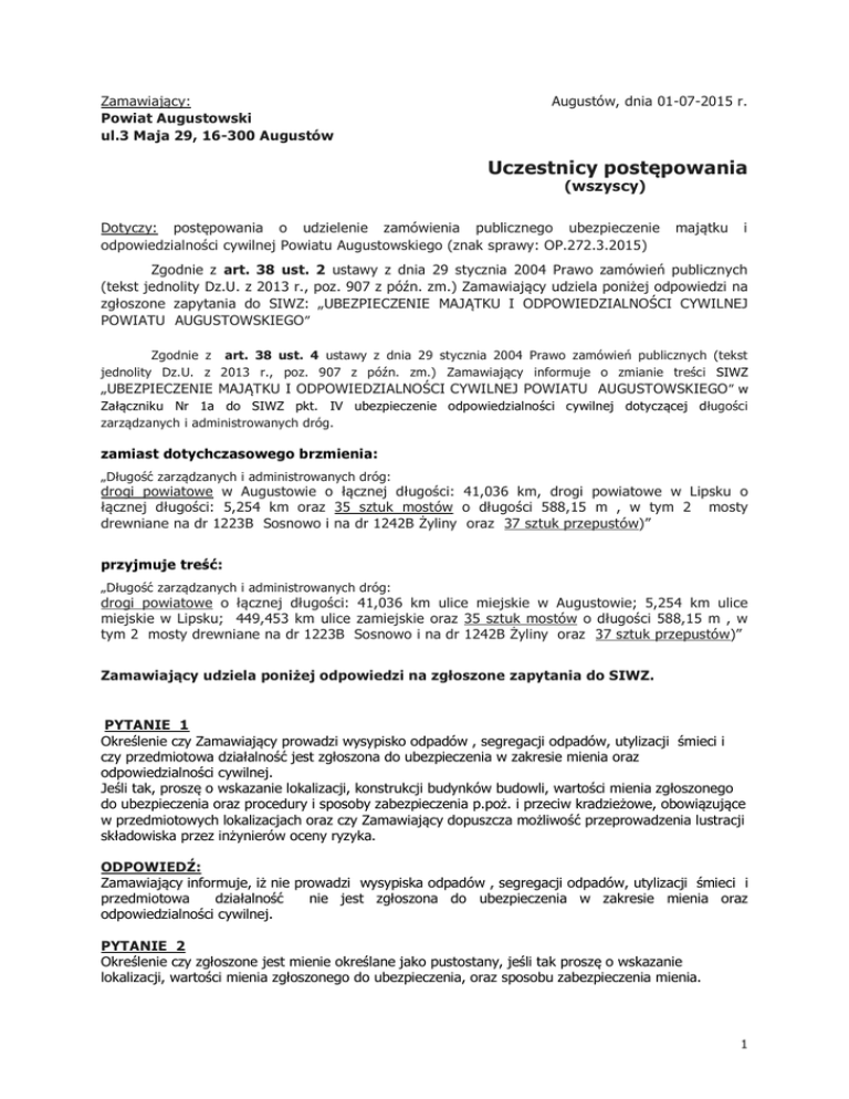 Zamawiający: Powiat Augustowski ul.3 Maja 29, 16-300 Augustów Augustów, dnia 01-07-2015 r. Uczestnicy postępowania (wszyscy) Dotyczy: postępowania o udzielenie zamówienia publicznego ubezpieczenie odpowiedzialności cywilnej Powiatu Augustowskiego (znak sprawy: OP.272.3.2015) majątku i Zgodnie z art. 38 ust. 2 ustawy z dnia 29 stycznia 2004 Prawo zamówień publicznych (tekst jednolity Dz.U. z 2013 r., poz. 907 z późn. zm.) Zamawiający udziela poniżej odpowiedzi na zgłoszone zapytania do SIWZ: „UBEZPIECZENIE MAJĄTKU I ODPOWIEDZIALNOŚCI CYWILNEJ POWIATU AUGUSTOWSKIEGO ” Zgodnie z art. 38 ust. 4 ustawy z dnia 29 stycznia 2004 Prawo zamówień publicznych (tekst jednolity Dz.U. z 2013 r., poz. 907 z późn. zm.) Zamawiający informuje o zmianie treści SIWZ „UBEZPIECZENIE MAJĄTKU I ODPOWIEDZIALNOŚCI CYWILNEJ POWIATU AUGUSTOWSKIEGO ” w Załączniku Nr 1a do SIWZ pkt. IV ubezpieczenie odpowiedzialności cywilnej dotyczącej długości zarządzanych i administrowanych dróg. zamiast dotychczasowego brzmienia: „Długość zarządzanych i administrowanych dróg: drogi powiatowe w Augustowie o łącznej długości: 41,036 km, drogi powiatowe w Lipsku o łącznej długości: 5,254 km oraz 35 sztuk mostów o długości 588,15 m , w tym 2 mosty drewniane na dr 1223B Sosnowo i na dr 1242B Żyliny oraz 37 sztuk przepustów)” przyjmuje treść: „Długość zarządzanych i administrowanych dróg: drogi powiatowe o łącznej długości: 41,036 km ulice miejskie w Augustowie; 5,254 km ulice miejskie w Lipsku; 449,453 km ulice zamiejskie oraz 35 sztuk mostów o długości 588,15 m , w tym 2 mosty drewniane na dr 1223B Sosnowo i na dr 1242B Żyliny oraz 37 sztuk przepustów)” Zamawiający udziela poniżej odpowiedzi na zgłoszone zapytania do SIWZ. PYTANIE 1 Określenie czy Zamawiający prowadzi wysypisko odpadów , segregacji odpadów, utylizacji śmieci i czy przedmiotowa działalność jest zgłoszona do ubezpieczenia w zakresie mienia oraz odpowiedzialności cywilnej. Jeśli tak, proszę o wskazanie lokalizacji, konstrukcji budynków budowli, wartości mienia zgłoszonego do ubezpieczenia oraz procedury i sposoby zabezpieczenia p.poż. i przeciw kradzieżowe, obowiązujące w przedmiotowych lokalizacjach oraz czy Zamawiający dopuszcza możliwość przeprowadzenia lustracji składowiska przez inżynierów oceny ryzyka. ODPOWIEDŹ: Zamawiający informuje, iż nie prowadzi wysypiska odpadów , segregacji odpadów, utylizacji śmieci i przedmiotowa działalność nie jest zgłoszona do ubezpieczenia w zakresie mienia oraz odpowiedzialności cywilnej. PYTANIE 2 Określenie czy zgłoszone jest mienie określane jako pustostany, jeśli tak proszę o wskazanie lokalizacji, wartości mienia zgłoszonego do ubezpieczenia, oraz sposobu zabezpieczenia mienia. 1 ODPOWIEDŹ: Zamawiający informuje, iż szczegółowy opis przedmiotu zamówienia, w tym budynki nieużytkowane, wraz z sumami ubezpieczenia został podany w załączniku nr 1a do SIWZ. Dwa budynki nieużytkowane wykazuje Powiatowy Zarząd Dróg w Augustowie , lokalizacja ul. Wojska Polskiego 54. Budynki znajdują się na ogrodzonym placu, media są odcięte. PYTANIE 3 Określenie czy zgłoszone są do ubezpieczenia budynki budowle o konstrukcji drewnianej, oraz mienie znajdujące się w tych budynkach. Jeśli tak, proszę o wskazanie lokalizacji, wartości mienia zgłoszonego do ubezpieczenia. ODPOWIEDŹ: Zamawiający informuje, iż szczegółowy opis przedmiotu zamówienia, w tym budynki drewniane wraz z sumami ubezpieczenia został podany w załączniku nr 1a do SIWZ. PYTANIE 4 Określenie czy zgłoszone są do ubezpieczenia budowle takie jak mosty, drogi od zdarzeń losowych, jeśli tak proszę o podanie sum ubezpieczenia. ODPOWIEDŹ: Zamawiający informuje, iż szczegółowy opis przedmiotu zamówienia wraz z sumami ubezpieczenia został podany w załączniku nr 1a do SIWZ. W ramach ubezpieczenia mienia od wszystkich ryzyk zostały zgłoszone drogi powiatowe, mosty i przepusty systemem pierwszego ryzyka na sumę ubezpieczenia: 50 000,00 zł na jedno i wszystkie zdarzenia w każdym okresie ubezpieczenia (pkt 2.4.10. SIWZ ) PYTANIE 5 Proszę o wyjaśnienie zapisu – „ 2.1.19. pojazdy niepodlegające obowiązkowej rejestracji oraz pojazdy nieubezpieczone w zakresie ubezpieczenia auto casco” Czy ubezpieczeniem mają być objęte pojazdy mechaniczne – podlegające rejestracji a nie mające wykupionego ubezpieczenia komunikacyjnego AC. Oraz czy suma ubezpieczenia jest w systemie sum stałych – czy jest wykaz mienia zgłoszonego do ubezpieczenia w ramach zapisu „Ubezpieczenie pojazdów niepodlegających obowiązkowej rejestracji oraz pojazdów nieubezpieczonych w zakresie ubezpieczenia auto casco, wyłącznie w miejscu ubezpieczenia. Suma ubezpieczenia: 100 000,00 zł na jedno i wszystkie zdarzenia w każdym okresie ubezpieczenia. Suma ubezpieczenia w wartości księgowej brutto lub rynkowej” ODPOWIEDŹ: Zamawiający informuje, iż zgodnie z zapisami Załącznika nr 1 a do SIWZ pkt. 2.4.11. ubezpieczeniem w systemie pierwszego ryzyka mają być objęte pojazdy niepodlegające obowiązkowej rejestracji oraz pojazdy nieubezpieczone w zakresie ubezpieczenia auto casco, wyłącznie w miejscu ubezpieczenia. Suma ubezpieczenia: 100 000,00 zł na jedno i wszystkie zdarzenia w każdym okresie ubezpieczenia. Suma ubezpieczenia w wartości księgowej brutto lub rynkowej. PYTANIE 6 Określenie łącznej sumy ubezpieczenia mienia zgłoszonego do ubezpieczenia w zakresie : Ubezpieczenie mienia od wszystkich ryzyk Ubezpieczenie sprzętu elektronicznego od wszystkich ryzyk z podziałem na stacjonarny i przenośny. ODPOWIEDŹ: Zamawiający informuje, iż łączna suma ubezpieczenia mienia zgłoszonego do ubezpieczenia w zakresie: Ubezpieczenie mienia od wszystkich ryzyk - wynosi 105 782 544 zł 2 Ubezpieczenie sprzętu elektronicznego od wszystkich ryzyk wynosi : stacjonarny 12 905 568,79 zł i przenośny 584 440,38 zł. PYTANIE 7