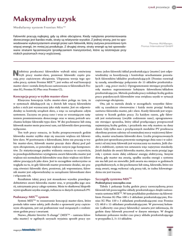 rynek prezentacje Maksymalny uzysk Modularny system Fronius Mix™ Falowniki pracują najlepiej, gdy są silnie obciążone. Kiedy natężenie promieniowania słonecznego jest bardzo małe, straty są relatywnie wysokie. Z jednej strony, jest to spowodowane wykorzystaniem energii przez sam falownik, który zużywa procentowo tym więcej energii, im mniej jej produkuje. Z drugiej strony, straty energii są też spowodowane stratami łączeniowymi (przełączaniem tranzystorów), które są istotniejsze przy niskich poziomach mocy wyjściowej. N iektórzy producenci falowników wybrali niżej omówiony tryb pracy master-slave, ponieważ falowniki często pracują przy częściowym obciążeniu. Ulepszona wersja tego sposobu pracy, system Fronius MIXTM, jest wolna od wad koncepcji master-slave i została dotychczas zastosowana w falownikach Fronius IG, Fronius IG Plus oraz Fronius CL. Koncepcja pracy w trybie master-slave Klasyczna koncepcja trybu master-slave polega na tym, że w systemach składających się z dwóch lub więcej falowników jeden z nich jest wyznaczany jako stały master. Jest on odpowiedzialny za kontrolę urządzeń slave, a więc za zarządzanie całym systemem. Zaczyna on pracę rano i wraz ze wzrastającym natężeniem promieniowania słonecznego oraz w miarę potrzeb uruchamia kolejne falowniki typu slave. W dni pochmurne lub zimą falownik master może pracować sam, zaś falowniki slave pozostają wyłączone. Ten tryb pracy oznacza, że liczba przepracowanych godzin falownika master szybko staje się znacznie większa niż falowników slave. W porównaniu z falownikami, które nie pracują w trybie master-slave, falownik master pracuje dużo dłużej pod pełnym obciążeniem, co powoduje większe zużycie jego komponentów. Ze statystycznego punktu widzenia oznacza to oczywiście, że prawdopodobieństwo wystąpienia awarii falownika master jest większe niż normalnych falowników oraz dużo większe niż falowników pracujących jako slave. Jest to szczególnie niekorzystne ze względu na to, że gdy falownik master przestanie działać, nie pracują również falowniki slave, ponieważ, jak wspomniano, falownik master jest odpowiedzialny za zarządzanie falownikami slave i włączanie ich. Rezultatem takiej pracy jest stosunkowo wysokie prawdopodobieństwo awarii falownika master oraz, w przypadku jego awarii, zatrzymanie pracy całego systemu. Może to skutkować kłopotliwymi spadkami uzysku energii, zwłaszcza w dużych systemach PV. Podstawy: MIXTM system System MIXTM to rozszerzenie koncepcji master-slave, które posiada takie same zalety, jeśli chodzi o sprawność przy częściowym obciążeniu, jest zaś pozbawione wad związanych z rozłożeniem godzin pracy i awariami. Nazwa „Master Inverter X-change” (MIXTM – zamiana falownika master) w ogólnych zarysach wyjaśnia sposób pracy sys- magazyn fotowoltaika 3/2012 Thomas Mühlberger, Fronius International GmbH temu: jeden falownik/układ przekształcający (master) jest odpowiedzialny za koordynację i kontroluje uruchamianie pozostałych falowników/układów przekształcających (Fronius rozwinął tę zasadę, umożliwiając połączenie do 15 układów przekształcających – ang. power stacks). Oprogramowanie sterujące przydziela rolę mastera naprzemiennie kolejnym falownikom/układom przekształcającym. Metoda podziału pracy redukuje liczbę godzin pracy pojedynczych falowników oraz zwiększa uzyski w sytuacji częściowego obciążenia. Oto, jak ta metoda działa w szczegółach: wszystkie falowniki są zasadniczo równoważne i każdy może przejąć funkcję zarówno falownika master, jak i slave. Każdy falownik jest wyposażony w licznik godzin pracy. Za każdym razem, gdy falownik jest restartowany (zwykle codziennie rano), oprogramowanie sterujące sprawdza, który układ przełączający przepracował najmniejszą liczbę godzin, i przydziela mu rolę mastera na dany dzień. Gdy tylko moc z przyłączonych modułów PV przekracza określony poziom zależny od nominalnej mocy wyjściowej falownika, master uruchamia falowniki slave. Liczba przepracowanych godzin jest sprawdzana ponownie następnego dnia rano i w zależności od niej inny falownik jest wyznaczany na mastera. Jeśli chodzi o stabilność, system ten ustanawia więc najwyższe standardy. Jeżeli dojdzie do awarii falownika master, slave może przejąć jego rolę i system może dalej oddawać energię elektryczną. Innymi słowy, gdy master ma awarię, spadku uzysku energii z systemu nie ma lub jest on niewielki. Jeśli awaria ma miejsce w godzinach popołudniowych, w dni pochmurne lub zimą, falowniki, które nie mają awarii, mogą wykonać całą pracę tak, że żadna kilowatogodzina nie jest tracona. Szczegóły systemu MIXTM Podział pracy oszczędza czas Tabela 1 pokazuje liczbę godzin pracy zaoszczędzoną przez falownik lub poszczególne układy przekształcające dzięki zastosowaniu systemu MIXTM. W tym przykładzie posłużono się falownikiem Fronius IG Plus 100 z 2 układami przekształcającymi, Fronius IG Plus 150 z 3 układami przekształcającymi oraz Fronius CL 60.0 z 15 układami przekształcającymi. W pierwszej kolumnie (całkowity czas pracy falownika) zawarta jest informacja, ile godzin dany falownik pracował w danym miesiącu. W drugiej kolumnie pokazano średni czas pracy układu przekształcającego w przypadku 2, 3 i 15 układów. 41 rynek prezentacje Tabela 1. Zaoszczędzone godziny pracy układów przekształcających dzięki koncepcji MIXTM Współczynnik MIXTM średni Liczba zaoszczędzonych Całkowity czas pracy Średni czas pracy układu czas pracy zaoszczędzony/ godzin pracy/ układ przekszt. falownika [h] przekształcającego [h] jeden układ przekszt. [%] [h] Miesiąc Liczba układów przekształcających Grudzień Lipiec Średnia wartość z 12 miesięcy 241 469 357 2 3 15 2 3 15 2 3 15 139 334 234 109 299 201 71 265 166 42 29 34 55 36 44 71 43 53 102 135 123 132 170 156 1