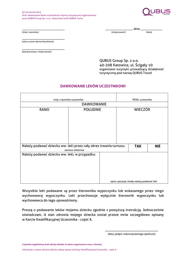 QT-02-09-DL/2013 druk: dawkowanie leków uczestnikowi imprezy turystycznej organizowanej przez QUBUS Group Sp. z o.o., właściciela marki QUBUS Travel ___________________________ _________________, dnia ______________ (imię i nazwisko) (miejscowość) (data) ___________________________ (ulica, numer domu/mieszkania) ___________________________ (kod pocztowy i miejscowość) QUBUS Group Sp. z o.o. 40-208 Katowice, ul. Ścigały 10 organizator turystyki, prowadzący działalność turystyczną pod nazwą QUBUS Travel DAWKOWANIE LEKÓW UCZESTNIKOWI imię i nazwisko uczestnika RANO PESEL uczestnika DAWKOWANIE POŁUDNIE WIECZÓR Należy podawać dziecku ww. leki przez cały okres trwania turnusu. TAK NIE zaznacz właściwe Należy podawać dziecku ww. leki, w przypadku: opisz sytuacje, kiedy należy podawać leki Wszystkie leki podawane są przez kierownika wypoczynku lub wskazanego przez niego wychowawcę wypoczynku. Leki przechowuje wyłącznie kierownik wypoczynku lub wychowawca do tego upoważniony. Proszę o podawanie leków mojemu dziecku zgodnie z powyższą instrukcją. Jednocześnie oświadczam, iż stan zdrowia mojego dziecka został przeze mnie szczegółowo opisany w Karcie Kwalifikacyjnej Uczestnika - część A. ____________________________ (data, podpis rodzica/prawnego opiekuna) Czytelnie wypełniony druk należy odesłać na adres organizatora wraz z Umową. Informacje o stanie zdrowia dziecka należy wpisać do Karty Kwalifikacyjnej Uczestnika - część A.