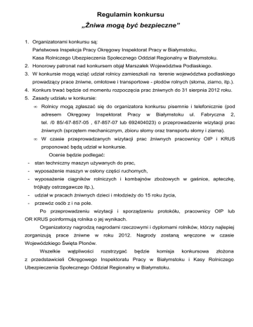 Regulamin konkursu „Żniwa mogą być bezpieczne” 1. Organizatorami konkursu są: Państwowa Inspekcja Pracy Okręgowy Inspektorat Pracy w Białymstoku, Kasa Rolniczego Ubezpieczenia Społecznego Oddział Regionalny w Białymstoku. 2. Honorowy patronat nad konkursem objął Marszałek Województwa Podlaskiego. 3. W konkursie mogą wziąć udział rolnicy zamieszkali na terenie województwa podlaskiego prowadzący prace żniwne, omłotowe i transportowe - płodów rolnych (słoma, ziarno, itp.). 4. Konkurs trwać będzie od momentu rozpoczęcia prac żniwnych do 31 sierpnia 2012 roku. 5. Zasady udziału w konkursie: • Rolnicy mogą zgłaszać się do organizatora konkursu pisemnie i telefonicznie (pod adresem Okręgowy Inspektorat Pracy w Białymstoku ul. Fabryczna 2, tel. /0 85/-67-857-05 , 67-857-07 lub 692404023) o przeprowadzenie wizytacji prac żniwnych (sprzętem mechanicznym, zbioru słomy oraz transportu słomy i ziarna). • W czasie przeprowadzanych wizytacji prac żniwnych pracownicy OIP i KRUS proponować będą udział w konkursie. Ocenie będzie podlegać: - stan techniczny maszyn używanych do prac, - wyposażenie maszyn w osłony części ruchomych, - wyposażenie ciągników rolniczych i kombajnów zbożowych w gaśnice, apteczkę, trójkąty ostrzegawcze itp.), - udział w pracach żniwnych dzieci i młodzieży do 15 roku życia, - przewóz osób z i na pole. Po przeprowadzeniu wizytacji i sporządzeniu protokółu, pracownicy OIP lub OR KRUS poinformują rolnika o jej wynikach. Organizatorzy nagrodzą nagrodami rzeczowymi i dyplomami rolników, którzy najlepiej zorganizują prace żniwne w roku 2012. Nagrody zostaną wręczone w czasie Wojewódzkiego Święta Plonów. Wszelkie wątpliwości rozstrzygać będzie komisja konkursowa złożona z przedstawicieli Okręgowego Inspektoratu Pracy w Białymstoku i Kasy Rolniczego Ubezpieczenia Społecznego Oddział Regionalny w Białymstoku.