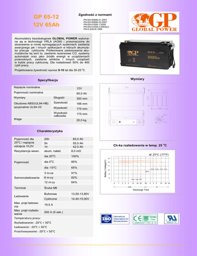 Zgodność z normami GP 65-12 12V 65Ah PN-EN 60896-21:2007 PN-EN 60896-22:2007 PN-EN 61056-1:2008 PN-EN 61056-2:2003(U) PN-E-83016:1999 Akumulatory bezobsługowe GLOBAL POWER wykonane są w technologii VRLA (AGM) i przeznaczone do stosowania w mniej wymagających systemach zasilania awaryjnego jak i innych aplikacjach w których akumulator pracuje cyklicznie. Preferowane zastosowania akumulatorów tej serii to: zasilanie rezerwowe CO, systemy automatyki oraz jako źródło energii w urządzeniach przenośnych, zasilanie silników i innych urządzeń w trybie pracy cyklicznej. Dla rozładowań 50% do 400 cykli pracy. Projektowana żywotność wynosi 8-10 lat dla 20-25 oC Wymiary Specyfikacja Napięcie nominalne 12V Pojemność nominalna 65,0 Ah Wymiary Długość 350 mm Obudowa ABS/(UL94-HB) opcjonalnie UL94-V0 Szerokość 166 mm Wysokość 175 mm Wysokość całkowita 175 mm Waga 20,0 kg Charakterystyka Pojemność dla 25oC i napięcia odcięcia 10,0V 20h 65,0 Ah 5h 1h 55,0 Ah 42,0 Ah Rezystancja wewn. akum. naład. o dla 20 C Pojemność Samorozładowanie Terminal Ładowanie Max. prąd ładowania Max. prąd rozładowania o 8,0 mΩ 100% dla 0 C 85% dla -15oC 65% 3 m-ce 91% 6 m-cy 82% 12 m-cy 64% Śruba M6 Buforowe 13,50-13,80V Cykliczne 14,40-15,00V 19,5 A 500 A (5 sek.) Temperatury pracy: Rozładowanie: -20°C ÷ 50°C Ładowanie: -10°C ÷ 50°C Przechowywanie: -20°C ÷ 50°C Ch-ka rozładowania w temp. 25 oC Żywotność akumulatora dla pracy cyklicznej Żywotność akumulatora dla pracy buforowej Stałoprądowa charakterystyka rozładowania (A, 25°C) F.V/Time 9.60V 9.90V 10.20V 10.50V 10.80V 5min 210 204 192 168 150 10min 168 162 150 126 108 15min 120 114 108 102 96.0 30min 69.0 67.8 66.0 62.4 54.0 45min 49.2 48.6 48.0 47.4 46.8 1h 39.0 38.7 38.4 37.8 37.2 2h 21.0 20.8 20.7 20.4 19.8 3h 15.2 15.1 15.0 14.8 14.4 5h 10.3 10.3 10.2 10.2 10.1 8h 6.78 6.78 6.72 6.66 6.66 10h 5.64 5.64 5.58 5.58 5.46 20h 3.06 3.06 3.00 3.00 2.94 8h 78.6 78.6 78.6 77.4 77.4 10h 66.0 65.4 65.4 64.8 63.6 20h 36.0 36.0 35.6 34.9 34.2 Stałomocowa charakterystyka rozładowania (Watt, 25°C) F.V/Time 9.60V 9.90V 10.20V 10.50V 10.80V 5min 2292 2202 2094 1836 1638 10min 1842 1764 1662 1398 1260 15min 1326 1254 1194 1128 1062 30min 804 774 738 696 600 45min 562 554 547 540 533 1h 450 443 443 436 428 2h 242 241 238 235 228 3h 176 175 174 172 167 5h 119 119 118 118 117