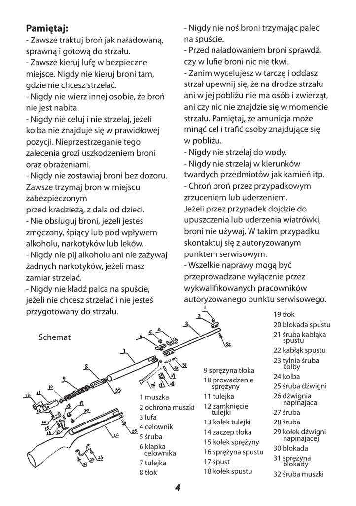 Pamiętaj: - Nigdy nie noś broni trzymając palec na spuście. - Przed naładowaniem broni sprawdź, czy w lufie broni nic nie tkwi. - Zanim wycelujesz w tarczę i oddasz strzał upewnij się, że na drodze strzału ani w jej pobliżu nie ma osób i zwierząt, ani czy nic nie znajdzie się w momencie strzału. Pamiętaj, że amunicja może minąć cel i trafić osoby znajdujące się w pobliżu. - Nigdy nie strzelaj do wody. - Nigdy nie strzelaj w kierunków twardych przedmiotów jak kamień itp. - Chroń broń przez przypadkowym zrzuceniem lub uderzeniem. Jeżeli przez przypadek dojdzie do upuszczenia lub uderzenia wiatrówki, broni nie używaj. W takim przypadku skontaktuj się z autoryzowanym punktem serwisowym. - Wszelkie naprawy mogą być przeprowadzane wyłącznie przez wykwalifikowanych pracowników autoryzowanego punktu serwisowego. - Zawsze traktuj broń jak naładowaną, sprawną i gotową do strzału. - Zawsze kieruj lufę w bezpieczne miejsce. Nigdy nie kieruj broni tam, gdzie nie chcesz strzelać. - Nigdy nie wierz innej osobie, że broń nie jest nabita. - Nigdy nie celuj i nie strzelaj, jeżeli kolba nie znajduje się w prawidłowej pozycji. Nieprzestrzeganie tego zalecenia grozi uszkodzeniem broni oraz obrażeniami. - Nigdy nie zostawiaj broni bez dozoru. Zawsze trzymaj bron w miejscu zabezpieczonym przed kradzieżą, z dala od dzieci. - Nie obsługuj broni, jeżeli jesteś zmęczony, śpiący lub pod wpływem alkoholu, narkotyków lub leków. - Nigdy nie pij alkoholu ani nie zażywaj żadnych narkotyków, jeżeli masz zamiar strzelać. - Nigdy nie kładź palca na spuście, jeżeli nie chcesz strzelać i nie jesteś przygotowany do strzału. Schemat 1 muszka 2 ochrona muszki 3 lufa 4 celownik 5 śruba 6 klapka celownika 7 tulejka 8 tłok 4 9 sprężyna tłoka 10 prowadzenie sprężyny 11 tulejka 12 zamknięcie tulejki 13 kołek tulejki 14 zaczep tłoka 15 kołek sprężyny 16 sprężyna spustu 17 spust 18 kołek spustu 19 tłok 20 blokada spustu 21 śruba kabłąka spustu 22 kabłąk spustu 23 tylnia śruba kolby 24 kolba 25 śruba dźwigni 26 dźwignia napinająca 27 śruba 28 śruba 29 kołek dźwigni napinającej 30 blokada 31 sprężyna blokady 32 śruba muszki WIATRÓWKA PROFI MODEL B10-1 INSTRUKCJA OBSŁUGI Dziękujemy za wybór i zakup naszego produktu. Przed użytkowaniem wiatrówki należy zapoznać się z niniejszą instrukcją obsługi, ponieważ zawiera ona istotne informacje dotyczące bezpieczeństwa, obsługi i konserwacji wiatrówki. Należy przeczytać i przestrzegać wszystkich zawartych w instrukcji wskazówek. Przekazując wiatrówkę innej osobie, należy przekazać także instrukcję obsługi. Trzymając broń nie wolno a) nosić broni na widoku w miejscach, gdzie każdy ma dostęp, b) nosić broni lub w jakikolwiek sposób manipulować przy broni, będąc pod wpływem alkoholu, środków uzależniających, leków lub będąc chorym. - Zawsze przestrzegaj miejscowych kodeksów i przepisów Specyfikacja techniczna Model: B10-1 Kaliber: 4,5m Długość: 1030mm Długość lufy: 435mm Prędkość początkowa: 480fps Waga: 2,7kg Dystrybutor: TV PRODUCTS Sp. z o. o. Importer do UE: TV PRODUCTS CZ s. r. o. Kraj pochodzenia: Chiny SPRZEDAŻ OSOBOM PONIŻEJ 18 ROKU ŻYCIA JEST ZAKAZANA! Niniejszą broń mogą zakupić oraz trzymać lub nosić wyłącznie osoby, które ukończyły 18 rok życia, zdolne do czynności prawnych. Energia kinetyczna pocisku jest mniejsza niż 16 J. Zasady bezpieczeństwa: - Strzelanie z wiatrówki jest zakazane w miejscach, gdzie mogłoby dojść do zagrożenia życia lub zdrowia ludzi lub mogłoby dojść do uszkodzenia majątku, o ile nie chodzi o użycie broni w celu ochrony życia, zdrowia lub majątku. - Broń i amunicję należy zabezpieczyć przed osobami niepowołanymi, zgubieniem lub kradzieżą. Opis - wiatrówka łamana - wiatrówka jest przeznaczona do strzelania sportowego i rekreacyjnego - wiatrówka B10 to broń kompaktowa i elegancka, charakteryzująca się dokładnością strzału - wiatrówka została wyprodukowana z materiałów wysokiej jakości 1 Ładowanie śrutu Używaj wyłącznie śrutu kalibrowanego Diabolo Standard o średnicy 4,5 mm. Używaj wyłącznie dobrej jakości, suchych i nieuszkodzonych nabojów. 4. Wciśnij blokadę zabezpieczenia. Broń jest przygotowana do oddania strzału. Następnie trzymając za przednią 1. Chwyć kolbę do lewej ręki, kciukiem naciśnij blokadę zabezpieczenia kolby. Nie kładź palców na spuście. Drugą ręką chwyć lufę jak najbliżej muszki. Lufę naciągaj do dołu aż do momentu, kiedy wyraźnie wyczuje się jej zatrzaśnięcie w dolnym położeniu. Lufa zostanie w dolnym położeniu. blokada część lufy ruchem w górę złożyć ją, aż do momentu jej zatrzaśnięcia Upewnij się, czy na drodze strzału ani w jej pobliżu nie ma osób i zwierząt, ani czy nic nie znajdzie się tam w momencie strzału. 1. Podczas strzelania trzymaj lufę w prawej ręce, palec wskazujący na spuście. Lewa ręka na kolbie. Następnie umieść kolbę pod prawą pachą, dzięki czemu broń jest dobrze unieruchomiona. 2. Przyłóż lufę do policzka (prawego) i prawym okiem patrz przez muszkę na cel. Teraz możesz nacisnąć na spust i wystrzelić 2. Lewą ręką włóż śrut do lufy. UWAGA: 3. Następnie trzymając za przednią część lufy ruchem w górę złóż ją, aż do momentu jej zatrzaśnięcia. Nie wywieraj nacisku na sprężynę zbyt długo. Nigdy nie strzelaj z broni na sucho (bez załadowanego śrutu). 2 Konserwacja broni Przed użyciem zetrzyj środek konserwujący, którym pokryta jest broń. Po powrocie z każdego strzelania, przed odłożeniem broni na miejsce należy ponownie natrzeć delikatnie wszystkie elementy zewnętrzne specjalnym olejem do konserwacji lub olejem w sprayu. Nadmiar oleju wytrzyj ściereczką. Regularnie stosuj kilka kropel smaru rozprowadzając go na elementach ruchomych dolnego naciągu oraz na tłoku. Regularnie sprawdzaj trwało