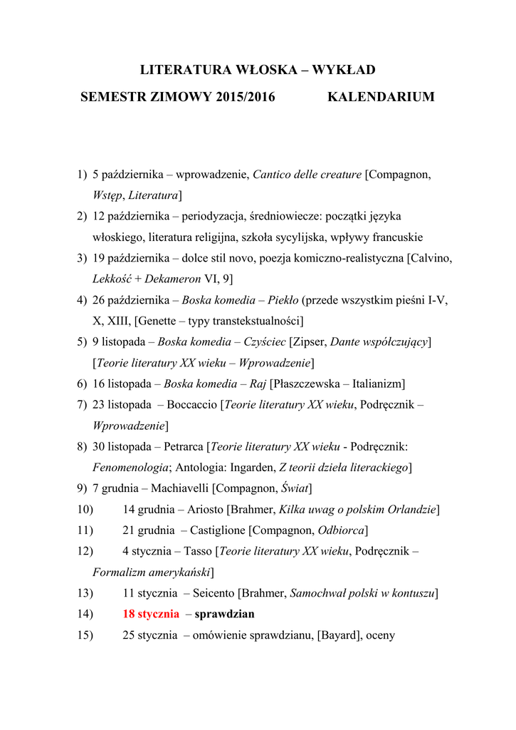 LITERATURA WŁOSKA – WYKŁAD SEMESTR ZIMOWY 2015/2016 KALENDARIUM 1) 5 października – wprowadzenie, Cantico delle creature [Compagnon, Wstęp, Literatura] 2) 12 października – periodyzacja, średniowiecze: początki języka włoskiego, literatura religijna, szkoła sycylijska, wpływy francuskie 3) 19 października – dolce stil novo, poezja komiczno-realistyczna [Calvino, Lekkość + Dekameron VI, 9] 4) 26 października – Boska komedia – Piekło (przede wszystkim pieśni I-V, X, XIII, [Genette – typy transtekstualności] 5) 9 listopada – Boska komedia – Czyściec [Zipser, Dante współczujący] [Teorie literatury XX wieku – Wprowadzenie] 6) 16 listopada – Boska komedia – Raj [Płaszczewska – Italianizm] 7) 23 listopada – Boccaccio [Teorie literatury XX wieku, Podręcznik – Wprowadzenie] 8) 30 listopada – Petrarca [Teorie literatury XX wieku - Podręcznik: Fenomenologia; Antologia: Ingarden, Z teorii dzieła literackiego] 9) 7 grudnia – Machiavelli [Compagnon, Świat] 10) 14 grudnia – Ariosto [Brahmer, Kilka uwag o polskim Orlandzie] 11) 21 grudnia – Castiglione [Compagnon, Odbiorca] 12) 4 stycznia – Tasso [Teorie literatury XX wieku, Podręcznik – Formalizm amerykański] 13) 11 stycznia – Seicento [Brahmer, Samochwał polski w kontuszu] 14) 18 stycznia – sprawdzian 15) 25 stycznia – omówienie sprawdzianu, [Bayard], oceny