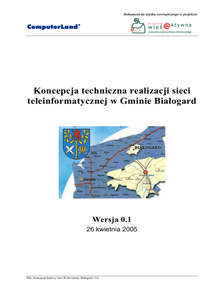 Dokument do użytku wewnętrznego w projekcie Koncepcja techniczna realizacji sieci teleinformatycznej w Gminie Białogard Wersja 0.1 26 kwietnia 2005 Plik: Koncepcja budowy sieci IP dla Gminy Białogard v1.0 Dokument do użytku wewnętrznego w projekcie Koncepcja techniczna realizacji sieci teleinformatycznej w Gminie Białogard Metryka dokumentu: Autor: Wojciech Gliniecki, +48 504 142 791, [email protected] Jerzy Łuczak, +48-504-142-490, [email protected] Tytuł: Koncepcja techniczna realizacji sieci teleinformatycznej w Gminie Białogard Komentarz: Wersja 1.0 Liczba stron: 22 Data utworzenia: 2004-11-22 Data ostatniej wersji: 2005-04-26. Historia zmian: Data Autor Wersja Opis i odwołanie do poprzedniej wersji 22.11.2004 Wojciech Gliniecki 0.1 Utworzenie dokumentu 29.11.2004 Wojciech Gliniecki 1.0 Dokument gotowy 29.11.2004 Jerzy Łuczak 1.0 Drobne poprawki Przeglądy: Data Imię i Nazwisko Stanowisko Odwołanie do dokumentu z uwagami Stanowisko/Firma Odwołanie do dokumentu z uwagami Zatwierdzenie: Data Wersja 0.11.0 Imię, Nazwisko, Podpis Data: 2005-04-26 Strona: 2 z 34 Dokument do użytku wewnętrznego w projekcie Koncepcja techniczna realizacji sieci teleinformatycznej w Gminie Białogard Dystrybucja: Data Wersja 0.11.0 Imię i Nazwisko Stanowisko Data: 2005-04-26 Miejsce/Firma Strona: 3 z 34 Dokument do użytku wewnętrznego w projekcie Koncepcja techniczna realizacji sieci teleinformatycznej w Gminie Białogard Spis treści 1 WSTĘP........................................................................................................................................................... 6 1.1 1.2 2 PODSTAWA OPRACOWANIA ...................................................................................................................... 6 AUDYT, WIZJA LOKALNA ......................................................................................................................... 6 KRÓTKA CHARAKTERYSTYKA SIECI................................................................................................ 8 2.1 PODSYSTEM DOSTĘPU DO SIECI INTERNET ............................................................................................... 8 2.2 PODSYSTEM DOSTĘPU RADIOWEGO .......................................................................................................... 9 2.3 KRÓTKA CHARAKTERYSTYKA POŁĄCZEŃ RADIOWYCH ............................................................................ 9 2.3.1 Podsystem połączeń szkieletowych.................................................................................................. 9 2.3.2 Podsystem dostępu abonenckiego ................................................................................................. 10 2.3.3 Stacje abonenckie zlokalizowane w obiektach gminnych.............................................................. 10 2.3.4 Abonenci indywidualni.................................................................................................................. 11 2.3.5 Zasilanie urządzeń radiowych Cisco Aironet 1310....................................................................... 11 2.4 URZĄDZENIA SIECI LAN........................................................................................................................ 12 2.5 PODSYSTEM AUTENTYKACJI .................................................................................................................. 13 2.6 USŁUGA DHCP I DNS ........................................................................................................................... 13 3 ZAŁOŻENIA PRZYJĘTE DO WYCENY............................................................................................... 14 4 KRÓTKA CHARAKTERYSTYKA STACJI .......................................................................................... 15 4.1 4.2 4.3 4.4 4.5 4.6 4.7 4.8 4.9 4.10 STACJA BAZOWA: URZĄD GMINY W BIAŁOGARDZIE ............................................................................. 15 STACJA BAZOWA: NIECZYNNY KOMIN EC W BIAŁOGARDZIE................................................................. 15 STACJA BAZOWA: PLANOWANY MASZT W DĘBCZYNIE .......................................................................... 15 STACJA BAZOWA: SZKOŁA PODSTAWOWA ROGOWO ............................................................................. 16 STACJA BAZOWA: SZKOŁA PODSTAWOWA W KOŚCIERNICY .................................................................. 16 STACJA BAZOWA: POMIANOWO ............................................................................................................. 17 STACJA ABONENCKA: REMIZA OSP W ROGOWIE ................................................................................... 17 STACJA ABONENCKA: REMIZA OSP W KOŚCIERNICY............................................................................. 17 STACJA ABONENCKA: ŚWIETLICA W KOŚCIERNICY ................................................................................ 17 STACJA ABONENCKA: ŚWIETLICA I OSP W POMIANOWIE....................................................................... 18 5 TABELE Z WYCENĄ KOSZTÓW BUDOWY STACJI........................................................................ 19 6 TABELE Z OPISEM STACJI ................................................................................................................... 20 7 RYSUNKI .................................................................................................................................................... 22 7.1 7.2 7.3 7.4 7.5 7.6 STRUKTURA SIECI .................................................................................................................................. 22 MODEL STACJI BAZOWEJ - SBB1 ........................................................................................................... 22 MODEL STACJI BAZOWEJ – SBB2...........................................................................................................