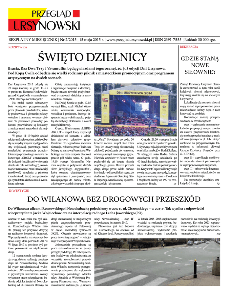 BEZPŁATNY MIESIĘCZNIK | Nr 2/2015 | 15 maja 2015 r. | www.przegladursynowski.pl | ISSN 2391-7555 | Nakład: 30 000 egz. ROZRYWKA ŚWIĘTO DZIELNICY Bracia, Raz Dwa Trzy i Vavamuffin będą gwiazdami tegorocznej, 20. już edycji Dni Ursynowa. Pod Kopą Cwila odbędzie się wielki rodzinny piknik z miasteczkiem promocyjnym oraz programem artystycznym na dwóch scenach. Dni Ursynowa 2015 odbędą się 23 maja (sobota) w godz. 11‒23 w parku im. Romana Kozłowskiego pod Kopą Cwila w ramach trasy „Złote Przeboje na Wakacjach”. Na małej scenie zobaczymy blok występów przygotowanych przez placówki przedszkolne, szkoły podstawowe i gimnazja: pokazy wokalne i taneczne, występy chórów. W przerwach pomiędzy pokazami przewidziane są konkursy z atrakcyjnymi nagrodami dla najmłodszych. W godz. 11‒19 będzie działać także strefa rekreacyjna, gdzie odbędą się między innymi występ orkiestry wojskowej, prezentacja broni strzeleckiej, prezentacja przeciwlotniczego przenośnego zestawu rakietowego „GROM” z trenażerem do ćwiczeń (możliwość wykonania strzału do celu wirtualnego), rozwinięcie trenażerów broni strzeleckiej (możliwość strzelania z pistoletu i karabinka do tarcz) oraz prezentacja symulatora dachowania i symulatora zderzeń. Ofertę zaprezentują instytucje i organizacje związane z dzielnicą, będzie można również podyskutować o sprawach dzielnicy z ursynowskimi radnymi. Na Dużej Scenie o godz. 17.15 wystąpi Hisu, czyli Michał Wrzosiński, warszawski kompozytor, wokalista i producent, którego inspiracje krążą wokół szeroko pojętej alternatywy, elektroniki, a nawet muzyki filmowej. O godz. 18 usłyszymy oldBREAKOUT – zespół, który rozpoczął działalność od koncertu z udziałem dawnych członków grupy Breakout. To legendarna rockowa formacja, założona przez Tadeusza Nalepę za namową Franciszka Walickiego na bazie zespołu Blackout prawie pół wieku temu. O godz. 19.10 wystąpi Vavamuffin. Nazwa zespołu to połączenie dwóch słów: jamajskiego „raggamuffin”, które oznacza charakterystyczny styl śpiewania i „nawijania”, oraz nawiązującego do nazwy miasta, z którego wywodzi się grupa, skró- tu „Vava”. Kwadrans po godz. 20 koncert zacznie zespół Raz Dwa Trzy. Ich utwory mają niesamowitą zdolność pobudzania do rozmowy, otwierają umysł i rozwiązują język. Niewiele zespołów w Polsce może pochwalić się tak bogatą historią wspólnego grania. Razem przeszli długą drogę przez wiele nurtów i stylistyk ‒ od jarocińskiej sceny, do studia im. Agnieszki Osieckiej. Stale imponują wrażliwością, spostrzegawczością i dystansem. O godz. 21.20 wystąpią Bracia oraz gościnnie Krzysztof Cugowski. Usłyszymy największe hity zespołu oraz kilka przebojów Budki Suflera. W ubiegłym roku Budka Suflera zakończyła swoją działalność po 40 latach istnienia, zamykając ważny rozdział w historii polskiego rocka. Krzysztof Cugowski kontynuuje swoją muzyczną przygodę, koncertując ze swoimi synami ‒ Piotrkiem i Wojtkiem, którzy od 1997 r. twocs rzą zespół Bracia. REKREACJA GDZIE STANĄ NOWE SIŁOWNIE? Zarząd Dzielnicy Ursynów planuje zamontować w tym roku sześć kolejnych siłowni plenerowych, trzy mają znaleźć się na Zielonym Ursynowie. Lokalizacje dla nowych siłowni mają zostać zaproponowane przez mieszkańców, którzy będą z nich korzystać na co dzień. Konsultacje zostaną przeprowadzone w trzech etapach: etap I – zgłaszanie przez mieszkańców propozycji miejsc montażu siłowni (proponowane lokalizacje można przesłać na adres e-mail: [email protected] lub złożyć osobiście na przygotowanym formularzu w informacji głównej Urzędu Dzielnicy Ursynów przy al. KEN 61), etap II – weryfikacja możliwości montażu siłowni plenerowych w zaproponowanych miejscach, etap III – głosowanie internetowe oraz osobiste mieszkańców na konkretne lokalizacje. Na propozycje urzędnicy czekają do 31 maja. kp INWESTYCJE DO WILANOWA BEZ DROGOWYCH PRZESZKÓD Do Wilanowa ulicami Rosnowskiego i Nowokabacką pojedziemy w 2017 r., ul. Ciszewskiego – w 2023 r. Tak wynika z odpowiedzi wiceprezydenta Jacka Wojciechowicza na interpelację radnego Lecha Jaworskiego (PO). Jeszcze w tym roku ma być zaktualizowany projekt budowlany ul. Rosnowskiego. Władze miasta planują też pozyskać decyzję na realizację inwestycji drogowej. W przyszłym roku ma się zacząć budowa ulicy, która potrwa do 2017 r. W lipcu 2017 r. powinno być gotowe pozwolenie na użytkowanie drogi. 12 marca została wydana decyzja o zgodzie na realizację drugiego etapu ul. Nowokabackiej. Nadano jej rygor natychmiastowej wykonalności. „W ramach porozumienia z prywatnym inwestorem zostały wykonane prace polegające na budowie odcinka jezdni ul. Nowokabackiej od ul. Łukasza Drewny do drogi zaznaczonej w miejscowym planie zagospodarowania przestrzennego rejonu ul. Pałacowej w części zachodniej symbolem 3KUL. Obecnie prowadzone są prace inwentaryzacyjne” ‒ relacjonuje wiceprezydent Wojciechowicz. Jednocześnie prowadzone są prace odszkodowawcze za grunty przejęte pod drogę. Po zabezpieczeniu środków na odszkodowania za wszystkie nieruchomości przewidziane pod ul. Nowokabacką dzielnica Wilanów rozpocznie postępowanie przetargowe dla wyłonienia wykonawcy pozostałego odcinka ulicy. Zgodnie z Wieloletnią Prognozą Finansową m.st. Warszawy zakończenie zadania pn. „Budowa ulicy Nowokabackiej – etap II” przewidziane jest na rok 2017. Planowana jest też budowa ul. Ciszewskiego na odcinku od ul. Kiedacz do al. Rzeczypospolitej. W latach 2015‒2018 zaplanowano wydatki na realizację projektu budowlanego, uzyskanie tzw. decyzji środowiskowej, wykonanie projektu wykonawczego i uzyskanie zezwolenia na realizację inwestycji drogowej. Do roku 2023 zaplanowano wydatki na wykup nieruchomości i realizację robót budowlano-montażowych.. mc 2 Przegląd Ursynowski nr 2, 15 maja 2015 r. FE