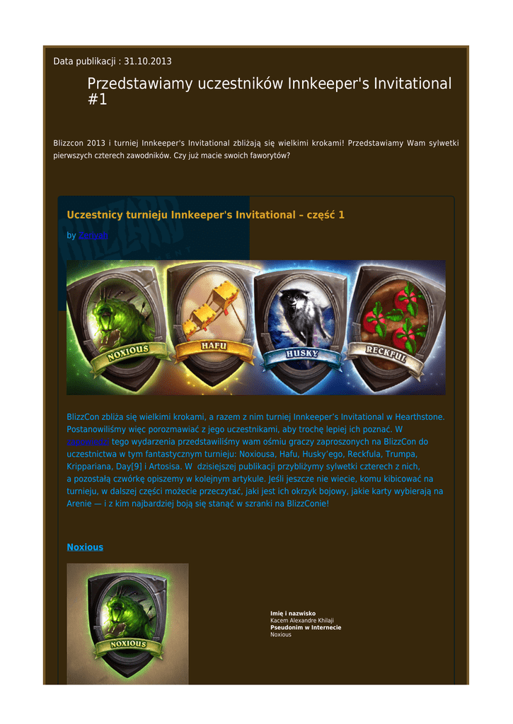 Data publikacji : 31.10.2013 Przedstawiamy uczestników Innkeeper's Invitational #1 Blizzcon 2013 i turniej Innkeeper's Invitational zbliżają się wielkimi krokami! Przedstawiamy Wam sylwetki pierwszych czterech zawodników. Czy już macie swoich faworytów? Uczestnicy turnieju Innkeeper's Invitational – część 1 by Zeriyah BlizzCon zbliża się wielkimi krokami, a razem z nim turniej Innkeeper’s Invitational w Hearthstone. Postanowiliśmy więc porozmawiać z jego uczestnikami, aby trochę lepiej ich poznać. W zapowiedzi tego wydarzenia przedstawiliśmy wam ośmiu graczy zaproszonych na BlizzCon do uczestnictwa w tym fantastycznym turnieju: Noxiousa, Hafu, Husky’ego, Reckfula, Trumpa, Krippariana, Day[9] i Artosisa. W dzisiejszej publikacji przybliżymy sylwetki czterech z nich, a pozostałą czwórkę opiszemy w kolejnym artykule. Jeśli jeszcze nie wiecie, komu kibicować na turnieju, w dalszej części możecie przeczytać, jaki jest ich okrzyk bojowy, jakie karty wybierają na Arenie — i z kim najbardziej boją się stanąć w szranki na BlizzConie! Noxious Imię i nazwisko Kacem Alexandre Khilaji Pseudonim w Internecie Noxious Co spowodowało, że grasz w Hearthstone? Od najmłodszych lat byłem uzależniony od Magic: the Gathering, a World of Warcraft to pierwsze MMO, w które zacząłem grać naprawdę „hardkorowo”. Miałem za mało pieniędzy i znajomych graczy w okolicy, żeby na poważnie wciągnąć się w starą karciankę WoW, więc kiedy pojawiła się zapowiedźHearthstone, oszalałem z radości. Spełniły się moje marzenia: gra karciana na komputer, której akcja dzieje się w świecie Warcrafta. Doświadczyłem nerdowskiego objawienia. Jaki jest twój okrzyk bojowy? „That's the play!” (Tak się gra!) A po wygranej: „Jay Jay!” Podaj 5 kart, które według ciebie są niezbędne na Arenie. Zwykle sięgam po karty, które są przydatne bez względu na to, czy dotrwają do następnej rundy, więc gdybym miał wymienić naprawdę niezbędne zwykłe karty, to pewnie byłyby to: Krasnolud z Czarnorytnych, Przewodniczka kultu i Golem zbożowy. Dzięki pierwszej zyskuje się możliwość natychmiastowej zamiany „na lepsze” (mniejszego stronnika na większego i droższego), drugą można zagrać przed decyzją o wymianie całego układu, a trzecia to prawdziwy koszmar dla przeciwnika. Wiele rzadkich kart cenię wysoko, ale dwie lubię najbardziej: Lazurowego smokowca i Dowódcę Argentu. Smokowiec ma statystyki 4/4, przez co jest wytrzymały, ale to jego moc zaklęć i specjalna zdolność dobierania karty sprawiają, że jest po prostu fantastyczny. Natomiast Dowódca Argentu to taki królik z kapelusza, który sam może zmienić sytuację na stole. Sprawdza się nawet lepiej, jeśli przeciwnik nie wymusi na tobie użycia boskiej tarczy od razu (np. żeby zniszczyć Totem ognistego języka), bo żeby się go pozbyć, będzie musiał użyć przynajmniej jednej karty, a czasem nawet 2 lub 3 — i to już PO TYM, jak użyjesz Dowódcy Argentu! Jak by wyglądała karta stworzona na motywach twojej osoby? To by był legendarny gnom-alchemik, który losowo morduje innych stronników, rzucając w nich na początku lub końcu twojej tury fiolki z trucizną. :D Których graczy w społeczności Hearthstone najbardziej szanujesz lub się obawiasz? Z kim najbardziej boisz się stanąć w szranki? Choć niektórzy uważają mnie za naprawdę niezłego zawodnika, to dobrze wiem, że w społeczności ManaGrind jest masa lepszych ode mnie, ale dużo mniej znanych. Do najlepszych graczy zaliczyłbym m.in. spaJJ, Moona, Byke’a czy jotto. I może jeszcze Doroxx, choć szmat czasu go nie widziałem! Nie marzę też o rywalizacji z kimś takim jak Trump czy Kripparrian... Co najbardziej podoba ci się w Hearthstone? Ogólnie rzecz biorąc, wprost uwielbiam w tej grze to, że prawie „namacalnie” da się poczuć karty. Nie pamiętam, żeby w jakiejkolwiek innej grze tak dobrze oddano tę „fizyczną” stronę karcianki. A żeby było jeszcze bardziej czadowo, teraz naprawdę mogę sterować Smoczymi Aspektami! Możecie wyrazić poparcie dla Noxiousa na Twitterze poprzez hashtag #teamnoxious! Hafu Imię i nazwisko Rumay Wang Pseudonim w Internecie Hafu Co spowodowało, że grasz w Hearthstone? Wcześniej nie bawiłam się w komputerowe karcianki, ale jestem wielką fanką gier Blizzarda, więc postanowiłam spróbować. I potwornie mnie wciągnęło. :) Jaki jest twój okrzyk bojowy? „Hafu's the name, top-decking's my game”. (Hafu to moje imię, a wykładanka to mój styl). Podaj 5 kart, które według ciebie są niezbędne na Arenie. Żrący bagienny szlam — broń to prawdziwa potęga w Hearthstone! Nie ma to jak zalać szlamem Rzezimiota :) Ysera — moja ulubiona legendarna karta! Szaleństwo cieni — choć wciąż się uczę, jak się gra kapłanem, to czuję, że ta karta daje wiele możliwości ciekawych zagrywek. Magini Kirin Toru — grywam głównie jako mag i uważam, że ta karta jest niesamowicie potężna nawet bez sekretu. Jeśli uda się ją połączyć z sekretem, jest po prostu przerażająca. Szalony bombiarz — wprawdzie mam wobec tej karty mieszane uczucia, ale cały czas ją wybieram, powtarzając przy tym: „Proszę, bombiarzu, zlituj się... wierzę w ciebie!”. Jak by wyglądała karta stworzona na motywach twojej osoby? Hafu — karta 1/1 za 8 Many z okrzykiem bojowym: wybierz dowolną kartę z talii przeciwnika i użyj jej. >: ) Których graczy w społeczności Hearthstone najbardziej szanujesz lub się obawiasz? Z kim najbardziej boisz się stanąć w szranki? Bardzo szanuję wszystkich, którzy grają w tym turnieju. Szczególnie boję się Kripparriana i Trumpa, bo wiem, że mają ogromne doświadczenie w karciankach i od kilku miesięcy bez przerwy grają w Hearthstone. Wprawdzie to moja pierwsza komputerowa karcianka, ale uważam, że mnie też nie powinno się lekceważyć! Wykładanka (ang. „top-decking”) naprawdę nie