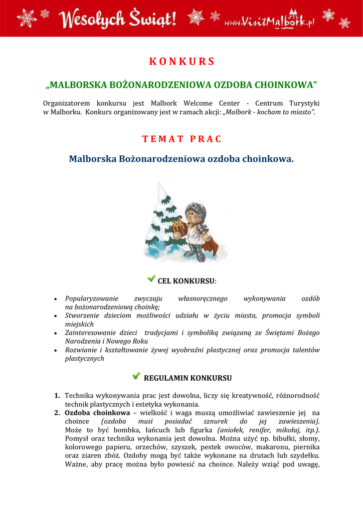 KONKURS „MALBORSKA BOŻONARODZENIOWA OZDOBA CHOINKOWA” Organizatorem konkursu jest Malbork Welcome Center - Centrum Turystyki w Malborku. Konkurs organizowany jest w ramach akcji: „Malbork - kocham to miasto”. TEMAT PRAC Malborska Bożonarodzeniowa ozdoba choinkowa. CEL KONKURSU: • • • • Popularyzowanie zwyczaju własnoręcznego wykonywania ozdób na bożonarodzeniową choinkę; Stworzenie dzieciom możliwości udziału w życiu miasta, promocja symboli miejskich Zainteresowanie dzieci tradycjami i symboliką związaną ze Świętami Bożego Narodzenia i Nowego Roku Rozwianie i kształtowanie żywej wyobraźni plastycznej oraz promocja talentów plastycznych REGULAMIN KONKURSU 1. Technika wykonywania prac jest dowolna, liczy się kreatywność, różnorodność technik plastycznych i estetyka wykonania. 2. Ozdoba choinkowa – wielkość i waga muszą umożliwiać zawieszenie jej na choince (ozdoba musi posiadać sznurek do jej zawieszenia). Może to być bombka, łańcuch lub figurka (aniołek, renifer, mikołaj, itp.). Pomysł oraz technika wykonania jest dowolna. Można użyć np. bibułki, słomy, kolorowego papieru, orzechów, szyszek, pestek owoców, makaronu, piernika oraz ziaren zbóż. Ozdoby mogą być także wykonane na drutach lub szydełku. Ważne, aby pracę można było powiesić na choince. Należy wziąć pod uwagę, 3. 4. 5. 6. 7. 8. 9. że ozdoba nie może być zbyt ciężka i że powinna być odporna na warunki atmosferyczne. Prace wykonane z elementów gotowych (np. figurki lub bombki kupione w sklepie) będą dyskwalifikowane. Ozdoba choinkowa powinna mieć przynajmniej jeden element związany z Malborkiem lub w całości nawiązywać do Malborka (kolory flagi miejskiej, użycie logo Malborka, maskotki miejskiej – Marianka, postaci związanych z miastem, zamkiem, itp.) Udział w konkursie może wziąć każdy - przedszkolak, uczeń lub osoba dorosła, która do dnia 2 grudnia 2013r. złoży własnoręcznie wykonaną pracę konkursową w siedzibie Malbork Welcome Center - Centrum Turystyki w Malborku, ul. T. Kościuszki 54. Termin nadsyłania lub dostarczenia prac: 2 grudnia 2013r. do godz. 16.00 Konkurs wyłoni zwycięzców w trzech kategoriach wiekowych: • dzieci w wieku przedszkolnym, • dzieci i młodzież w wieku szkolnym • młodzież w wieku ponadgimnazjalnym i dorośli. Każda praca musi mieć przymocowaną metryczkę zawierającą: imię i nazwisko, wiek autora, adres zamieszkania nr telefonu Każdy uczestnik może nadesłać lub przynieść na konkurs maksymalnie dwie ozdoby choinkowe. Prace niezgodne z regulaminem, nadesłane po terminie, zniszczone w wyniku niewłaściwego opakowania - nie będą oceniane. NAGRODY 10. Spośród prac zgłoszonych do konkursu, jury powołane przez Organizatora wyłoni zwycięzców w każdej kategorii wiekowej. 11. Jury powołane przez organizatorów przyzna nagrody, które wręczy Mikołaj w dniu 6 grudnia na Placu Miejskim w towarzystwie Burmistrza Miasta Malborka i przedstawiciela Malbork Welcome Center. Najpiękniejsze ozdoby zawisną na Choince Miejskiej oraz na budynku Malbork Welcome Center przy ulicy Kościuszki 54. 12. Ogłoszenie zwycięzców i wręczenie nagród odbędzie się w dniu 6 grudnia 2013r. podczas Mikołajek na Placu Miejskim (dokładna godzina zapisana będzie na plakatach dotyczących Mikołajek oraz na stronach internetowych miasta tuż przed imprezą). 13. Wyniki konkursu będą dostępne na stronie internetowej www.82-200.pl oraz na tablicy informacyjnej przy budynku Malbork Welcome Center. UWAGI 14. Każda zgłoszona praca staje się własnością organizatora konkursu. 15. Prace konkursowe oceni powołana przez Organizatora komisja. 16. Kryteria oceny: • samodzielność wykonania • nawiązanie do tradycji Świąt Bożego Narodzenia i Nowego Roku • staranność wykonania • ogólne wrażenie artystyczne Malbork Welcome Center - Centrum Turystyki w Malborku ul. Kościuszki 54, 82-200 Malbork tel. +48 55 647-14-30 - sekretariat fax +48 55 647-14-31 e-mail: [email protected] Centrum Informacji Turystycznej tel. +48 55 647-47-47 e-mail: [email protected]