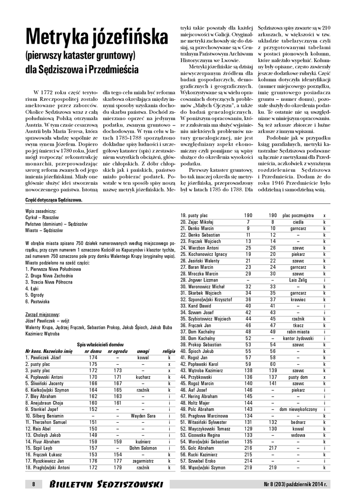 Metryka józefińska (pierwszy kataster gruntowy) dla Sędziszowa i Przedmieścia W 1772 roku czêœæ terytorium Rzeczpospolitej zosta³o anektowane przez zaborców. Okolice Sêdziszowa wraz z ca³¹ po³udniow¹ Polsk¹ otrzyma³a Austria. W tym czasie cesarzow¹ Austrii by³a Maria Teresa, która sprawowa³a w³adzê wspólnie ze swym synem Józefem. Dopiero po jej œmierci w 1780 roku, Józef móg³ rozpocz¹æ rekonstrukcjê monarchii, przeprowadzaj¹c szereg reform zwanych od jego imienia józefiñskimi. Mia³y one g³ównie s³u¿yæ idei stworzenia nowoczesnego pañstwa. Istotn¹ dla tego celu mia³a byæ reforma skarbowa okreœlaj¹ca miêdzy innymi sposoby uzyskania dochodu skarbu pañstwa. Dochód zamierzano oprzeæ na jedynym podatku, zwanym gruntowo – dochodowym. W tym celu w latach 1785-1788 sporz¹dzono dok³adne spisy ludnoœci i szczegó³owy kataster (spis) z zestawieniem wszystkich obci¹¿eñ, g³ównie ch³opskich. Z dóbr ch³opskich jak i pañskich, pañstwo mia³o pobieraæ podatek. Powsta³e w ten sposób spisy nosz¹ nazwê metryk józefiñskich. Me- tryki takie powsta³y dla ka¿dej miejscowoœci w Galicji. Oryginalne metryki zachowa³y siê do dzisiaj, s¹ przechowywane s¹ w Centralnym Pañstwowym Archiwum Historycznym we Lwowie. Metryki józefiñskie s¹ dzisiaj niewyczerpanym Ÿród³em dla badañ gospodarczych, demograficznych i geograficznych. Wykorzystywane s¹ w wielu opracowaniach dotycz¹cych problemów „Ma³ych Ojczyzn”, a tak¿e do badañ genealogicznych. W poni¿szym opracowaniu, które z za³o¿enia ma s³u¿yæ wyjaœnieniu niektórych problemów natury genealogicznej, nie jest uwzglêdniany aspekt ekonomiczny czyli pomijane s¹ wpisy s³u¿¹ce do okreœlenia wysokoœci podatku. Pierwszy kataster gruntowy, bo tak inaczej okreœla siê metrykê józefiñsk¹, przeprowadzony by³ w latach 1785 do 1788. Dla Sêdziszowa spisy zawarte s¹ w 210 arkuszach, w wiêkszoœci w tzw. uk³adzie tabelarycznym czyli z przygotowanymi tabelami w postaci pionowych kolumn, które nale¿a³o wype³niæ. Kolumny by³y opisane, czêsto zawiera³y jeszcze dodatkowe rubryki. Czêœæ kolumn dotyczy³a identyfikacji (numer miejscowego porz¹dku, imiê gruntowego posiadacza gruntu – numer domu), pozosta³e s³u¿y³y do okreœlenia podatku. Te ostatnie nie s¹ uwzglêdniane w niniejszym opracowaniu. S¹ te¿ arkusze zbiorcze i luŸne arkusze z innym wpisami. Podobnie jak w przypadku ksi¹g parafialnych, metryki katastralne Sêdziszowa podawane s¹ ³¹cznie z metrykami dla Przedmieœcia, aczkolwiek z wyraŸnym rozdzieleniem Sêdziszowa i Przedmieœcia. Dodam ¿e do roku 1946 Przedmieœcie by³o oddzieln¹ i samodzieln¹ wsi¹. Część dotycząca Sędziszowa. Wpis zasadniczy: Cyrkuł – Rzeszów Państwo (dominium) – Sędziszów Miasto – Sędziszów W obrębie miasta spisano 750 działek numerowanych według miejscowego porządku, przy czym numerem 1 oznaczono Kościół oo Kapucynów i klasztor tychże, zaś numerem 750 oznaczono pole przy domku Walentego Krupy (oryginalny wpis). Miasto podzielono na sześć części: 1. Pierwsza Niwa Południowa 2. Druga Niwa Zachodnia 3. Trzecia Niwa Północna 4. Łąki 5. Ogrody 6. Pastwiska Zarząd miejscowy: Józef Pawliczek – wójt Walenty Krupa, Jędrzej Frączek, Sebastian Prokop, Jakub Śpioch, Jakub Buba Kazimierz Wątroba Nr kons. Nazwisko imię 1. Pawliczek Józef 2. pusty plac 3. pusty plac 4. Popławski Antoni 5. Śliwiński Jacenty 6. Kiełko[w]ski Szymon 7. Bley Abraham 8. Anejubraun Choja 9. Stenkiel Japef 10. Silberg Beniamin 11. Therzehon Samuel 12. Rais Abel 13. Cholayb Jakob 14. Fluur Abraham 15. Szpil Leyb 16. Frączek Łukasz 17. Ryszkiewicz Jan 18. Pragło[w]ski Antoni 8 Spis właścicieli domów nr domu nr ogrodu uwagi 174 – kowal 175 – – 172 173 – 170 171 kucharz 166 167 – 164 165 rzeźnik 162 163 – 160 161 – 152 – – – – Wayden Sara 151 – – 150 – – 149 – – 159 159 kuśnierz 157 – Dohm Salomon 153 154 – 176 177 zegarmistrz 172 179 rzeźnik religia k x x k k k i i i i i i i i i k k k 19. pusty plac 20. Zając Mikołaj 21. Denko Marcin 22. Denko Sebastian 23. Frączek Wojciech 24. Wierzbon Antoni 25. Kochanowicz Ignacy 26. Jasiński Walenty 27. Baran Marcin 28. Mroczka Marcin 29. Jngwer Lizzman 30. Weronowicz Michał 31. Skarbek Wojciech 32. Szpono[w]ski Krzysztof 33. Kand Dawid 34. Szwam Josef 35. Szybistowicz Wojciech 36. Frączek Jan 37. Dom Kachalny 38. Dom Kachalny 39. Prokop Sebastian 40. Śpioch Jakub 41. Rogoż Jan 42. Popławski Karol 43. Wątroba Kazimierz 44. Przybkowski 45. Rogoż Marcin 46. Aaf Josef 47. Hering Abraham 48. Holtz Majer 49. Polc Abraham 50. Pragłowa Marcinowa 51. Witasiński Sylwester 52. Mayczykowski Tomasz 53. Cisowska Regina 54. Woro[w]ski Sebastian 55. Golc Abraham 56. Rucki Kazimierz 57. Szwebel Ersko 58. Wąso[w]ski Szymon 190 7 9 11 13 25 19 21 23 29 – 32 34 36 40 42 44 46 48 52 53 55 57 59 138 136 140 146 145 144 143 134 131 129 133 135 216 215 214 219 190 plac poczmajstra 8 cieśla 10 garncarz 12 – 14 – 26 szewc 20 piekarz 22 szewc 24 garncarz 30 szewc – Lais Zelig 33 – 35 garncarz 37 krawiec 41 – 43 – 45 rzeźnik 47 tkacz 49 rabin miasta – kantor żydowski 54 szewc 56 – 58 – 60 – 139 szewc 137 pusty dom 141 szewc – piekarz – – – – – dom niewykończony – – 132 bednarz 130 kowal – wdowa – – 217 – – – – – 219 – x k k k k k k k k k i k k k i i k k i i k k k k k x k i i i i k k k k k i k i k Nr 8 (203) październik 2014 r. 59. Gawlik Marcin 60. Śpioch Walenty 61. Buba Antoni 62. Denko Walenty 63. Zborzęcki Ignacy 64. Pragłowska Katarzyna 65. Deliński Jan 66. Wierzbon Grzegorz 67. Pragło[w]ska Marianna 68. Piekarski Franciszek 69. Kostrzewina Franciszka 70. Szelbs Jakub 71. Appelbaum Josef 72. Senes Josef 73. Pragłowska Teresa 74. Dereń Ignacy 75. Szpinat Berl 76. Szpiglus Paja 77. Aal Napym 78. Zukier Berl 79. Faygenbaum Leyba 80. Fefer Jakob 81. Rosen Jcek 82. Witn