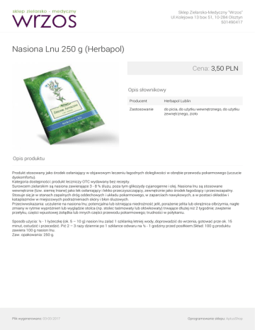 Sklep Zielarsko-Medyczny "Wrzos" Ul.Kolejowa 13 box 51, 10-284 Olsztyn 501490417 Nasiona Lnu 250 g (Herbapol) Cena: 3,50 PLN Opis słownikowy Producent Herbapol Lublin Zastosowanie do picia, do użytku wewnętrznego, do użytku zewnętrznego, zioło Opis produktu Produkt stosowany jako środek osłaniający w objawowym leczeniu łagodnych dolegliwości w obrębie przewodu pokarmowego (uczucie dyskomfortu). Kategoria dostępności: produkt leczniczy OTC wydawany bez recepty. Surowcem zielarskim są nasiona zawierające 3 - 8 % śluzu, poza tym glikozydy cyjanogenne i olej. Nasiona lnu są stosowane wewnętrznie (tzw. siemię lniane) jako lek osłaniający i lekko przeczyszczający, zewnętrznie jako środek łagodzący i przeciwzapalny. Stosuje się je w stanach zapalnych dróg oddechowych i układu pokarmowego, w zaparciach nawykowych, a w postaci okładów i kataplazmów w miejscowych podrażnieniach skóry i błon śluzowych. Przeciwwskazania: uczulenie na nasiona lnu; potencjalna lub istniejąca niedrożność jelit, porażenie jelita lub okrężnica olbrzymia, nagłe zmiany w rytmie wypróżnień lub wyglądzie stolca (np. stolec taśmowaty lub ołówkowaty) trwające dłużej niż 2 tygodnie; zwężenie przełyku, części wpustowej żołądka lub innych części przewodu pokarmowego; trudności w połykaniu. Sposób użycia: ½ - 1 łyżeczkę (ok. 5 – 10 g) nasion lnu zalać 1 szklanką letniej wody, doprowadzić do wrzenia, gotować prze ok. 15 minut, ostudzić i przecedzić. Pić 2 – 3 razy dziennie po 1 szklance odwaru na ½ - 1 godziny przed posiłkiem.Skład: 100 g produktu zawiera 100 g nasion lnu. Zaw. opakowania: 250 g. Plik wygenerowano: 03-03-2017 Powered by TCPDF (www.tcpdf.org) Oprogramowanie sklepu: AptusShop