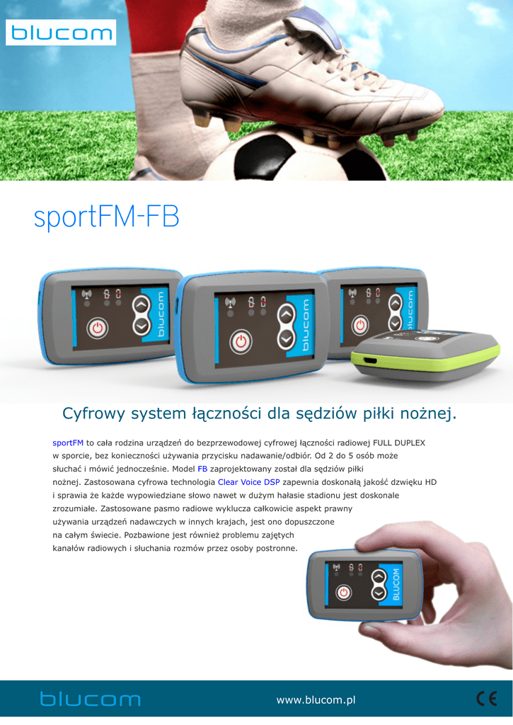 blucom sportFM-FB Cyfrowy system łączności dla sędziów piłki nożnej. sportFM to cała rodzina urządzeń do bezprzewodowej cyfrowej łączności radiowej FULL DUPLEX w sporcie, bez konieczności używania przycisku nadawanie/odbiór. Od 2 do 5 osób może słuchać i mówić jednocześnie. Model FB zaprojektowany został dla sędziów piłki nożnej. Zastosowana cyfrowa technologia Clear Voice DSP zapewnia doskonałą jakość dzwięku HD i sprawia że każde wypowiedziane słowo nawet w dużym hałasie stadionu jest doskonale zrozumiałe. Zastosowane pasmo radiowe wyklucza całkowicie aspekt prawny używania urządzeń nadawczych w innych krajach, jest ono dopuszczone na całym świecie. Pozbawione jest również problemu zajętych kanałów radiowych i słuchania rozmów przez osoby postronne. blucom www.blucom.pl sportFM-FB stan baterii ładowanie status połączenia gniazdo słuchawka,mikrofon ładowanie głośność + włą/wył głośność - Dane techniczne Od 2-5 osób może mówić i słuchać jednoczesnie. Clear Voice DSP, cyfrowe wyciszanie hałasu otoczenia. Czas pracy na baterii do 6 godz. Czas Ładowania ok. 3 godz. Zasięg do 300 m Wymiary 80 x 50 x 27 mm Dla sędziego technicznego przycisk wyciszania mikrofonu BL7- nowy zestaw słuchawkowy Zestaw słuchawkowy dla arbitra technicznego BL7-PTT z przyciskiem mikrofonu blucom ul. Wolności 24. 58-260 Bielawa. Polska tel. +48 74 30 70 413 www.blucom.pl Made in Poland sportFM-FB BLUCOM BLUCOM Zasięg systemu. Urządzenie master (zielony) komunikuje się z 1 do 4 ( niebieskie) slaves . S S 30 m 00 m 3 M BLUCOM 0 00 S 30 m 0 S BLUCOM m BLUCOM 3 600 m BLUCOM S BLUCOM S BLUCOM Arbiter techniczny (zielony) BLUCOM S M BLUCOM S Opcjonalne 5 urządzenie do nagrywania rozmów blucom ul. Wolności 24. 58-260 Bielawa. Polska tel. +48 74 30 70 413 www.blucom.pl Made in Poland